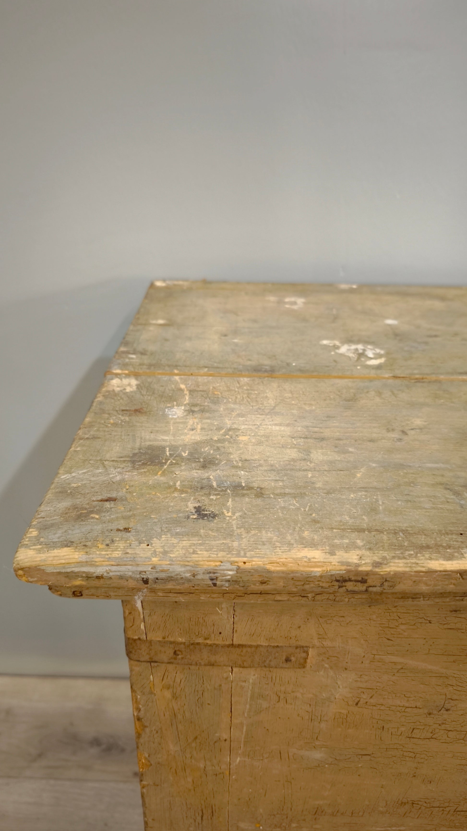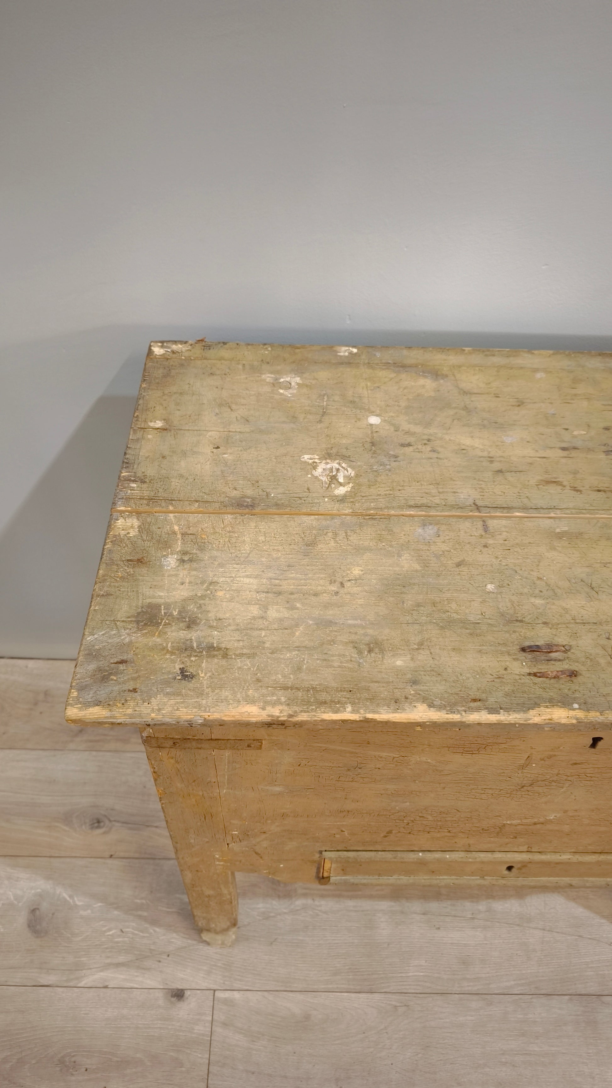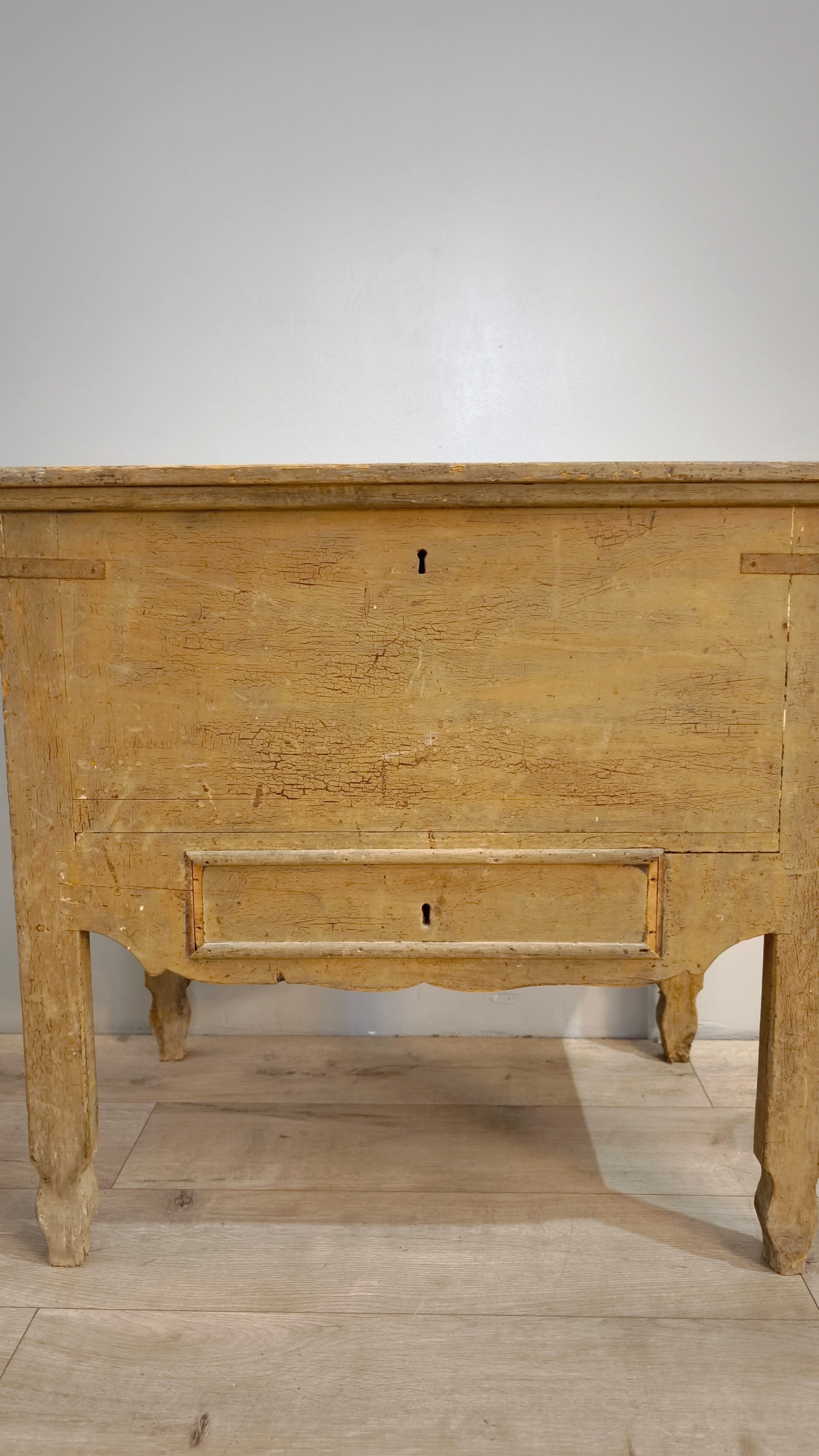Piccola madia rustica beige in legno con cassetto.