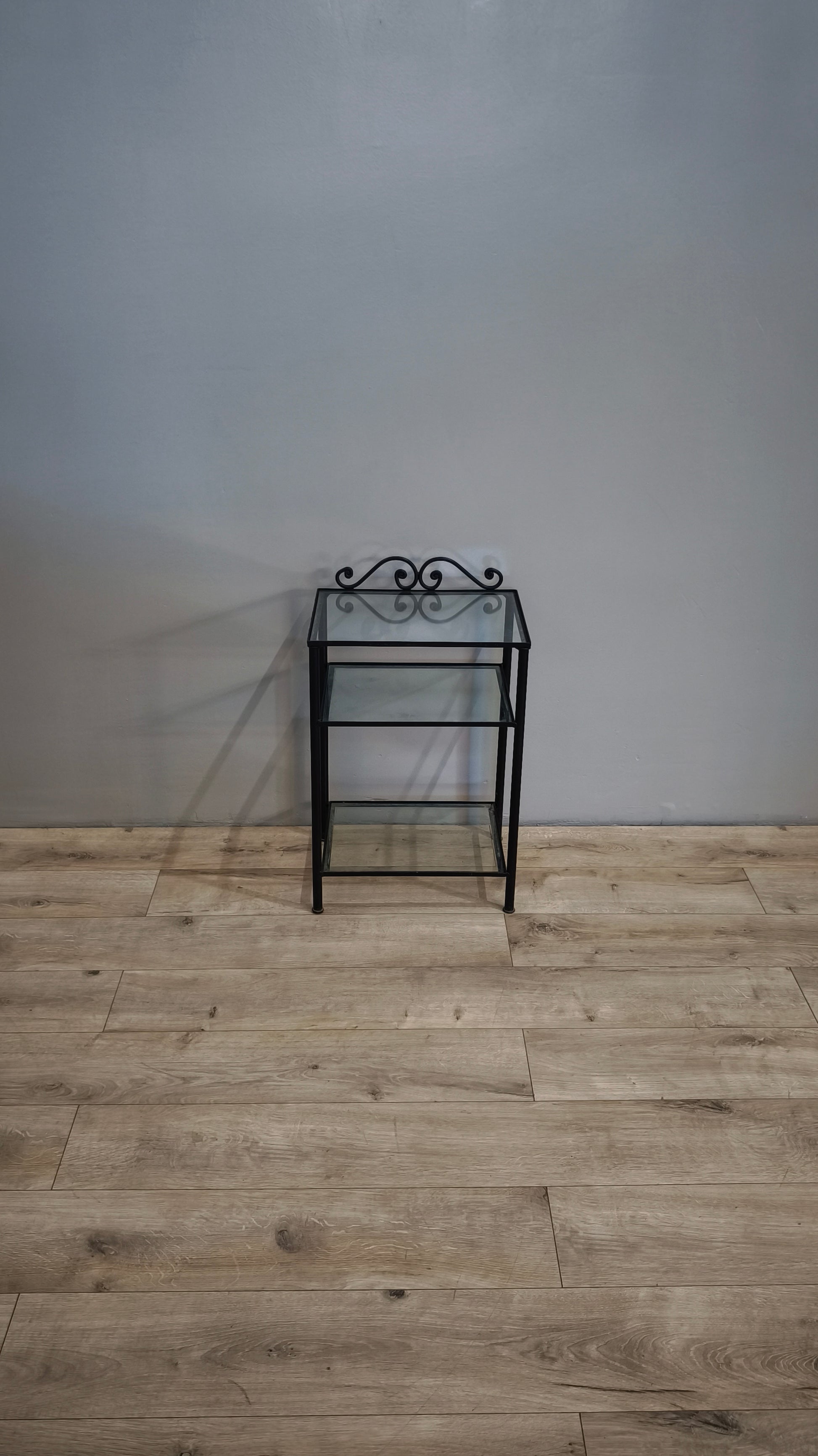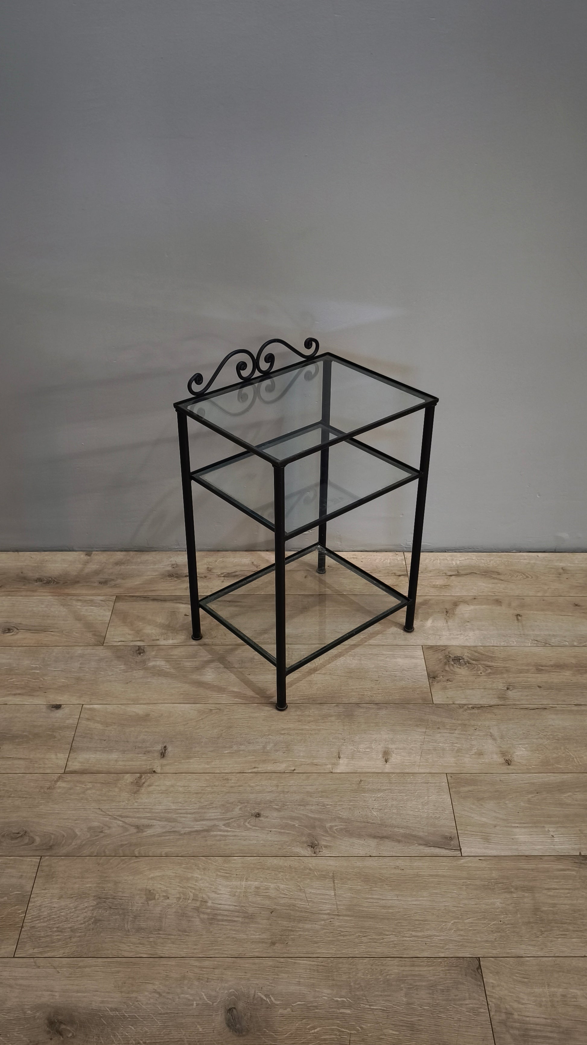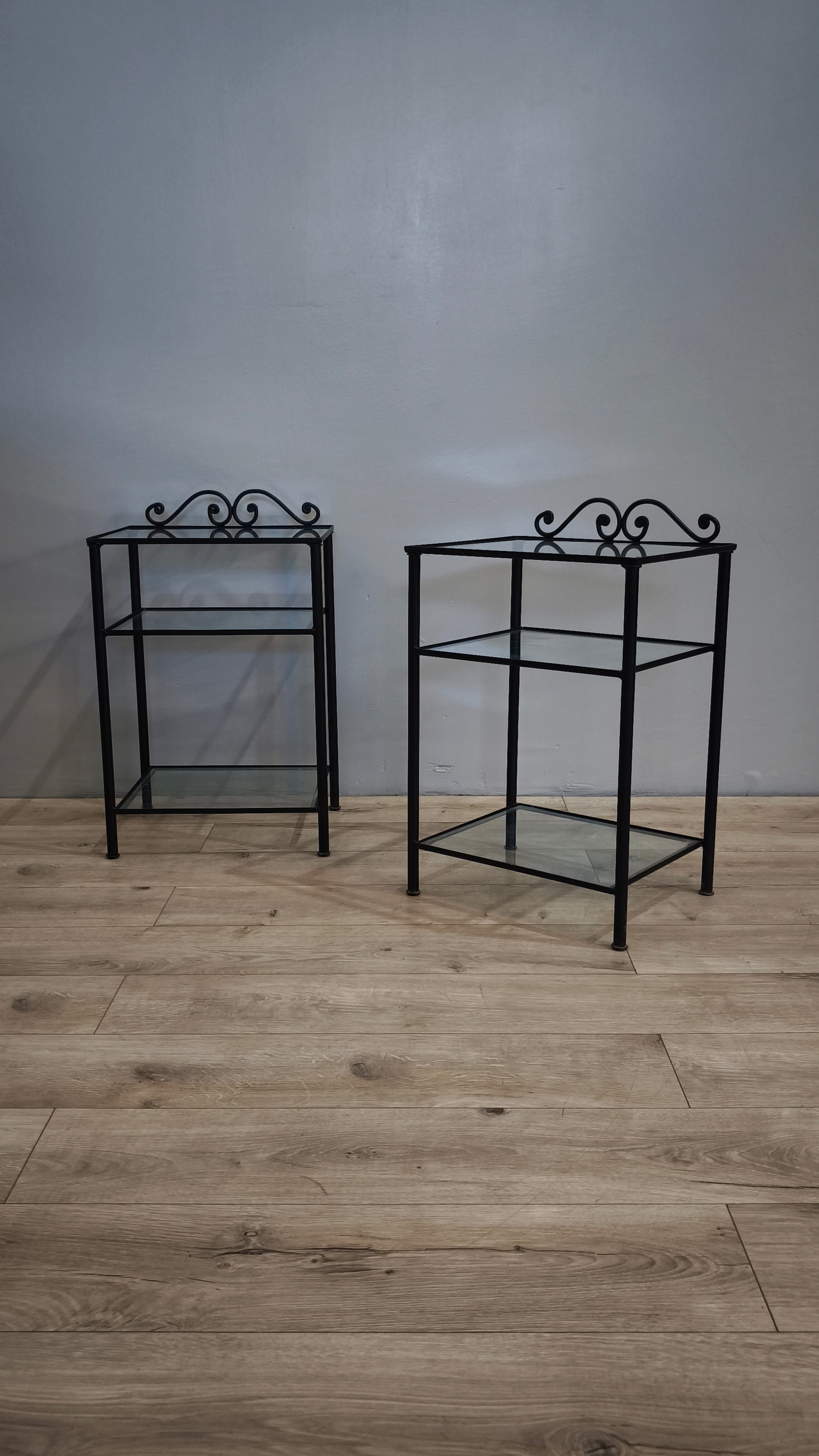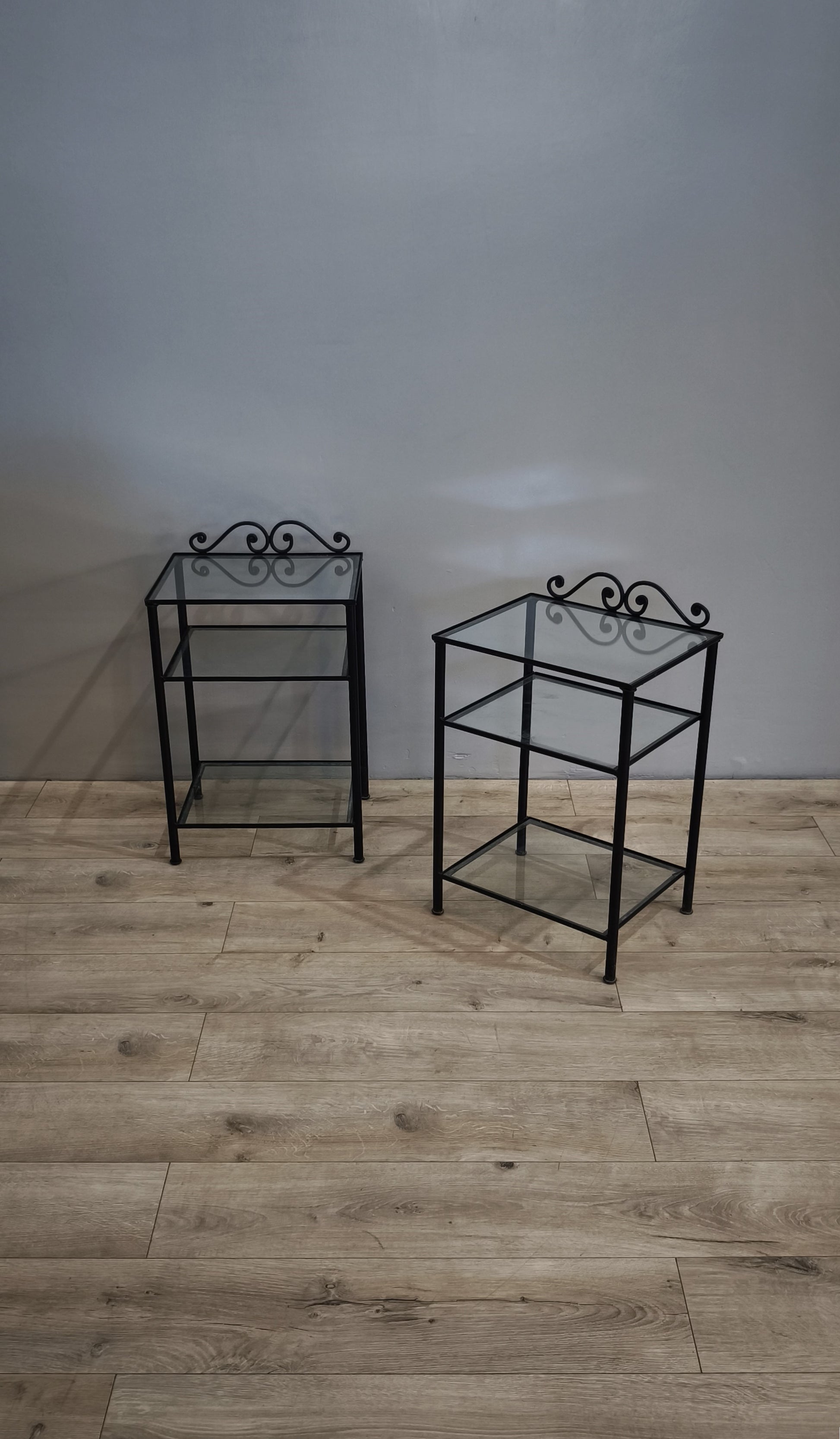 Coppia di comodini in ferro e vetro composti da tre ripiani