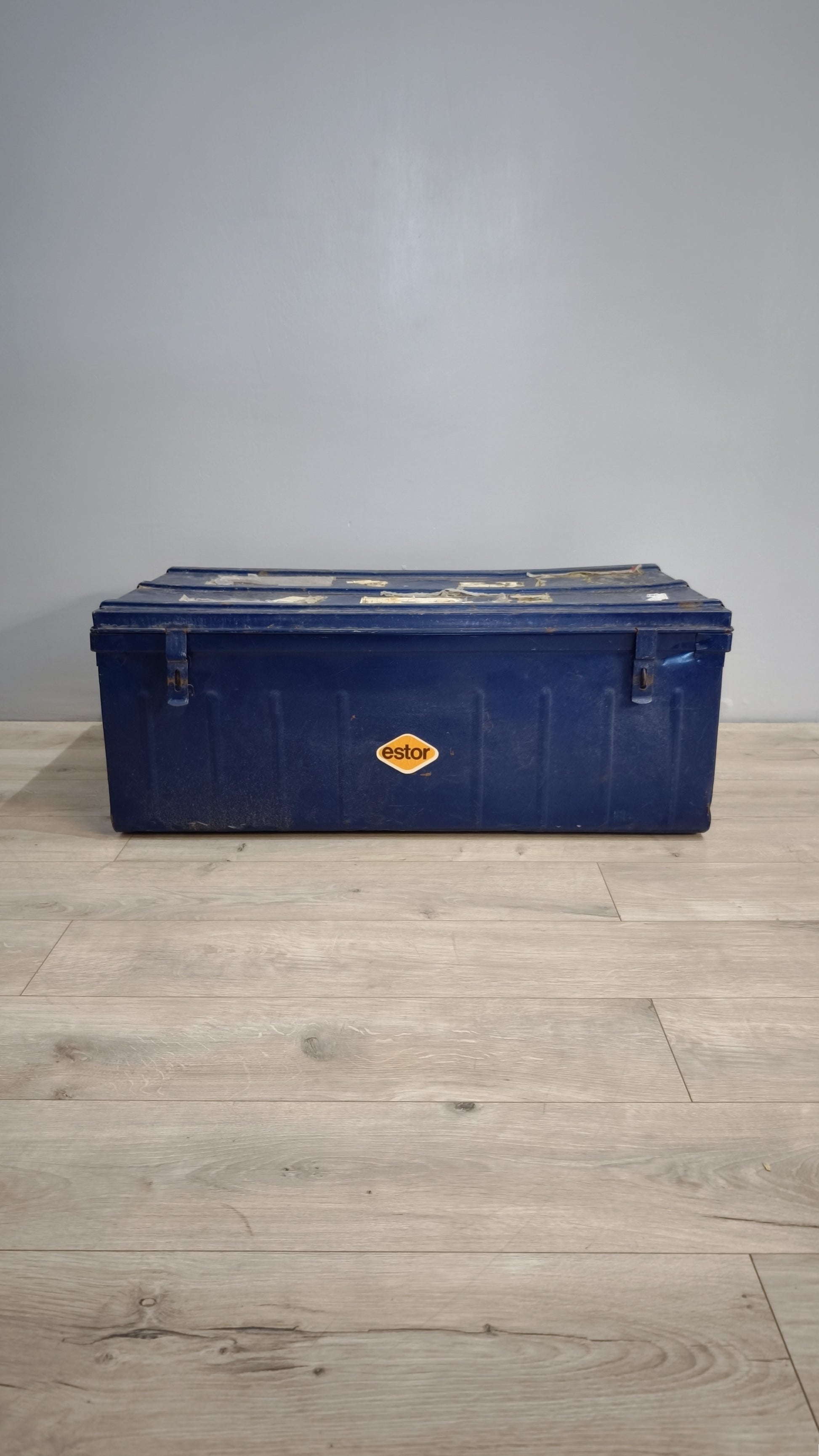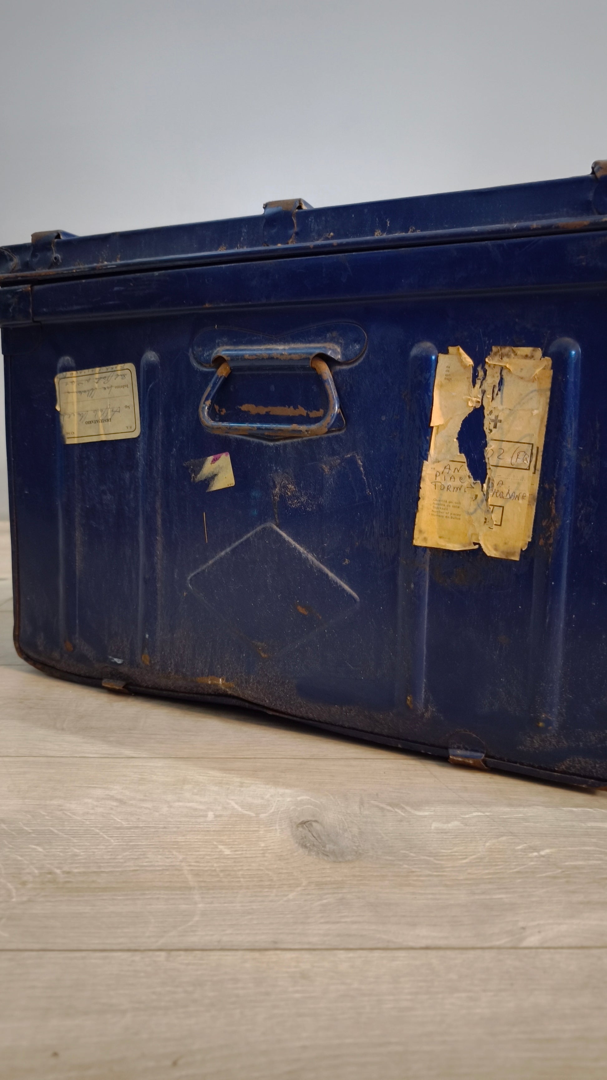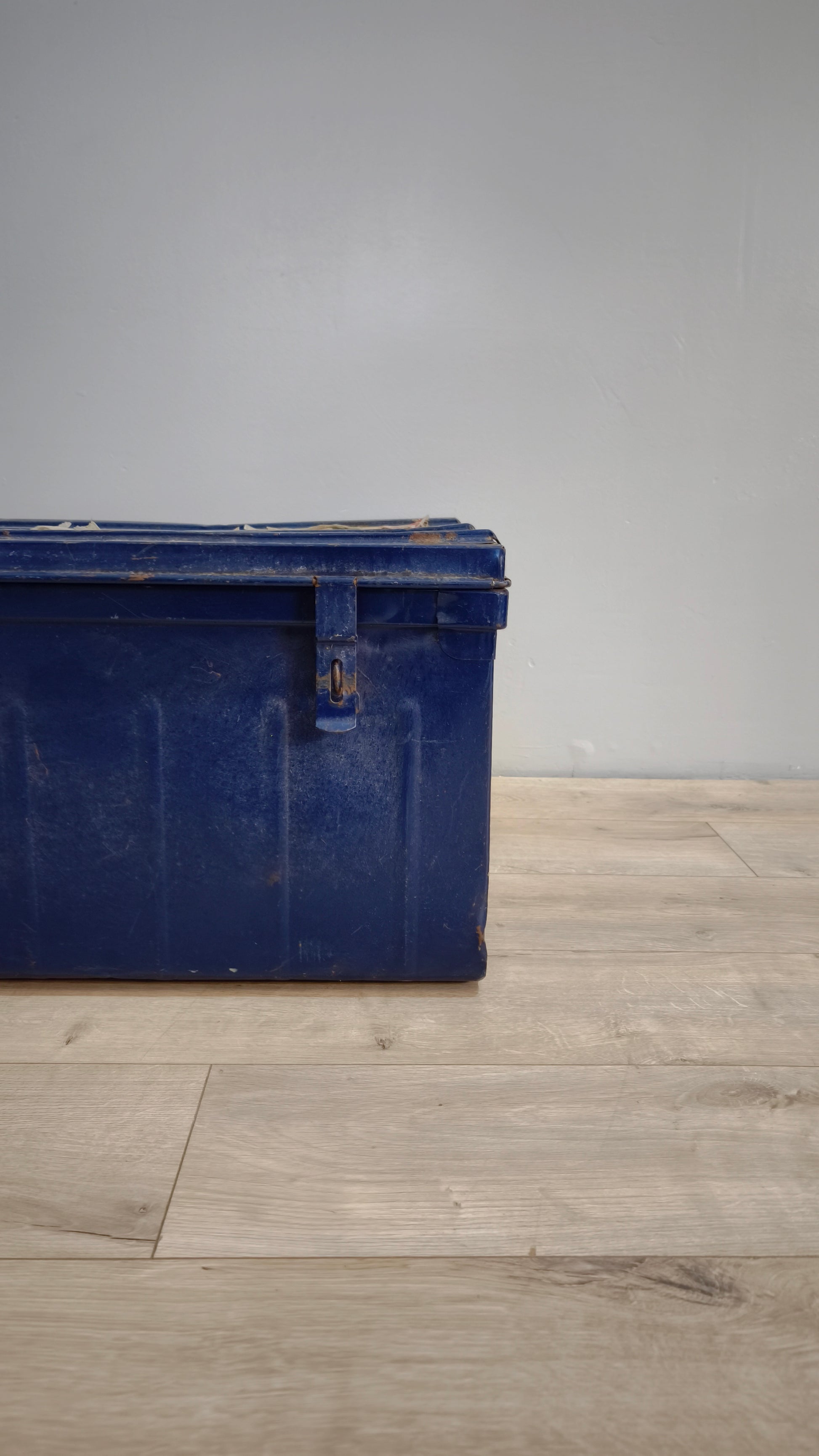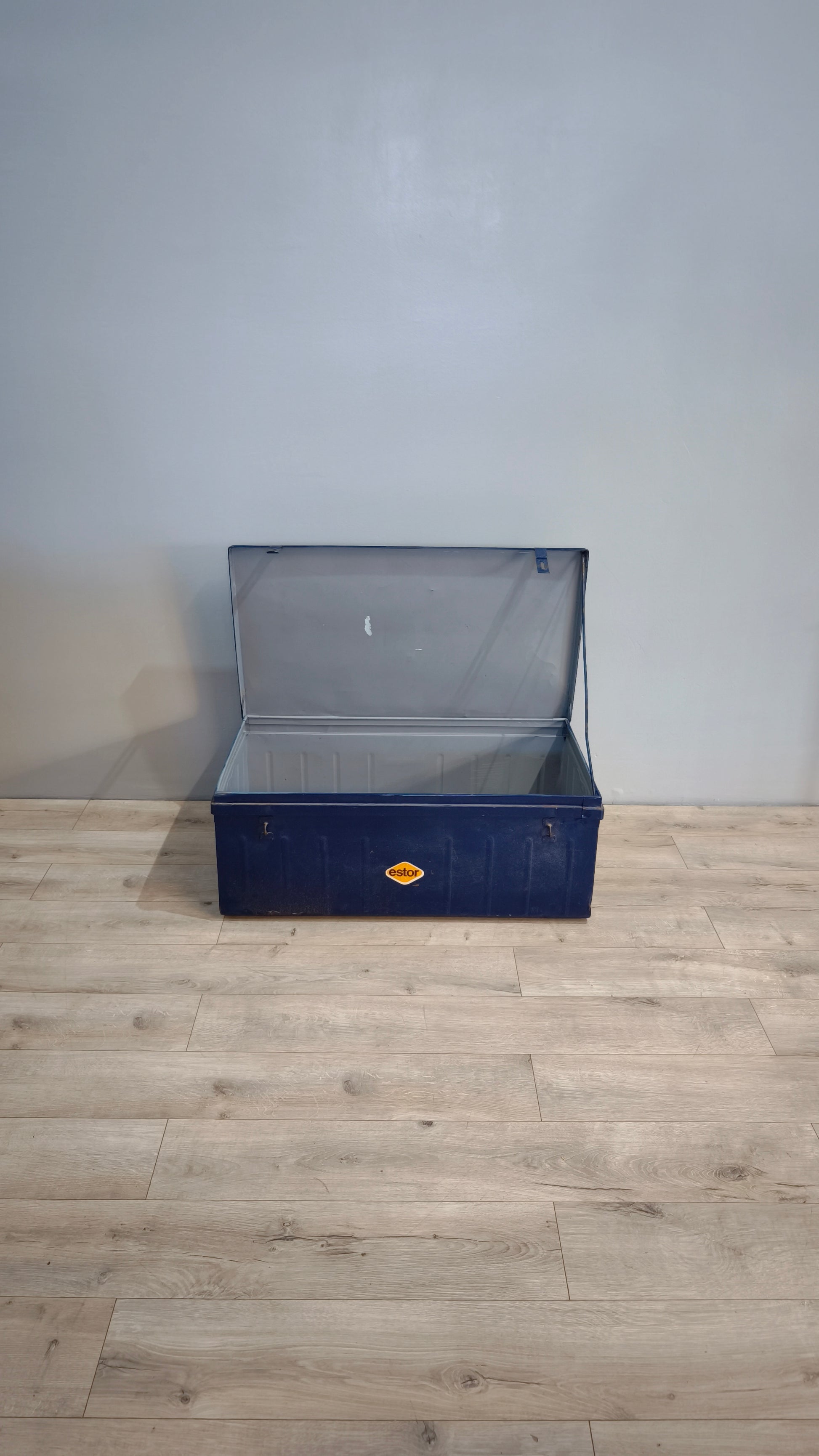 Bauletto blu metallo con interno grigio, lateralmente sono presenti due maniglie, frontalmente troviamo due serrature