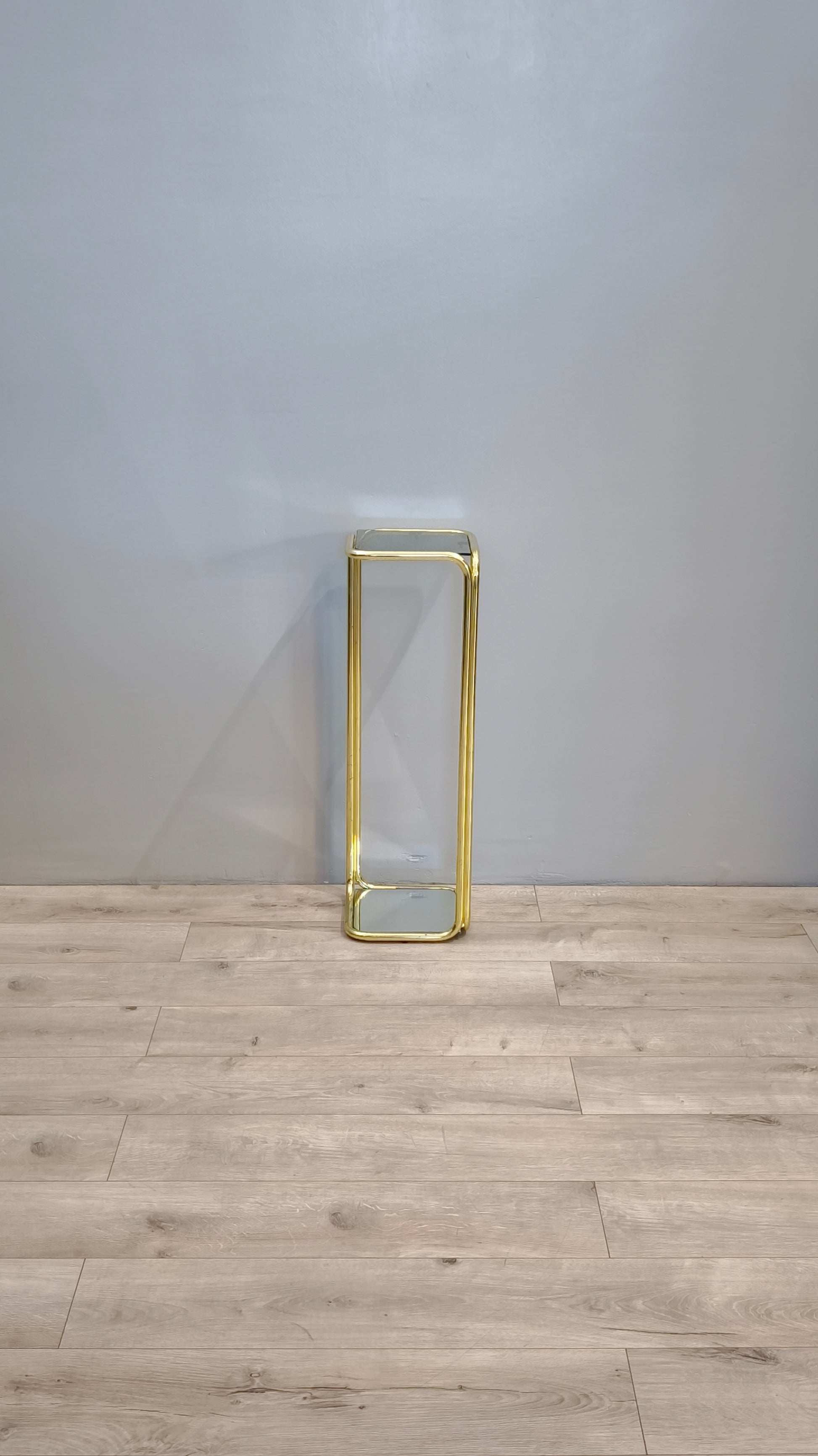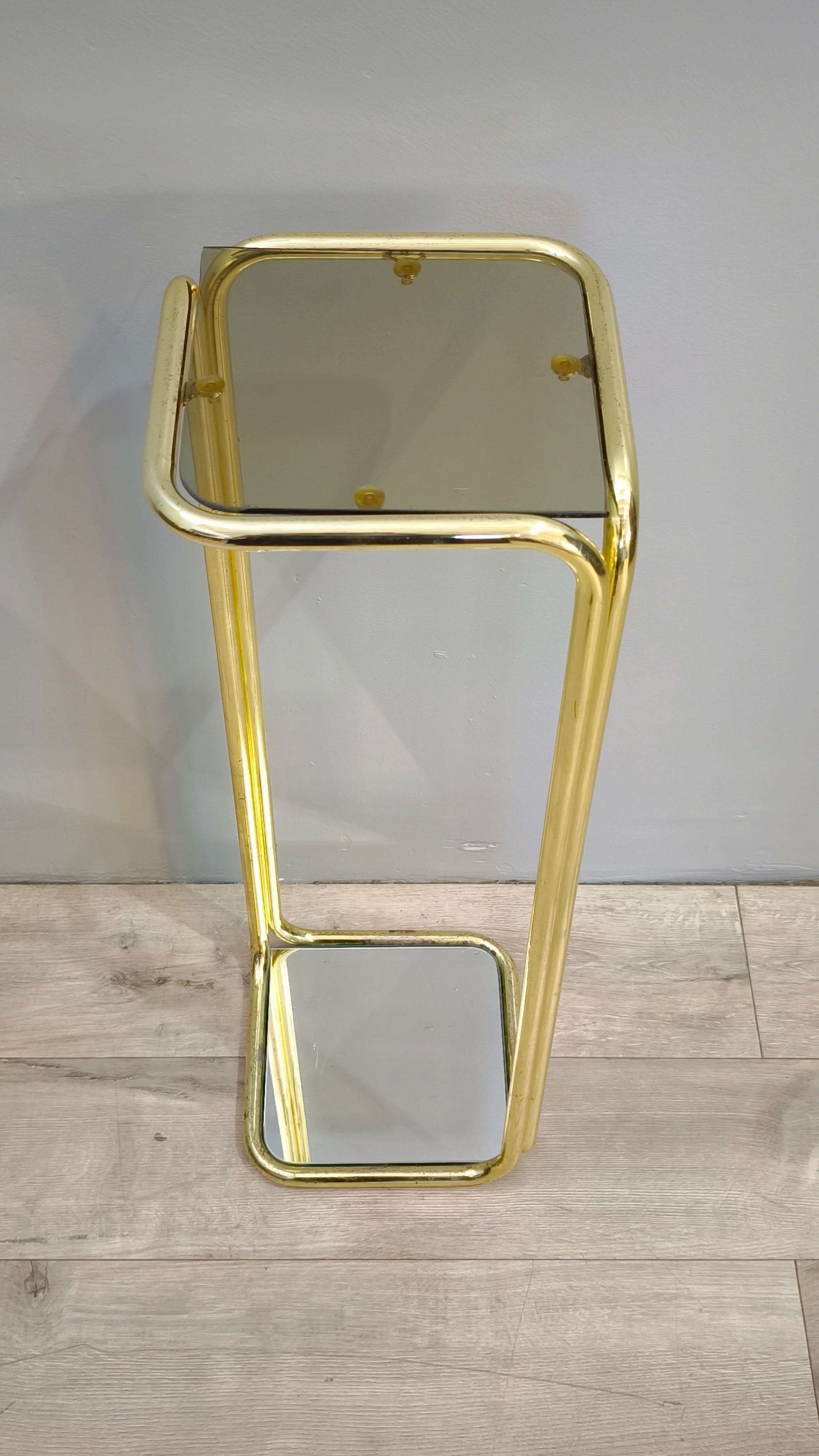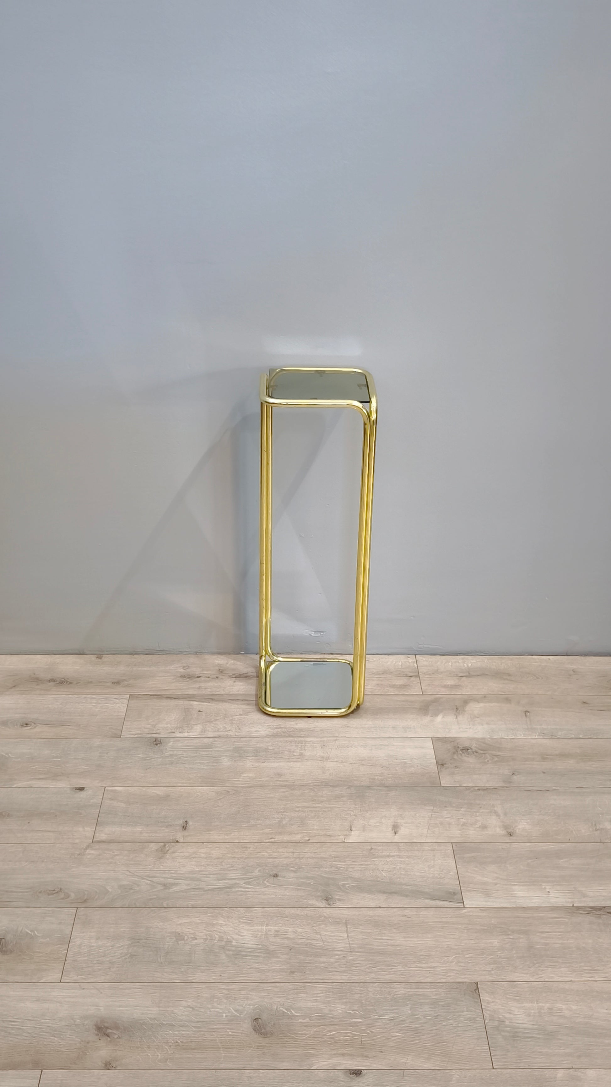Alzata in metallo dorato, presenta due ripiani, uno in vetro ed il secondo a specchio.