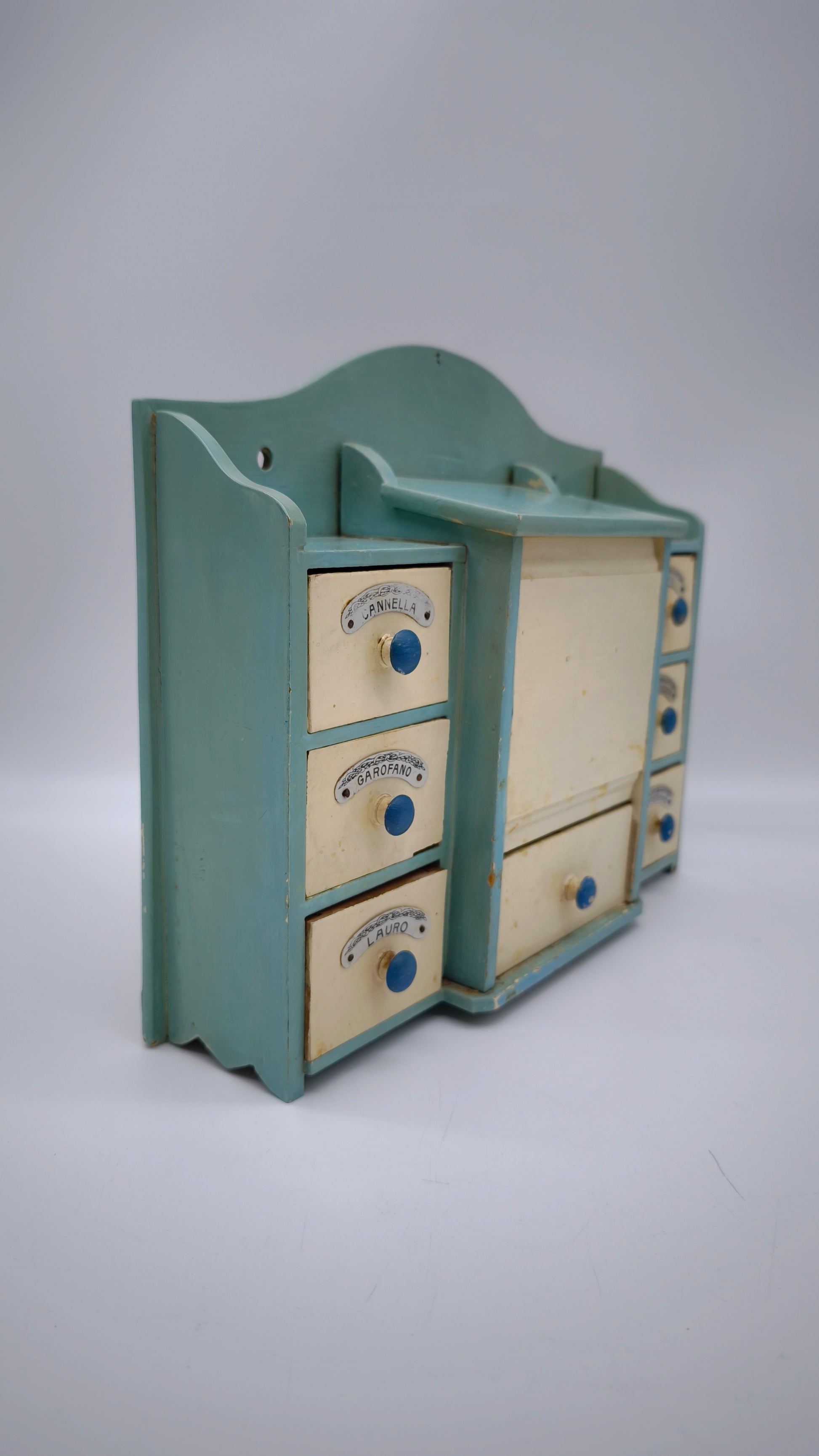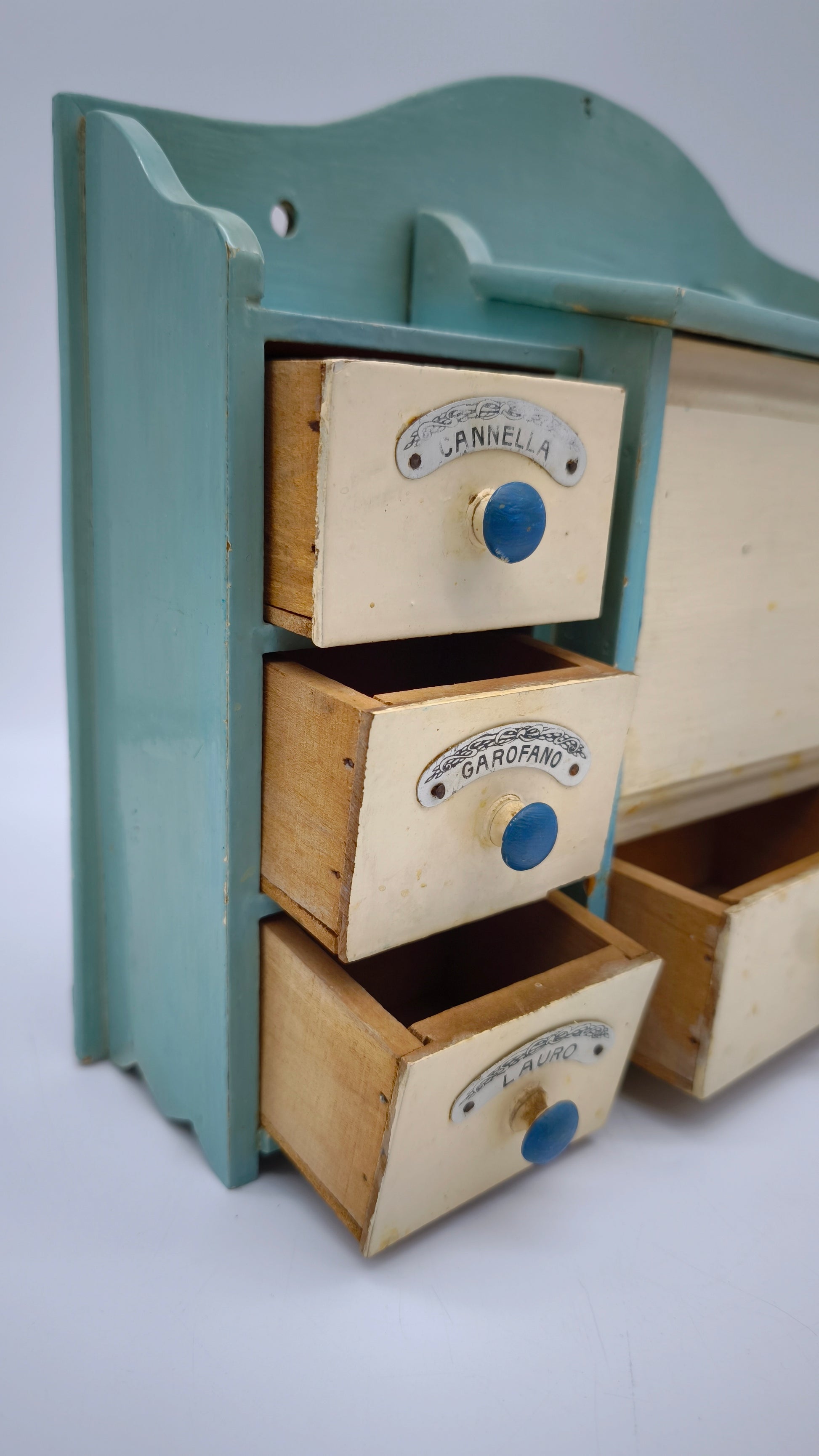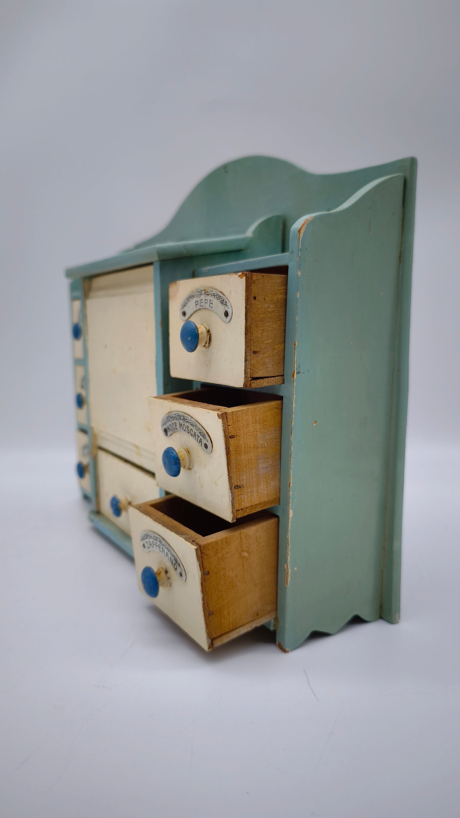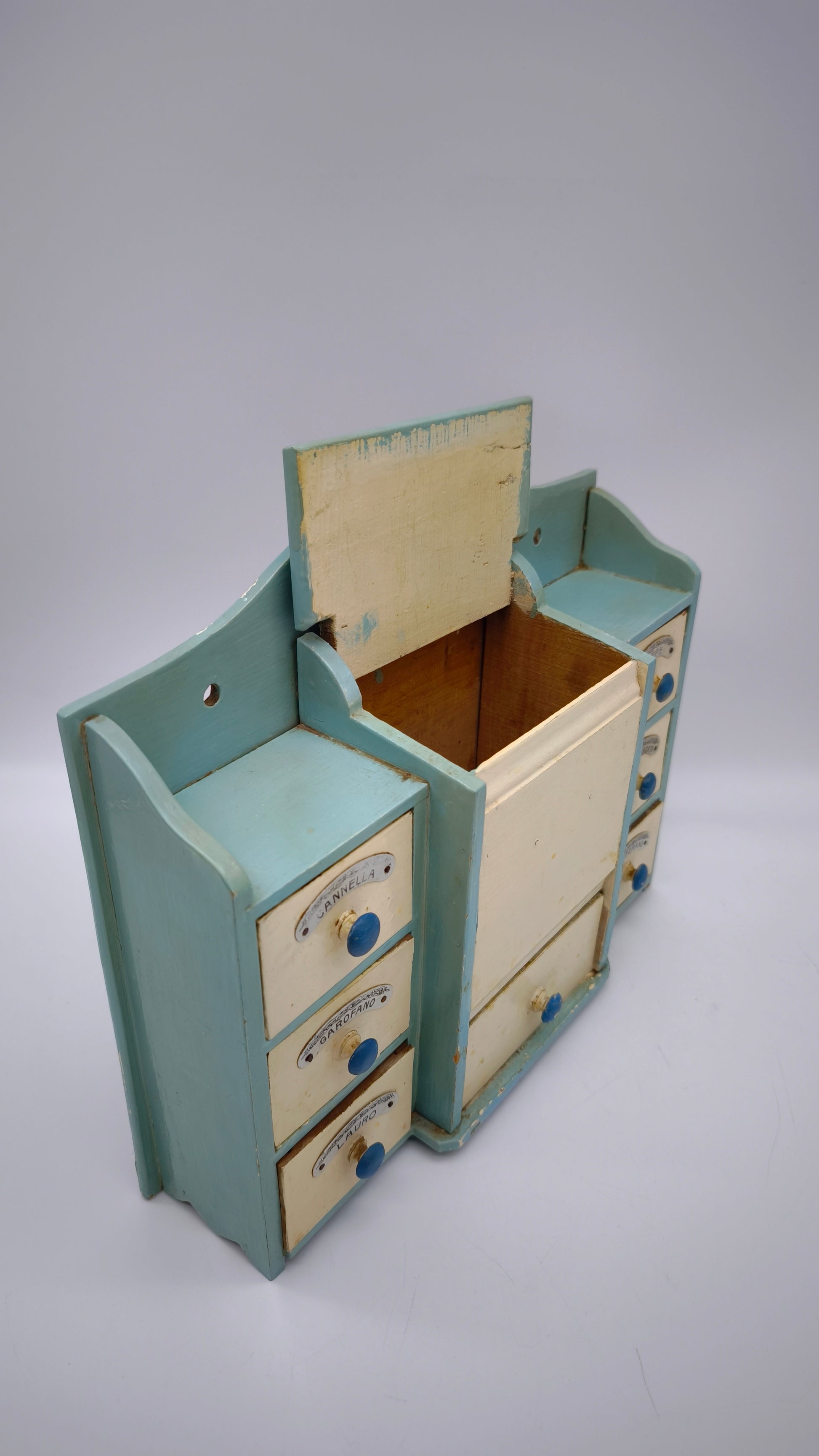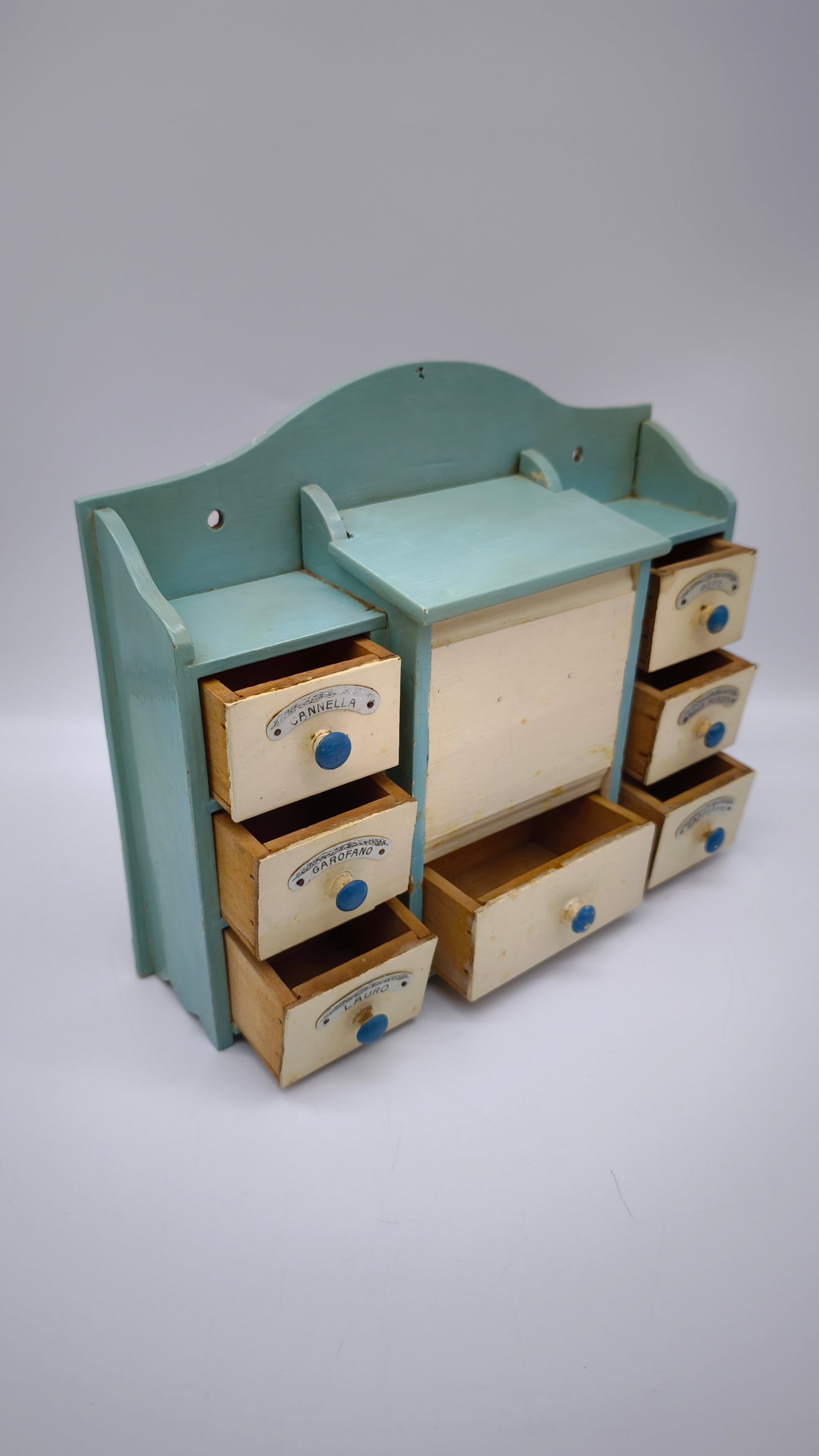 Porta spezie vintage in legno verniciato composto da 7 cassetti