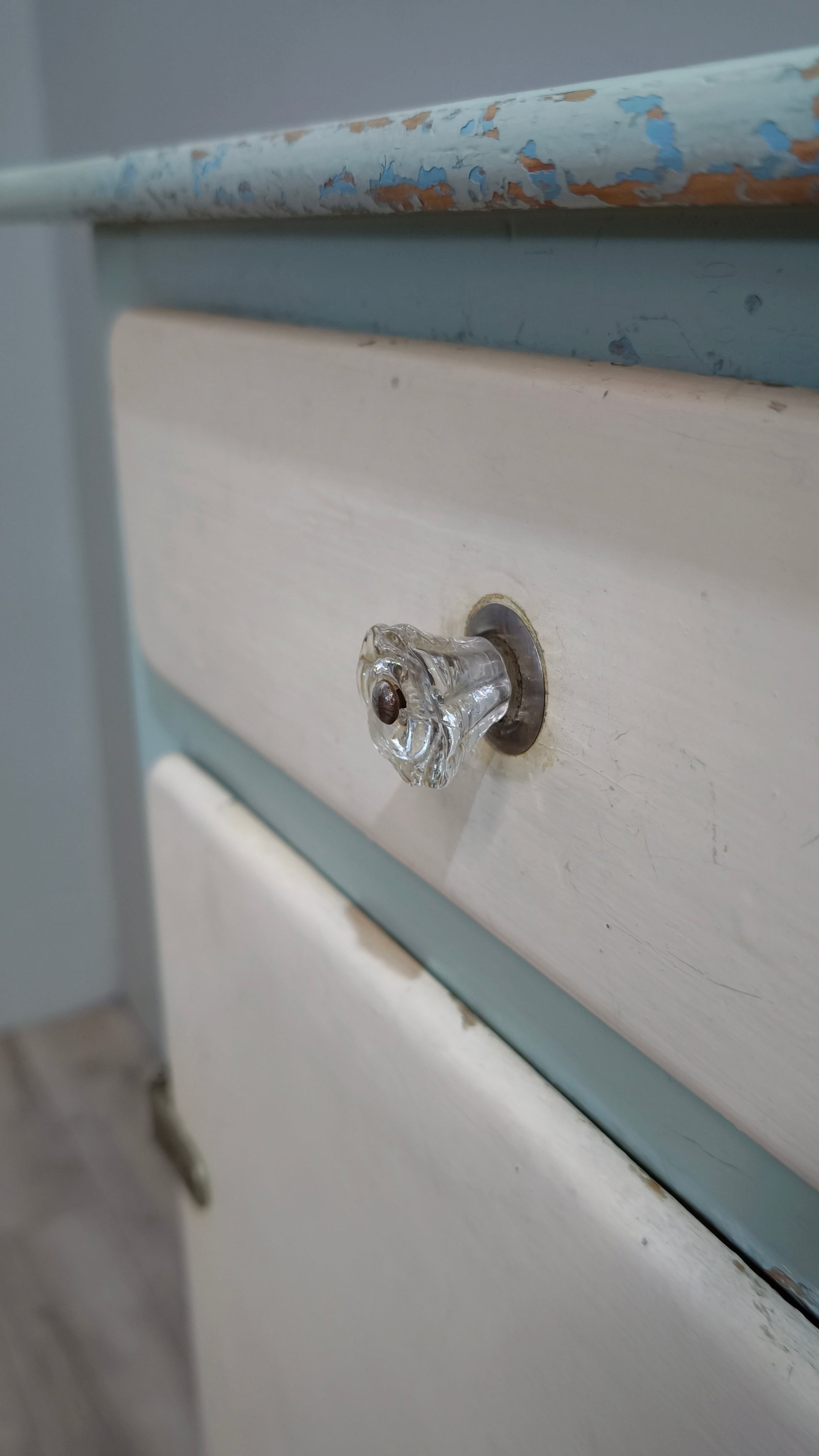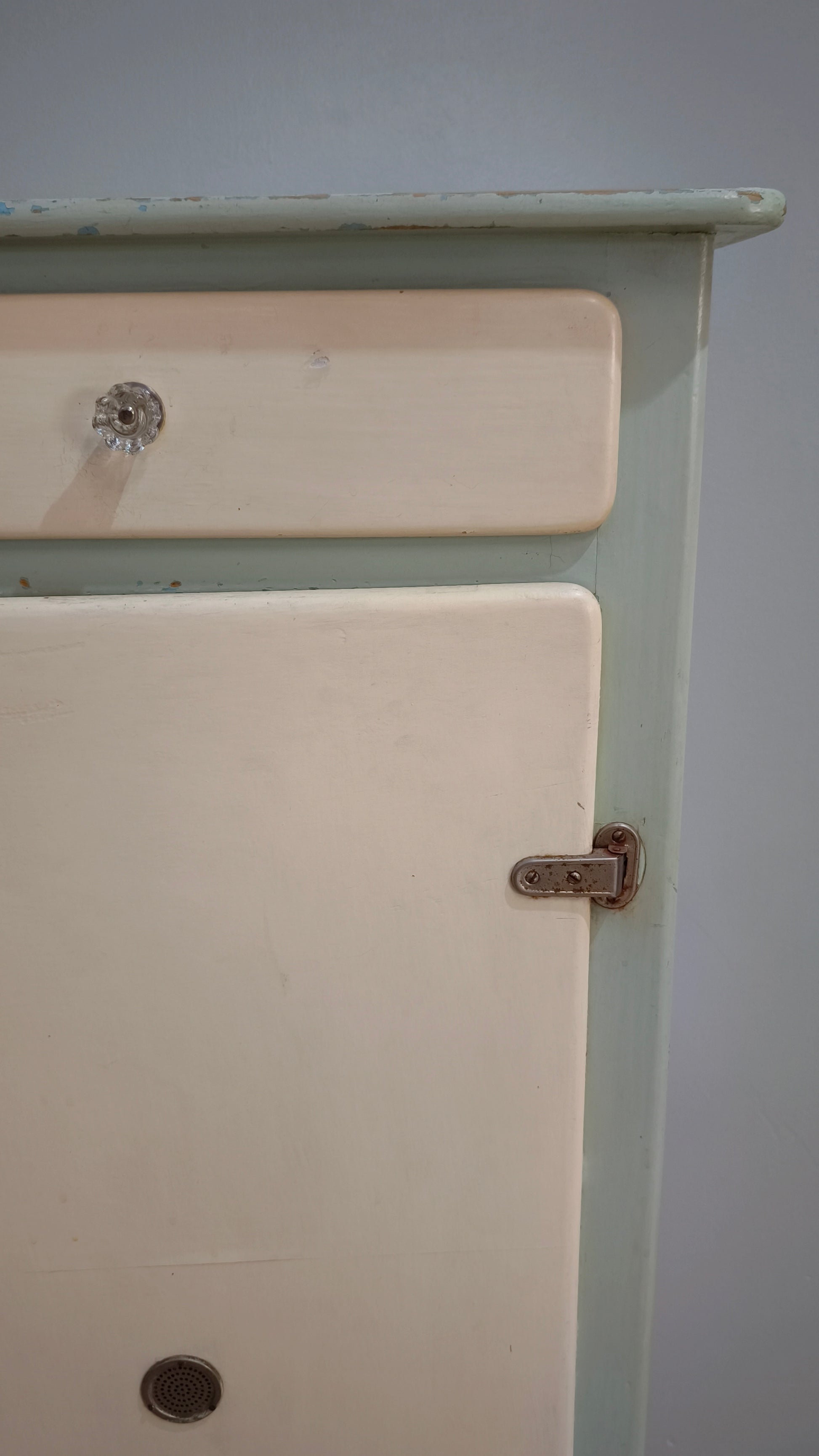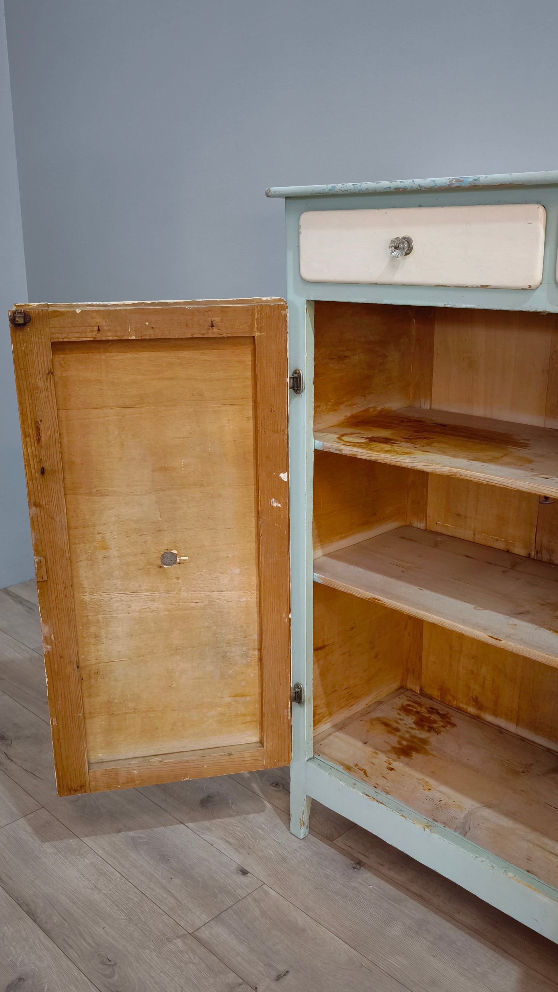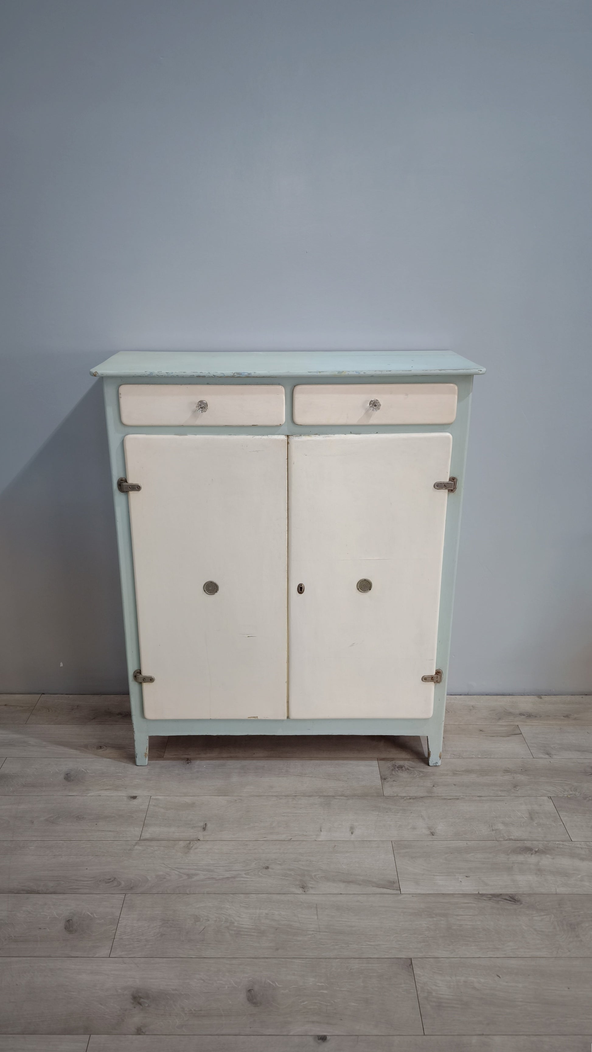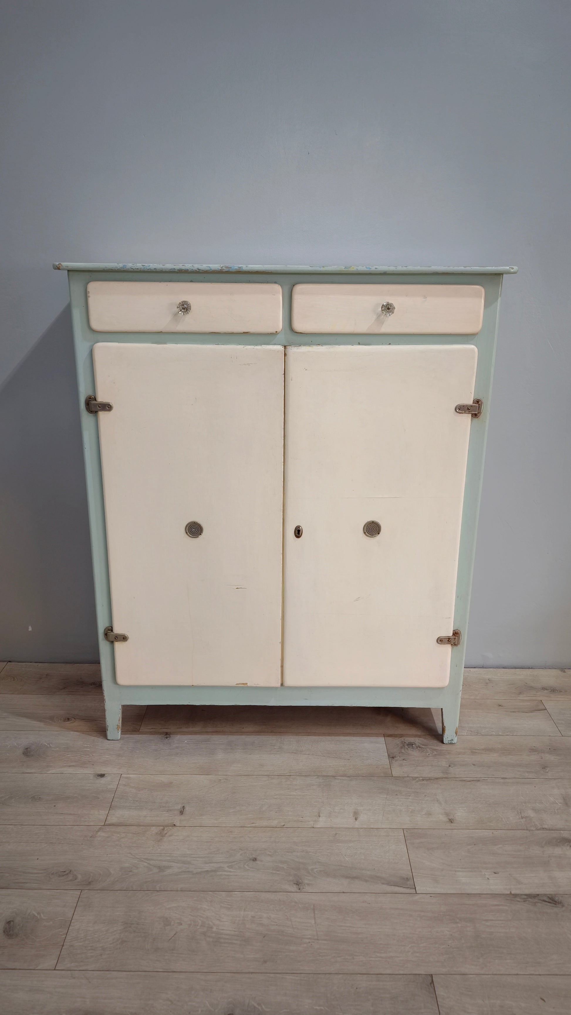 Credenza vintage alta in legno composta da due cassetti e due sportelli, i pomelli dei cassetti sono in vetro