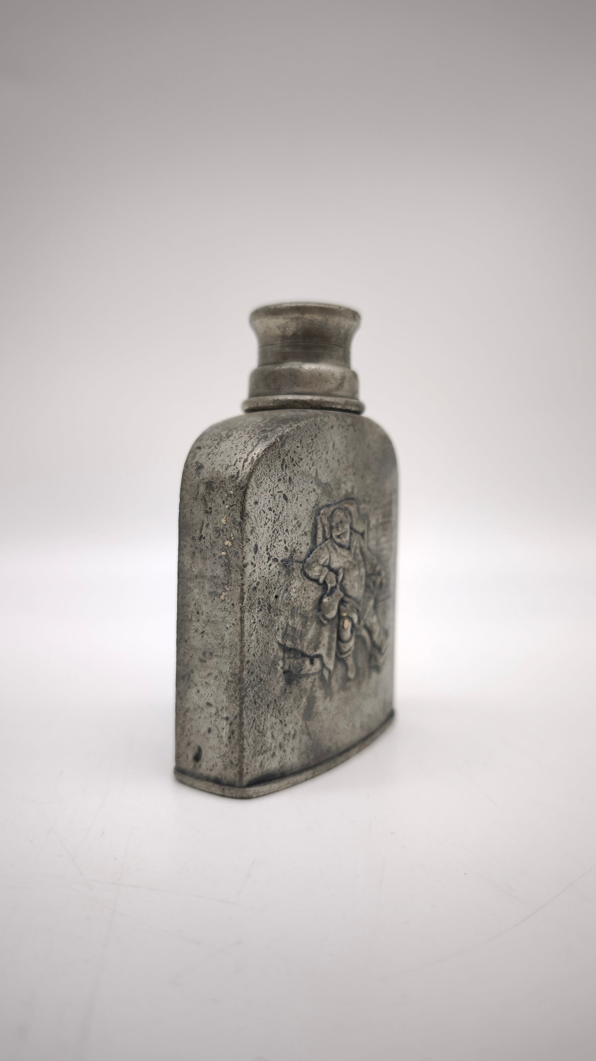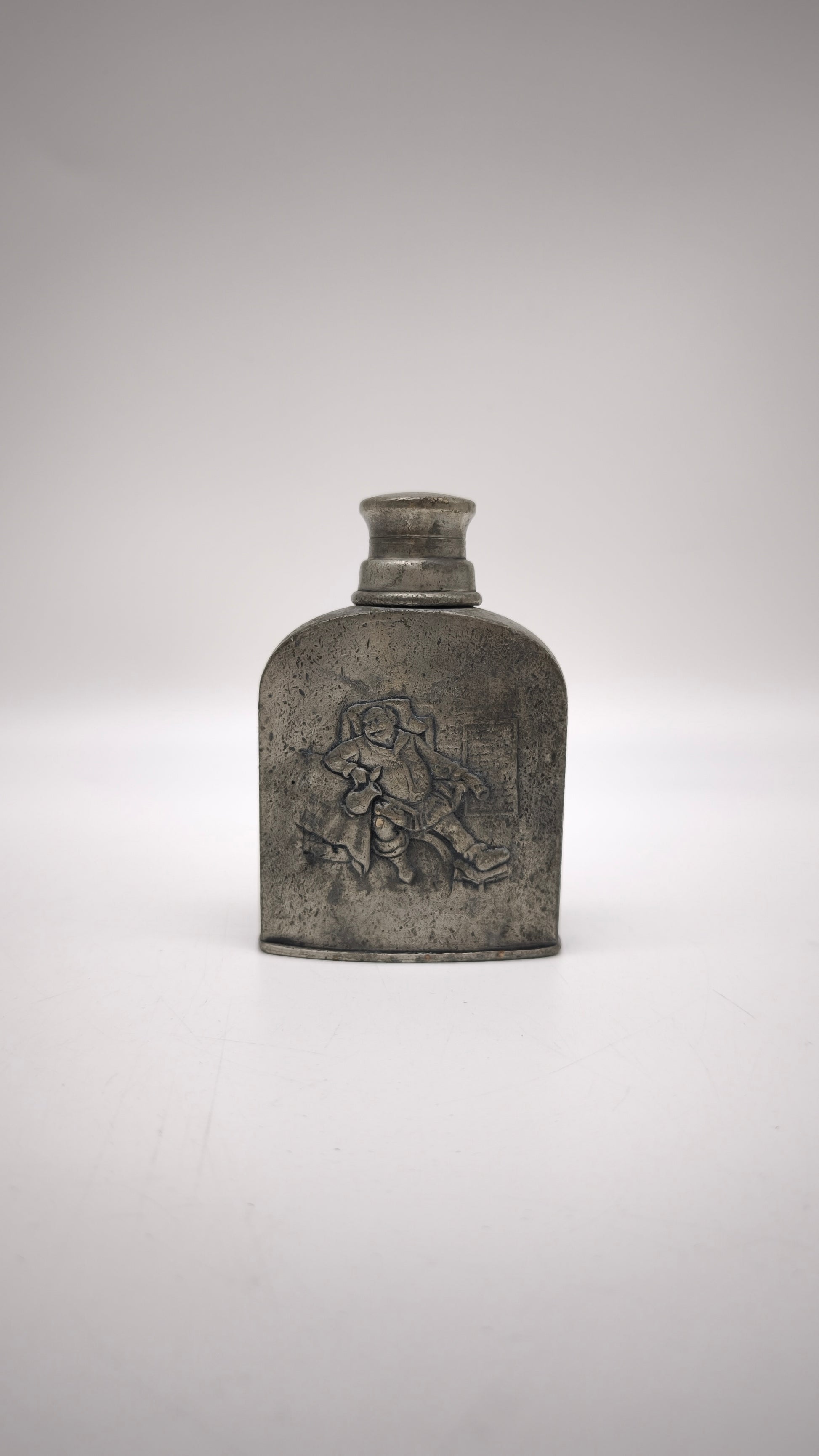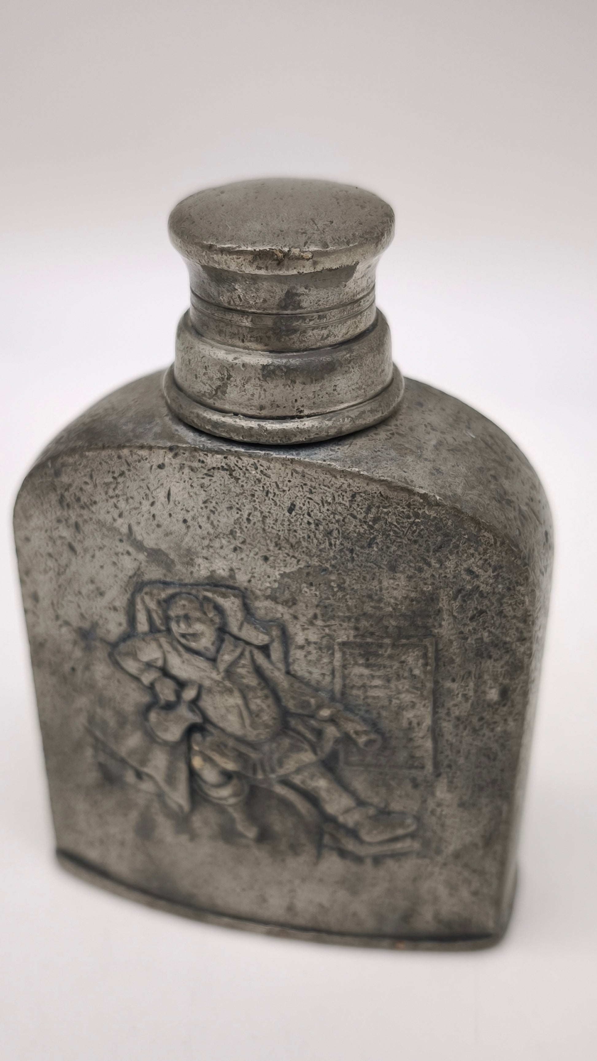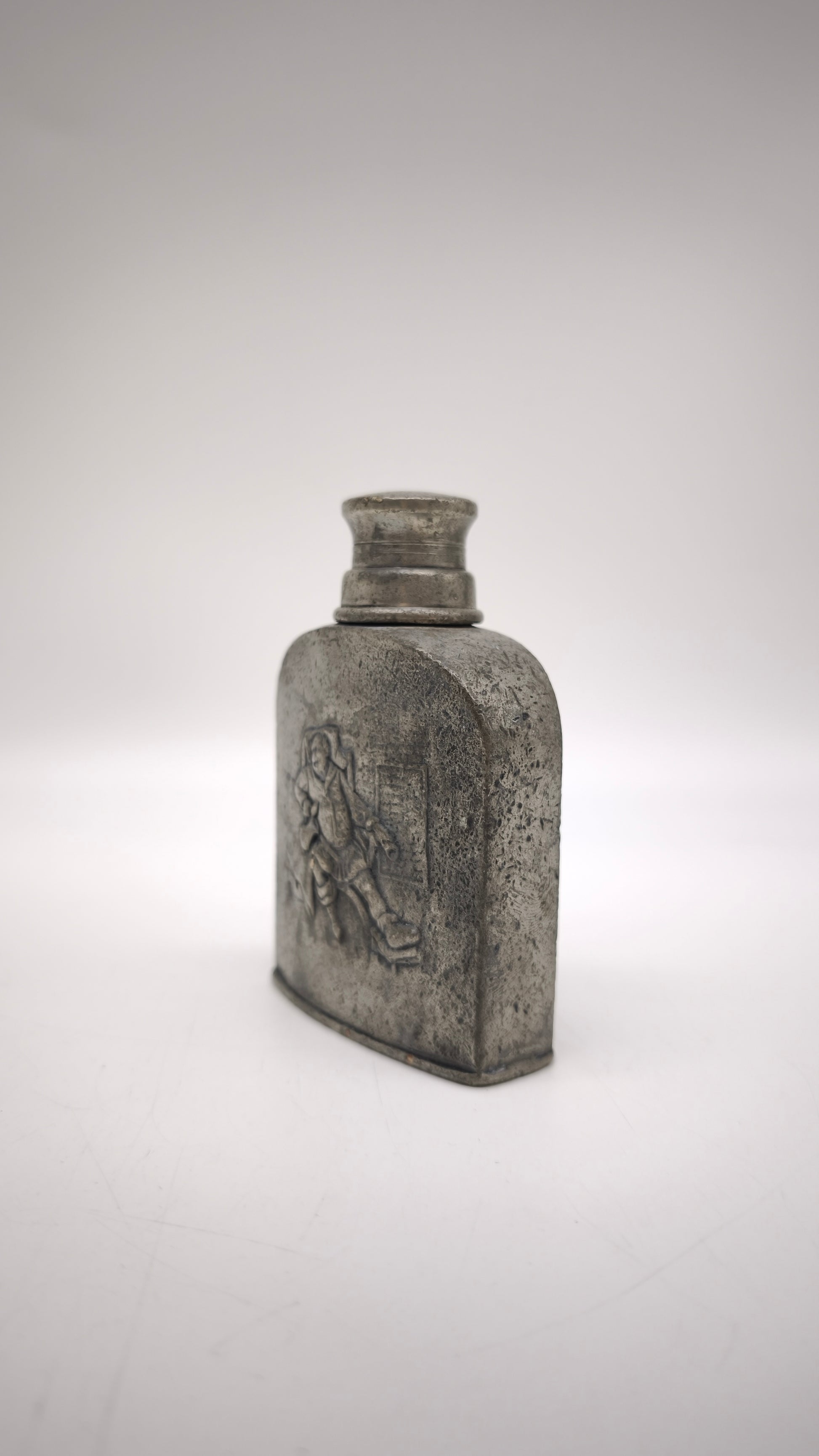 Bottiglia in peltro con tappo a vite, presenta decorazione in rilievo nella parte frontale