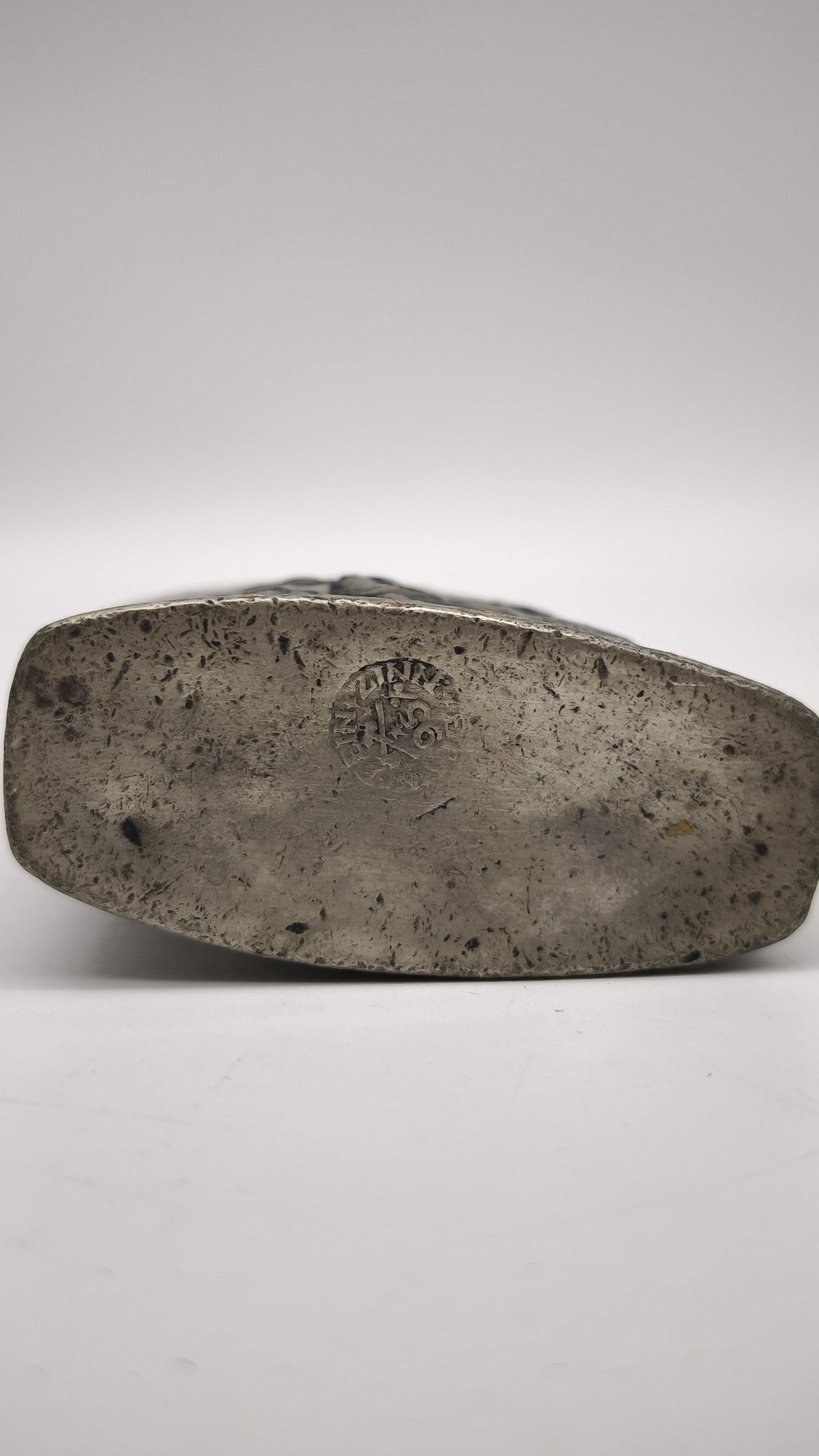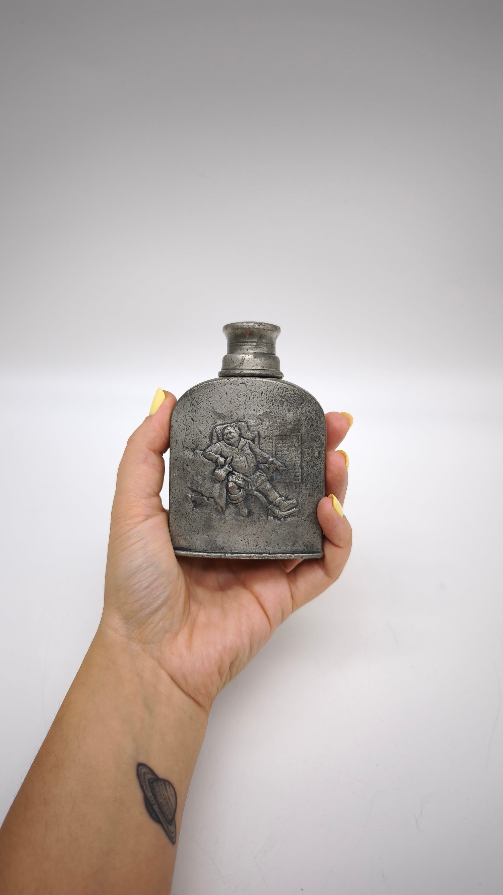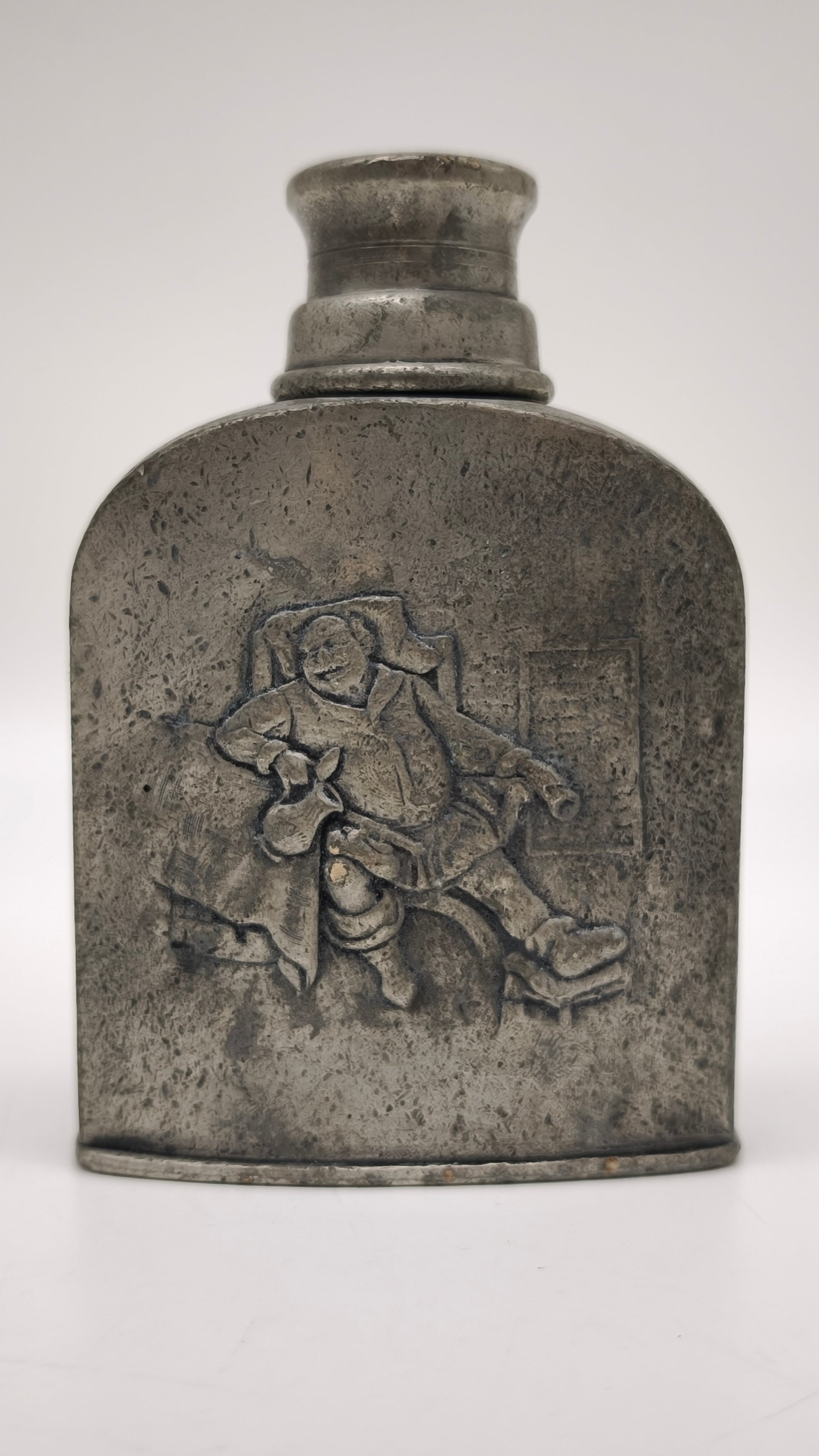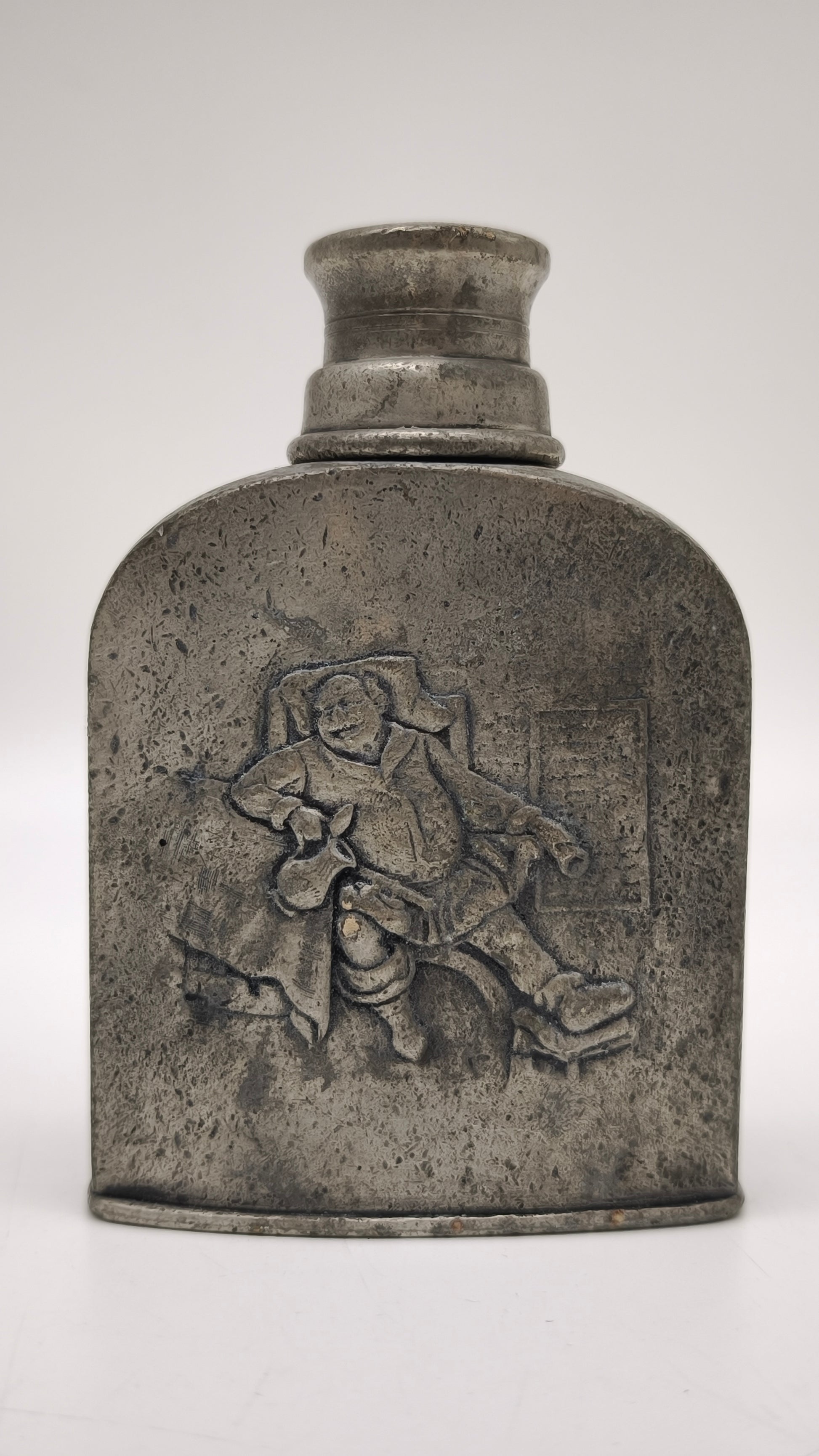 Bottiglia in peltro con tappo a vite, presenta decorazione in rilievo nella parte frontale