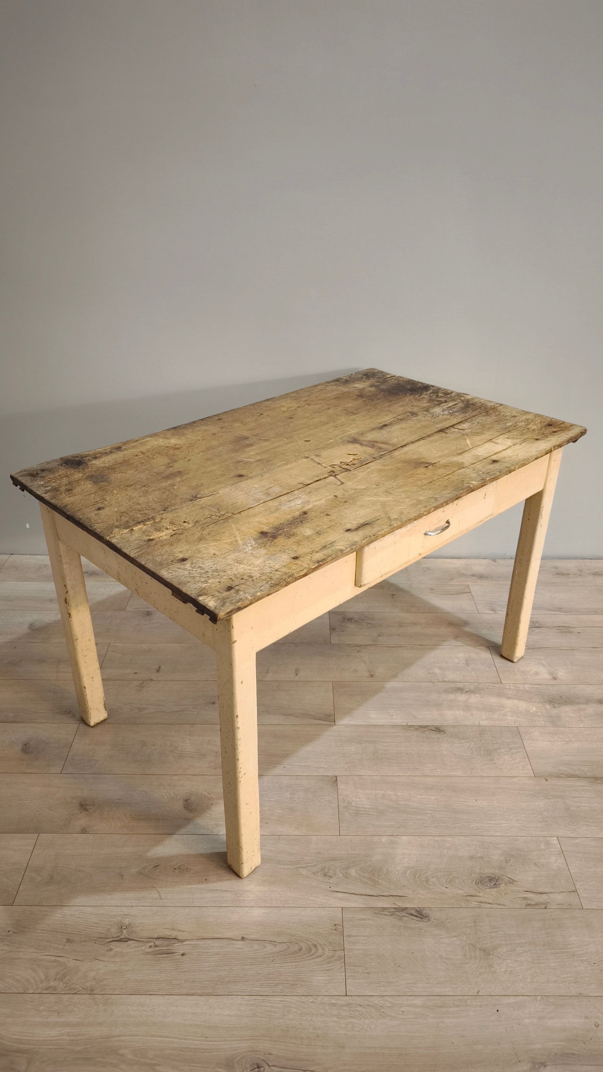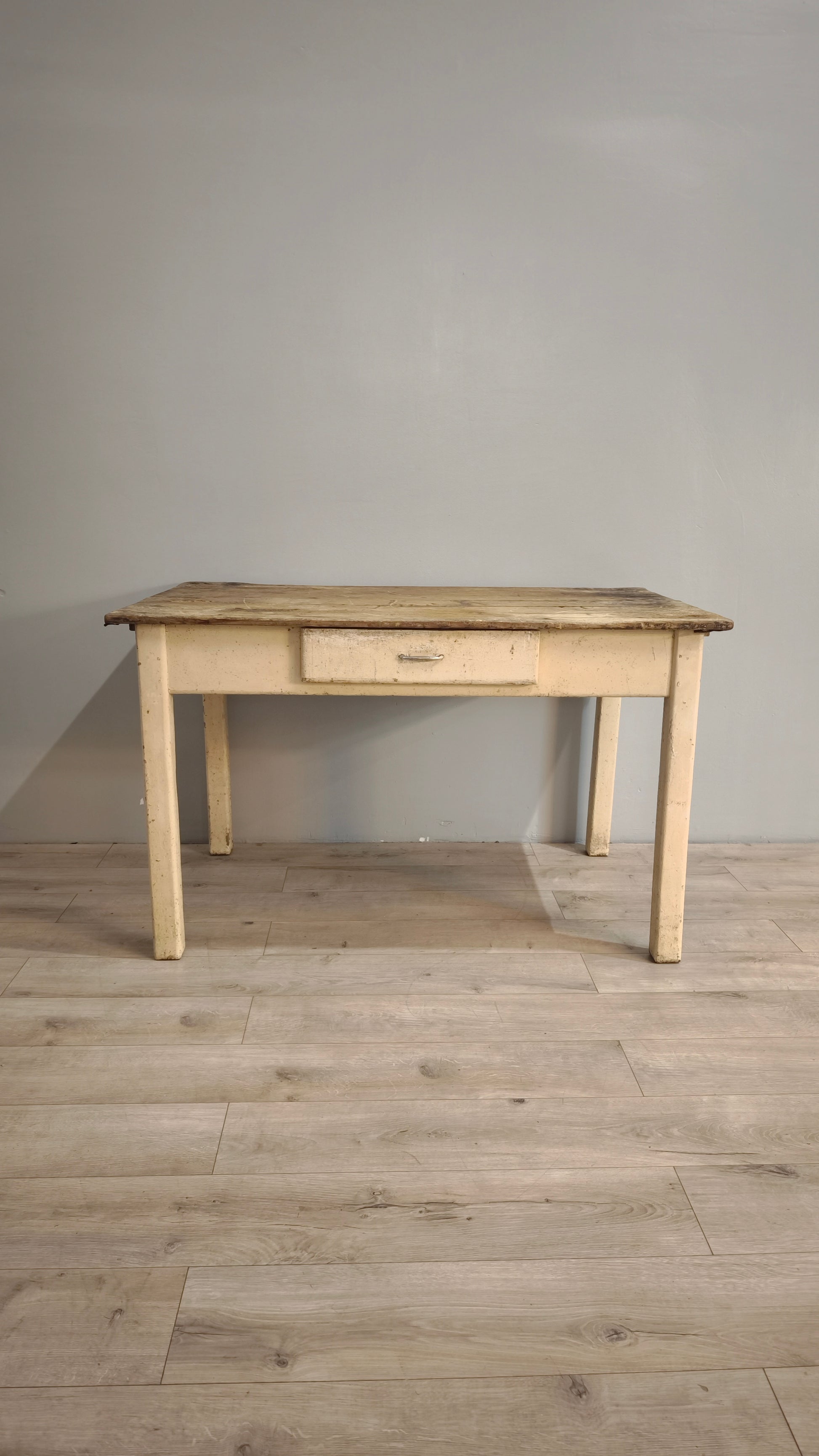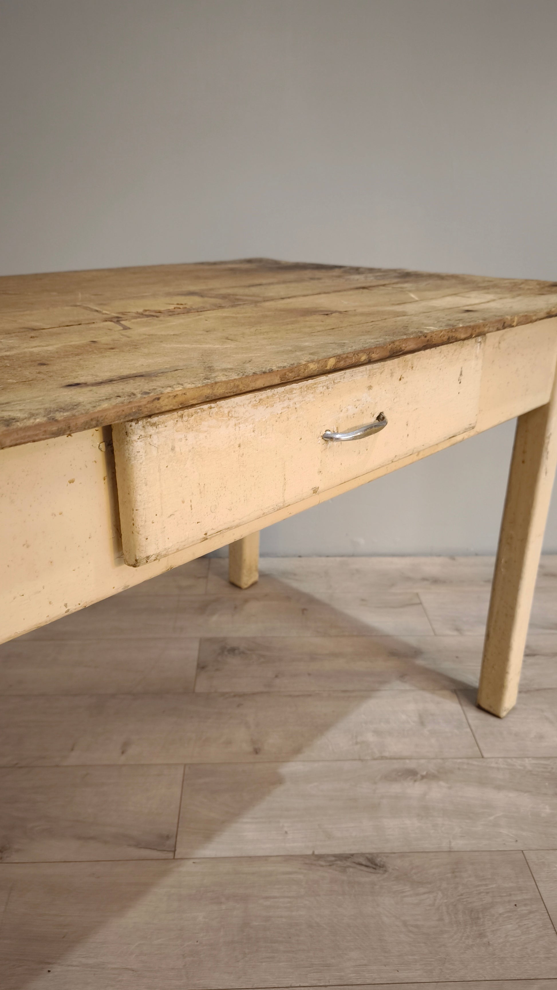 Tavolo con base color panna e piano in legno grezzo, è presente un cassetto frontale
