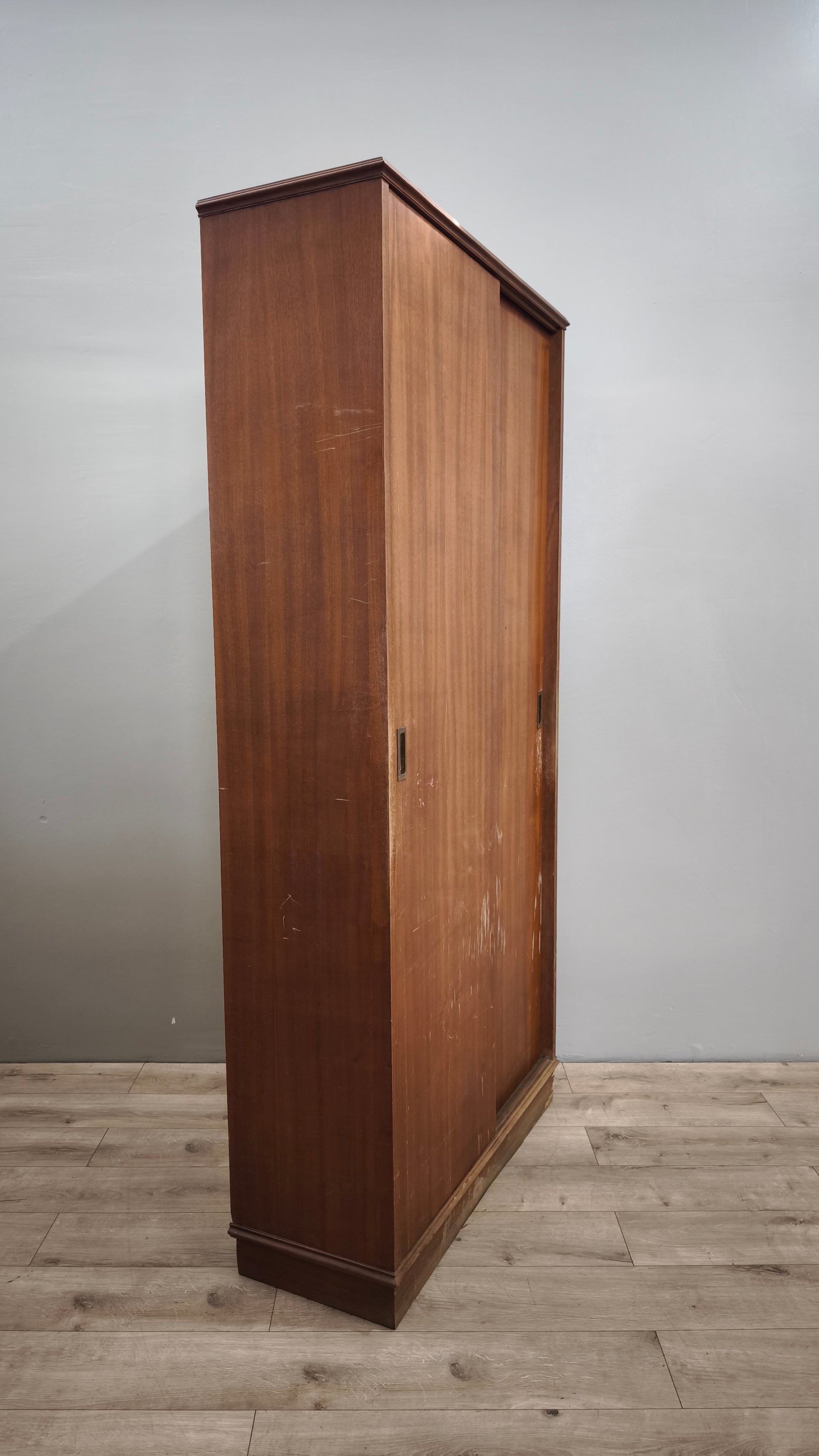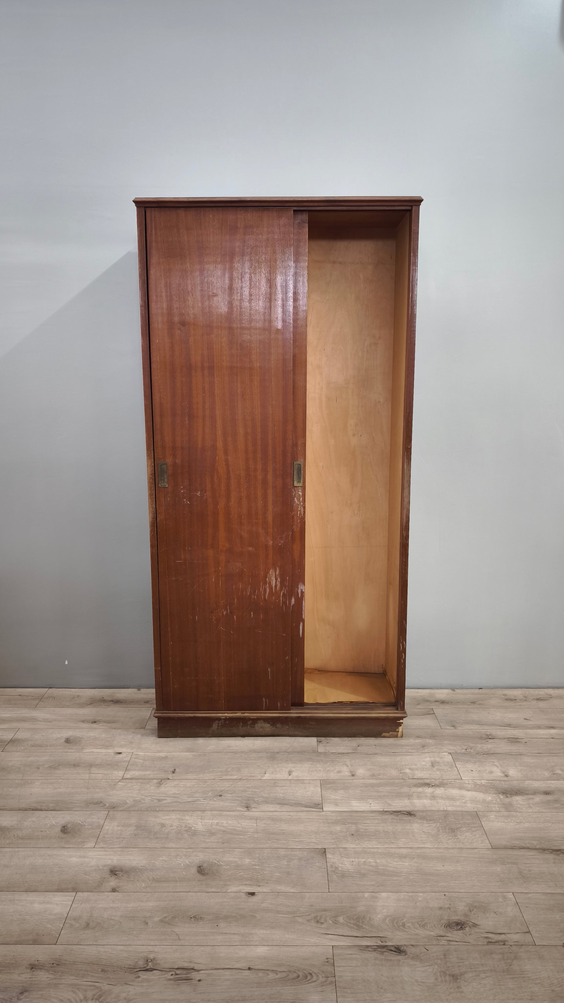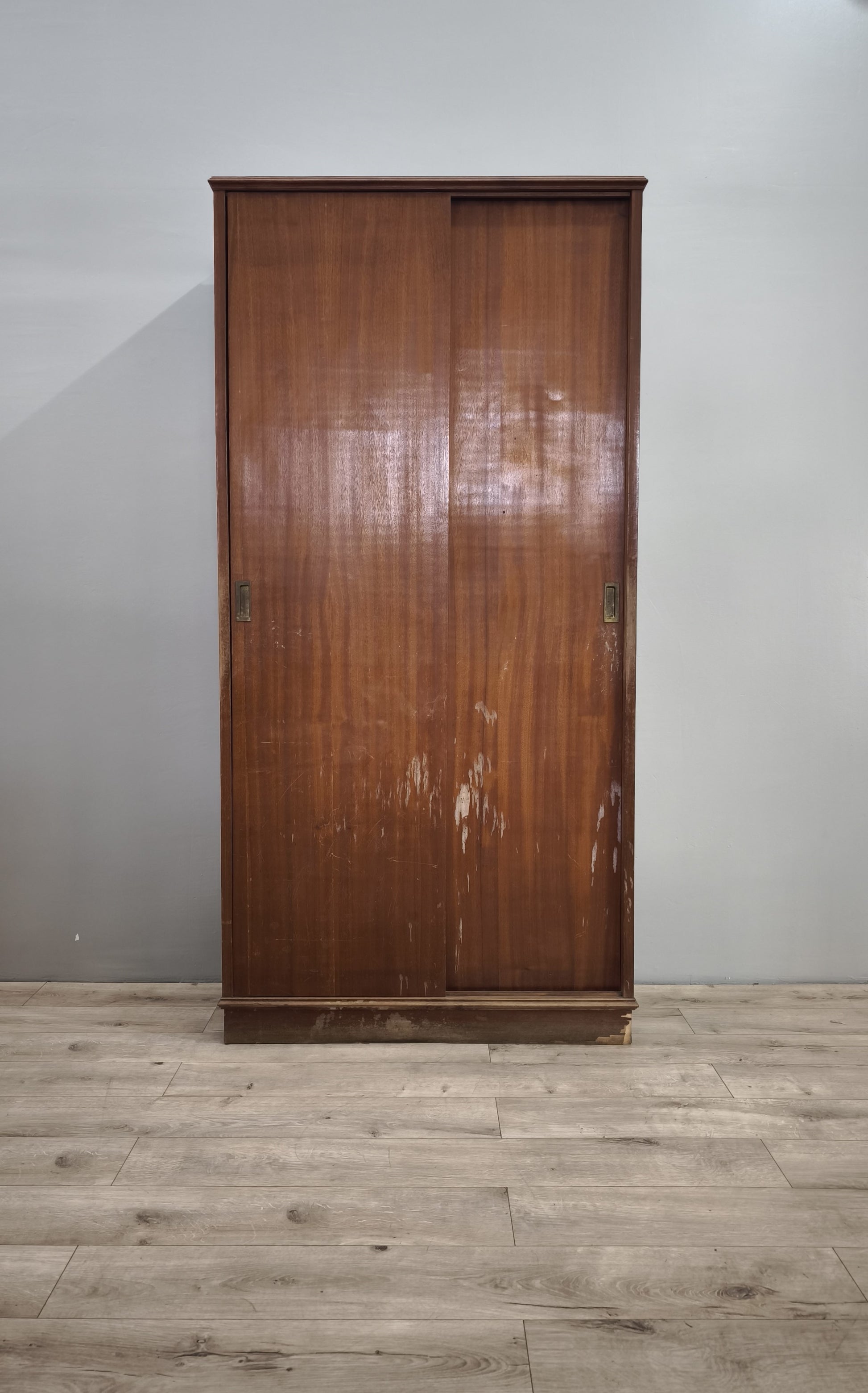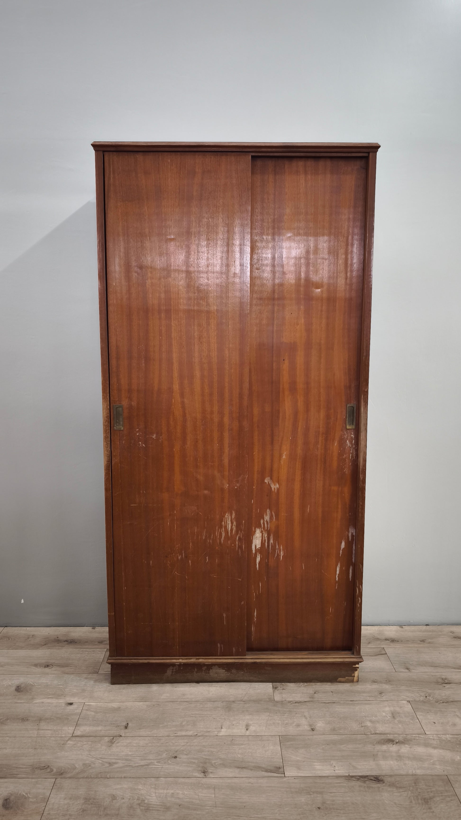 Armadio due ante scorrevoli, nella parte sinistra troviamo quattro ripiani, nella parte destra un vano appendiabiti