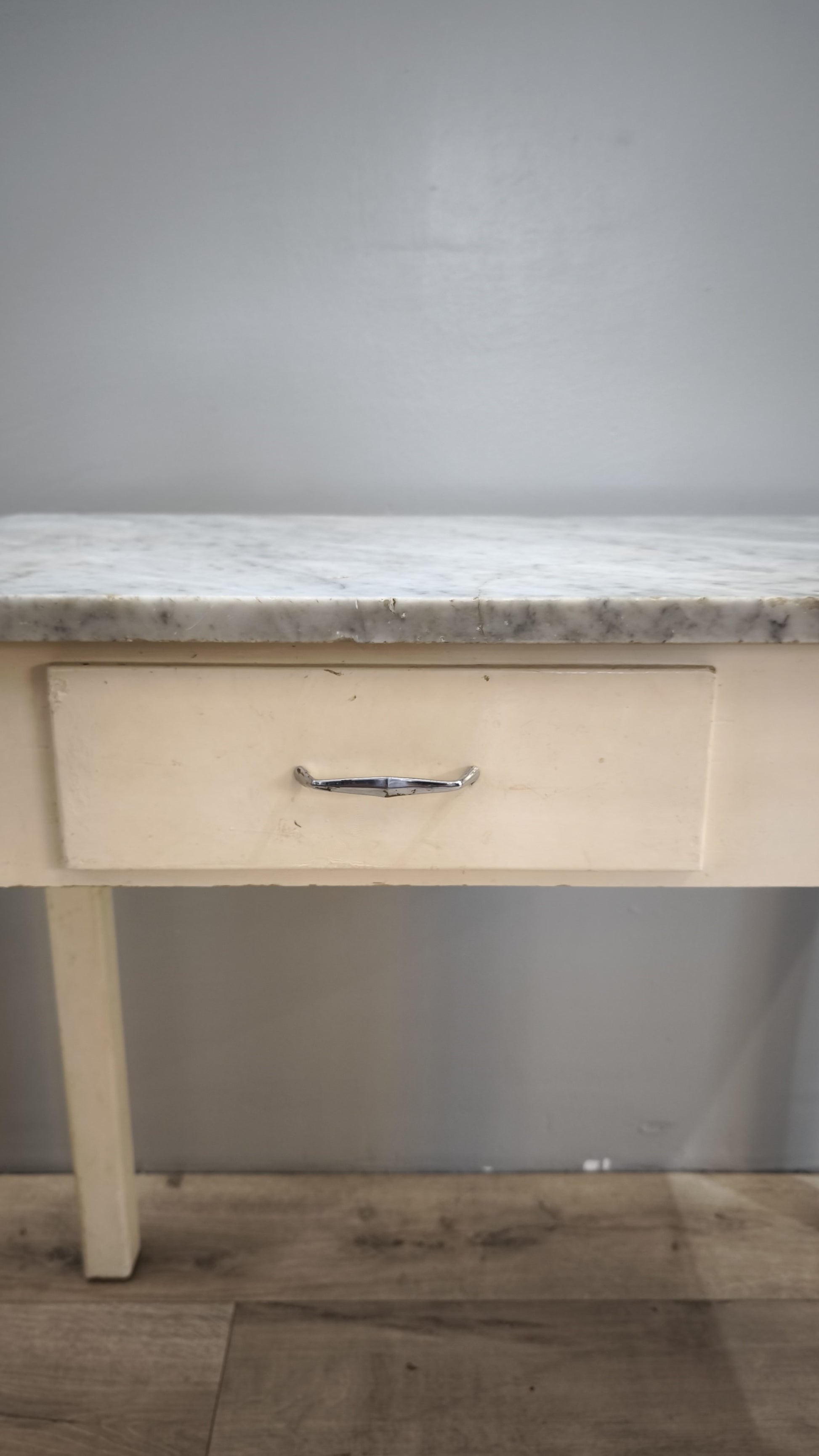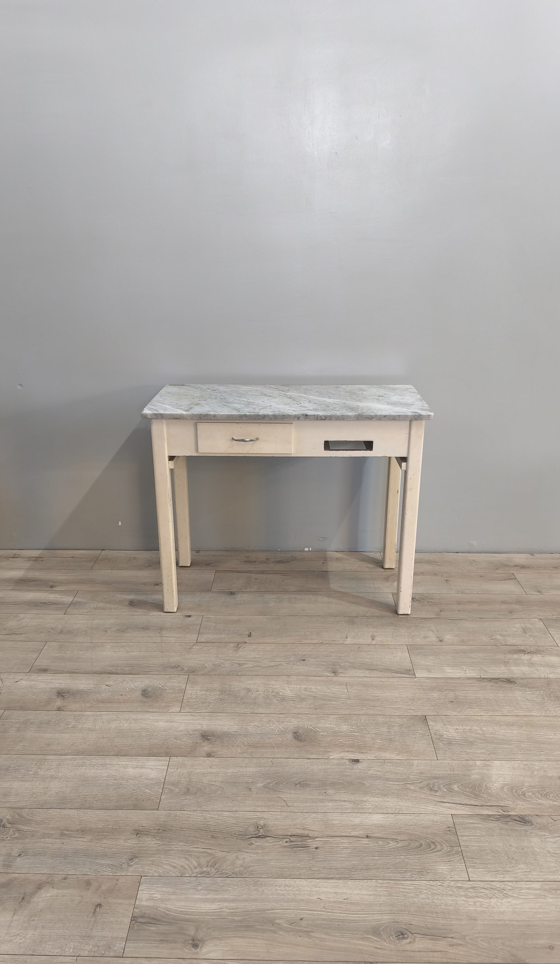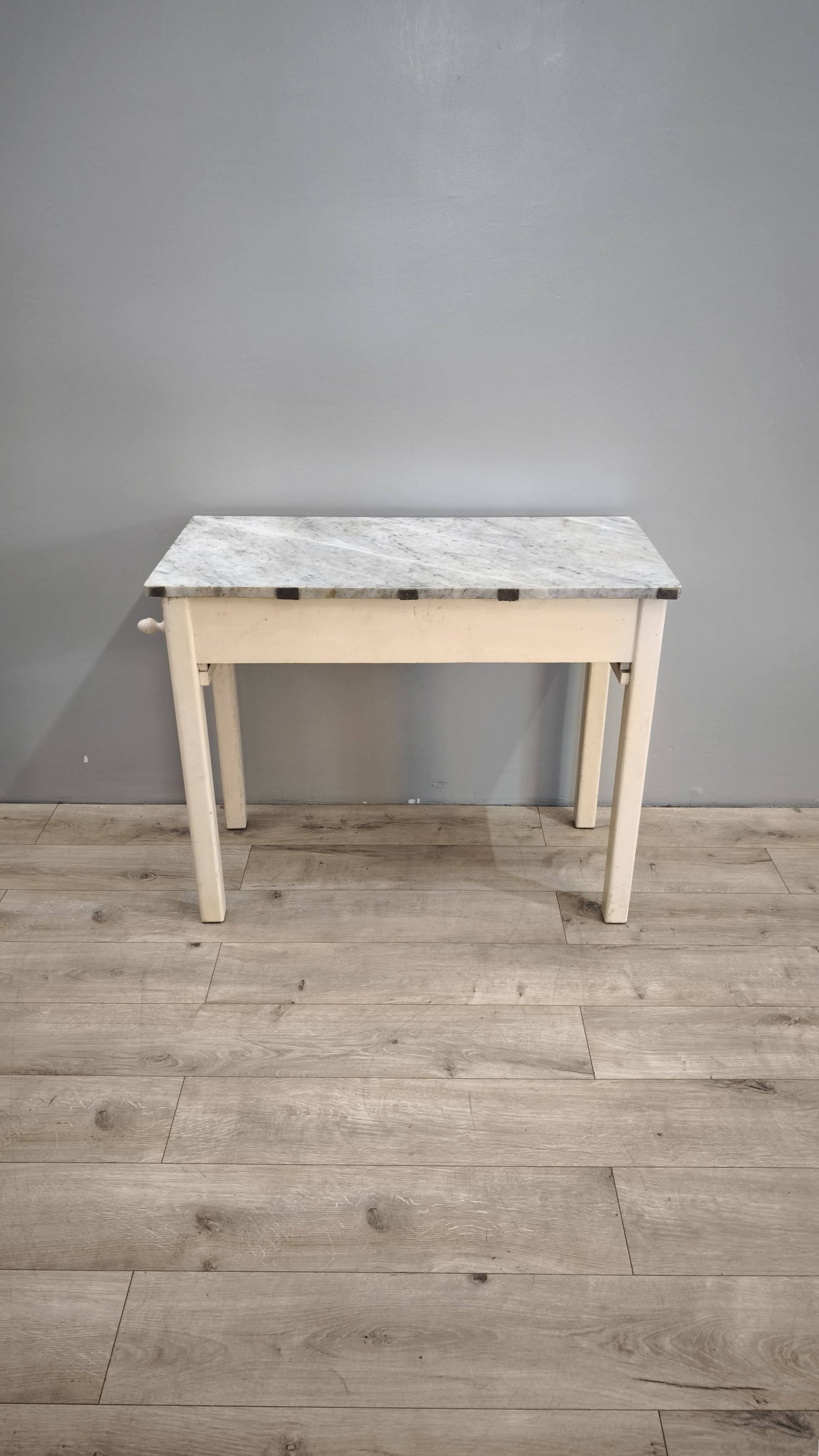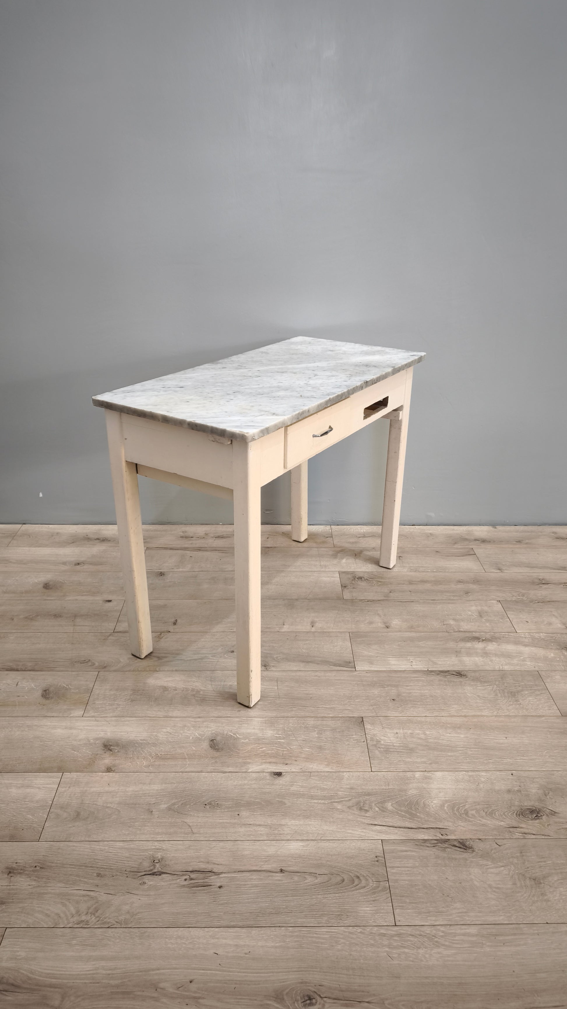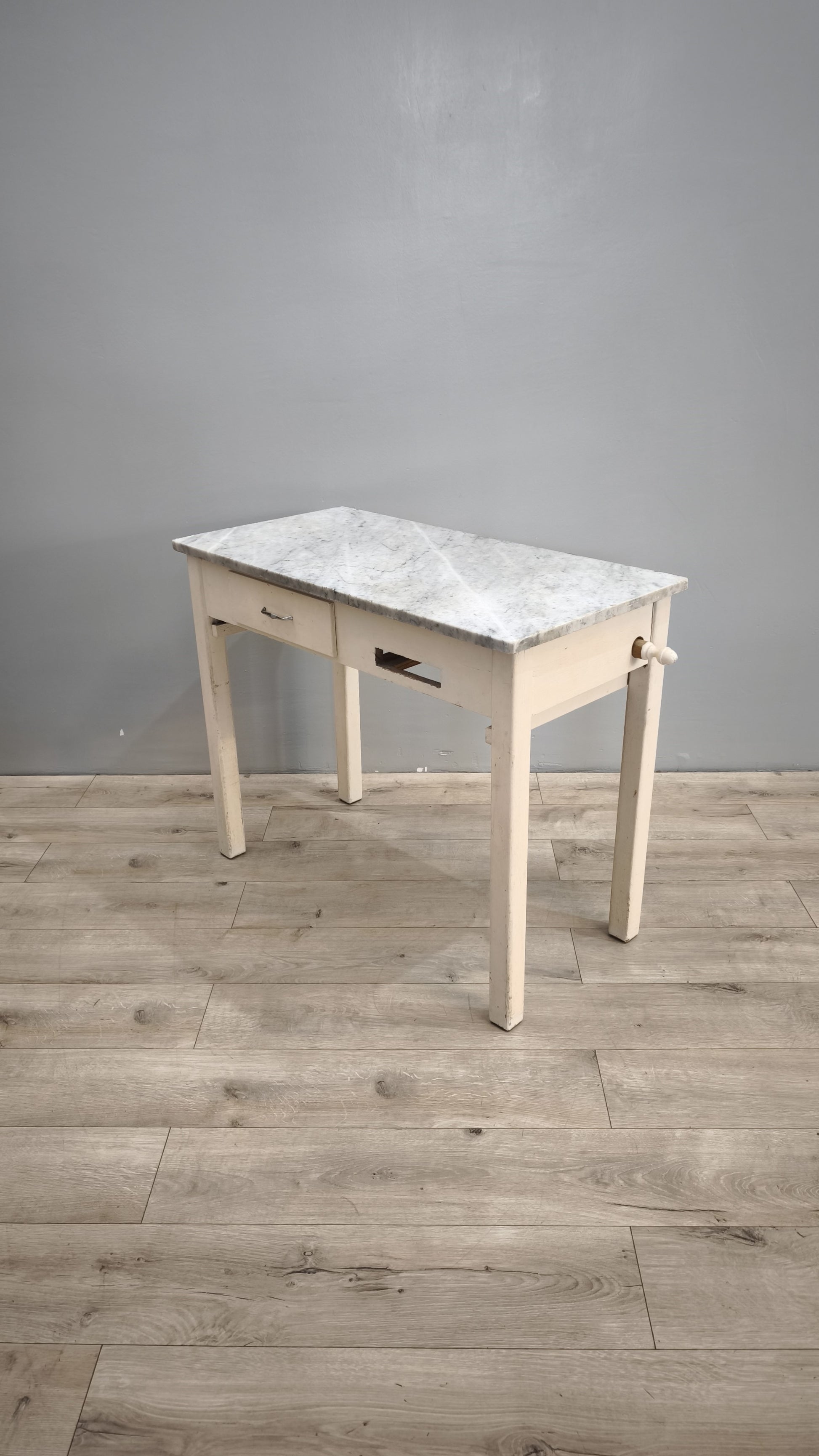 Tavolo da cucina in legno con piano in marmo e cassetto frontale, è presente il matterello