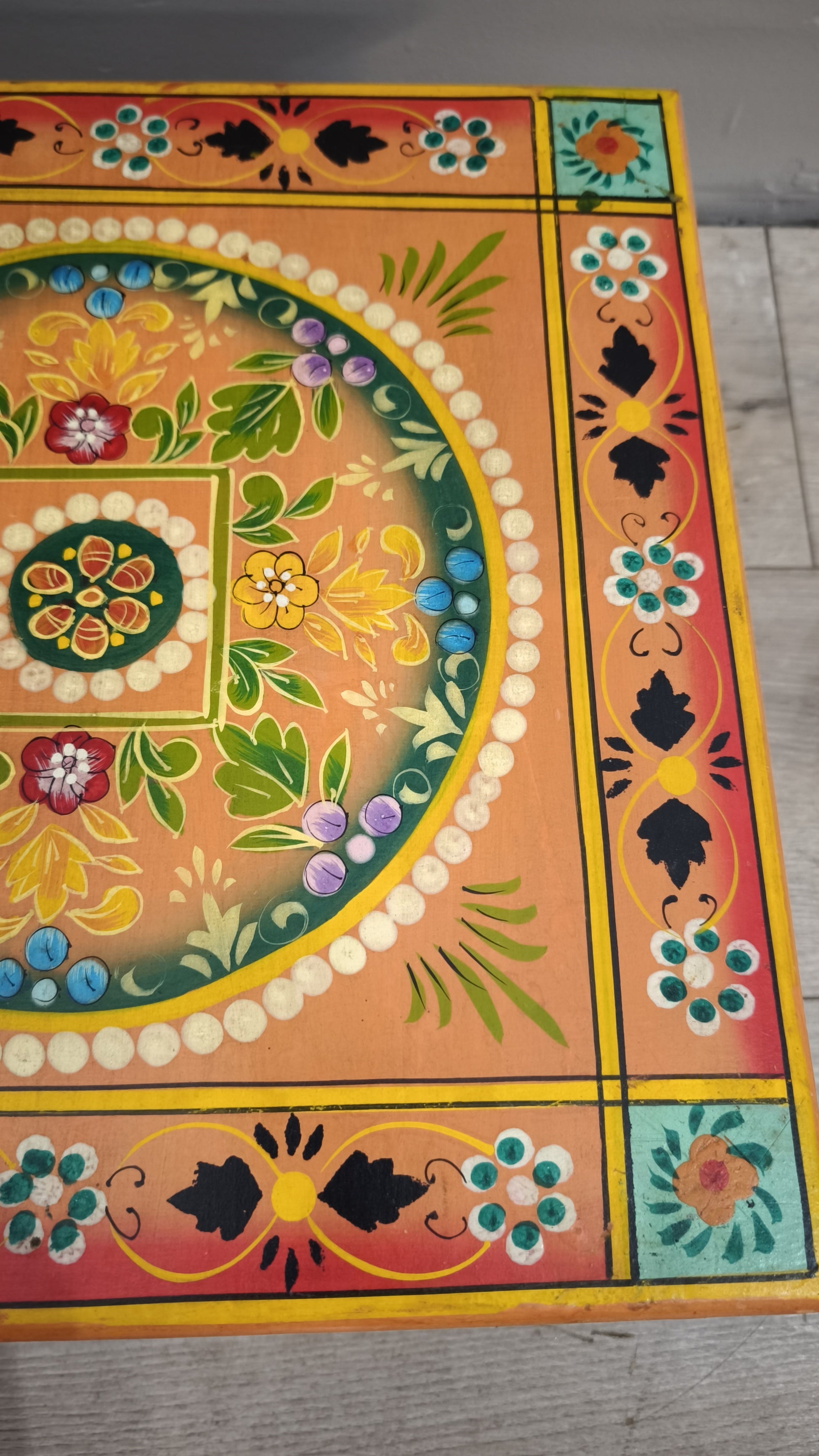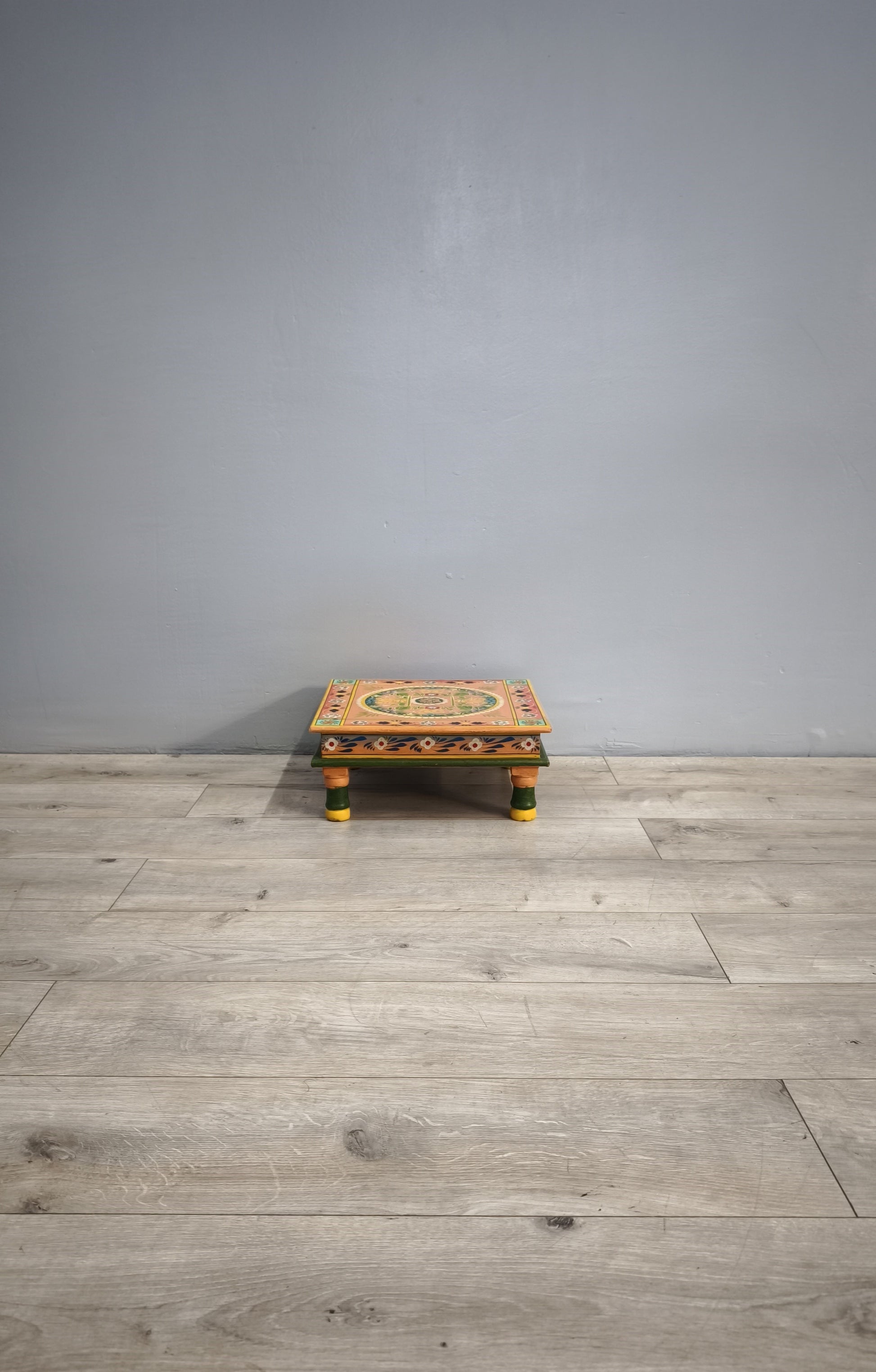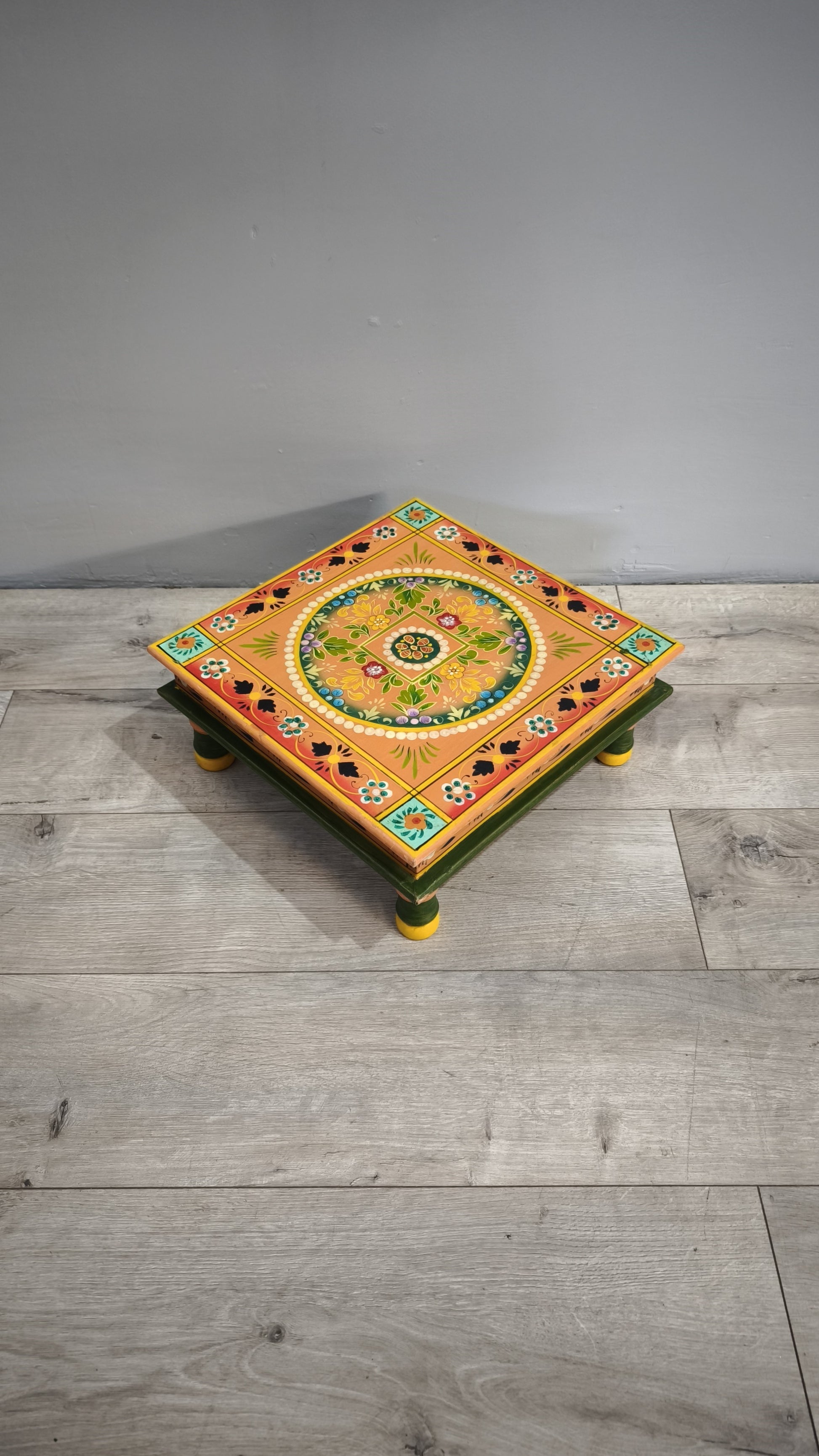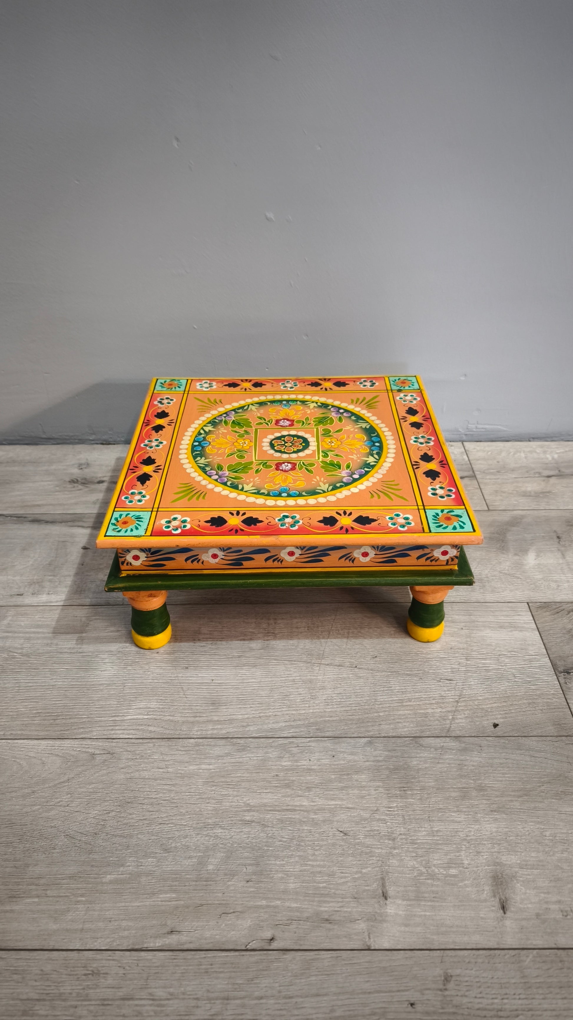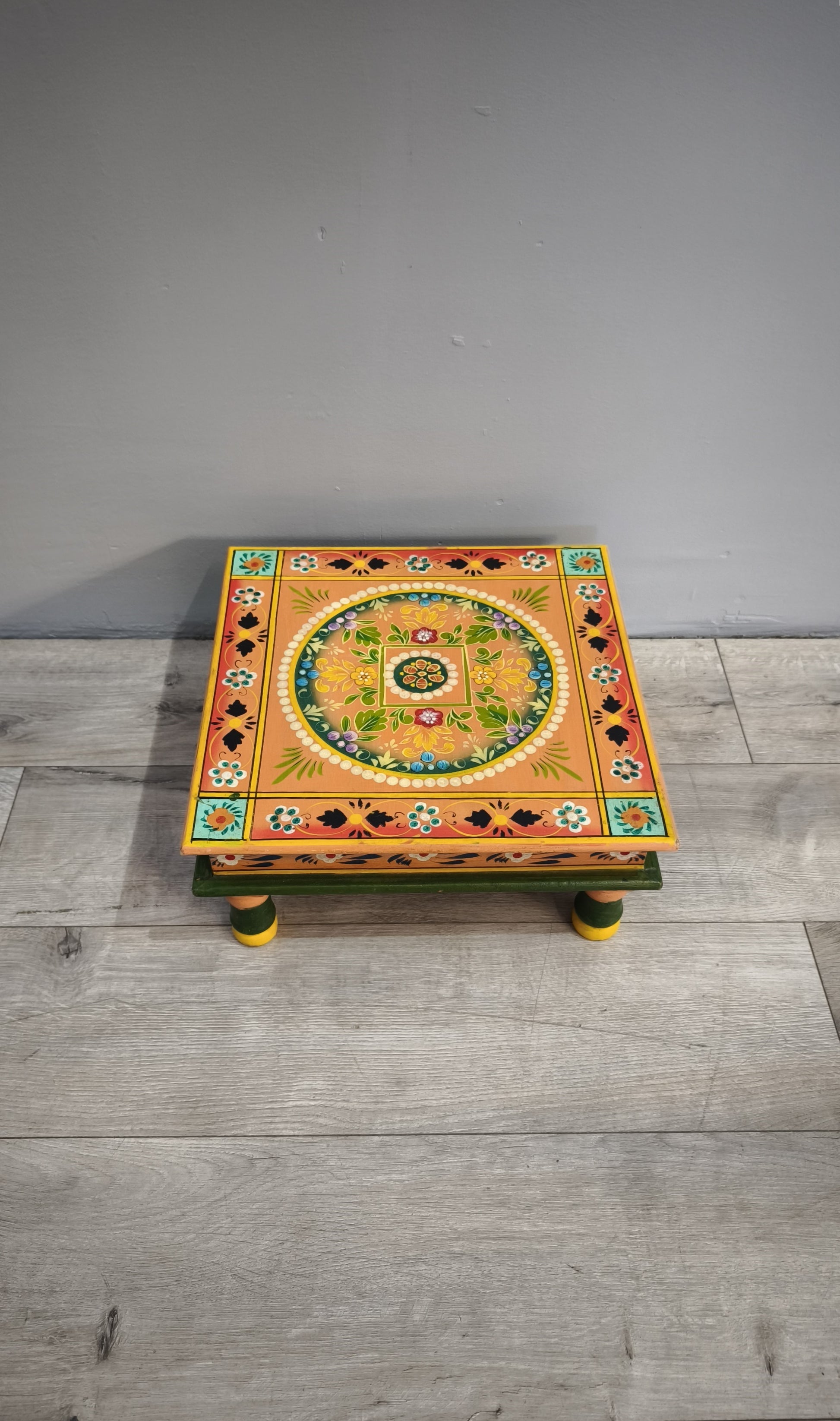 Tavolino indiano in legno dipinto con piano quadrato
