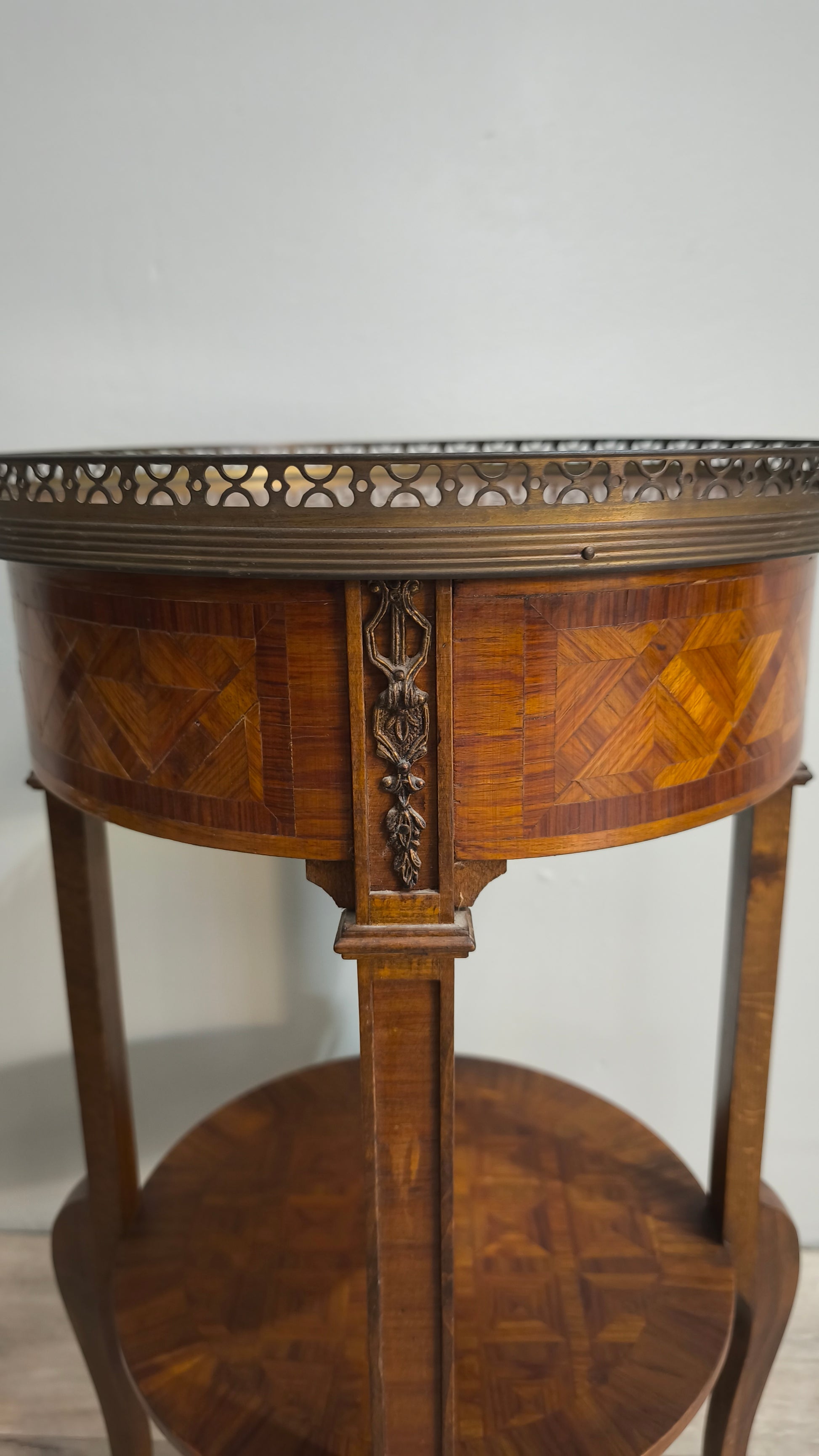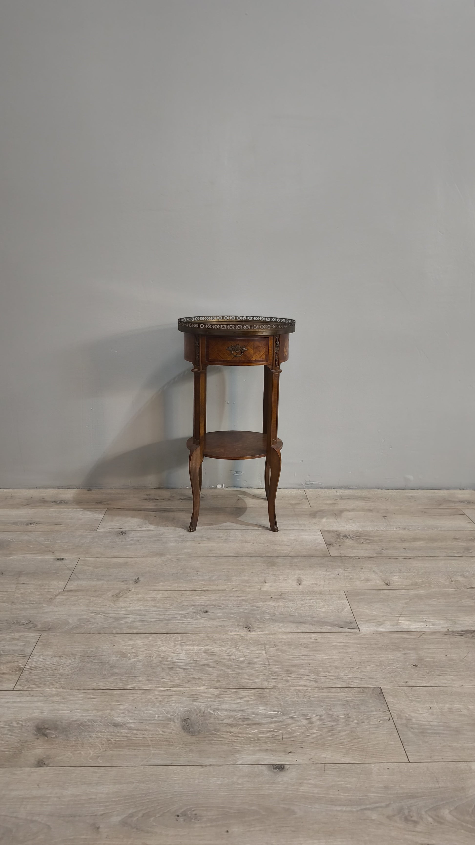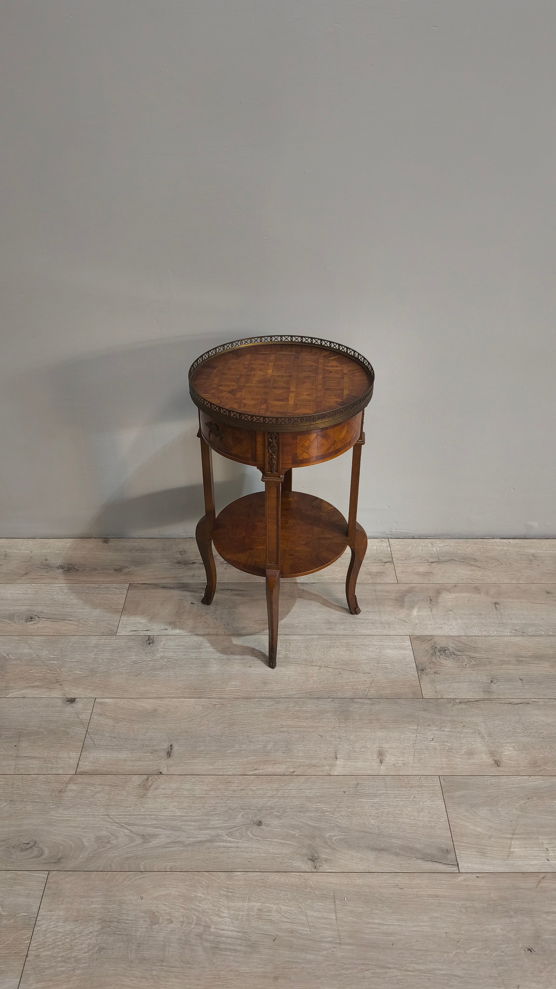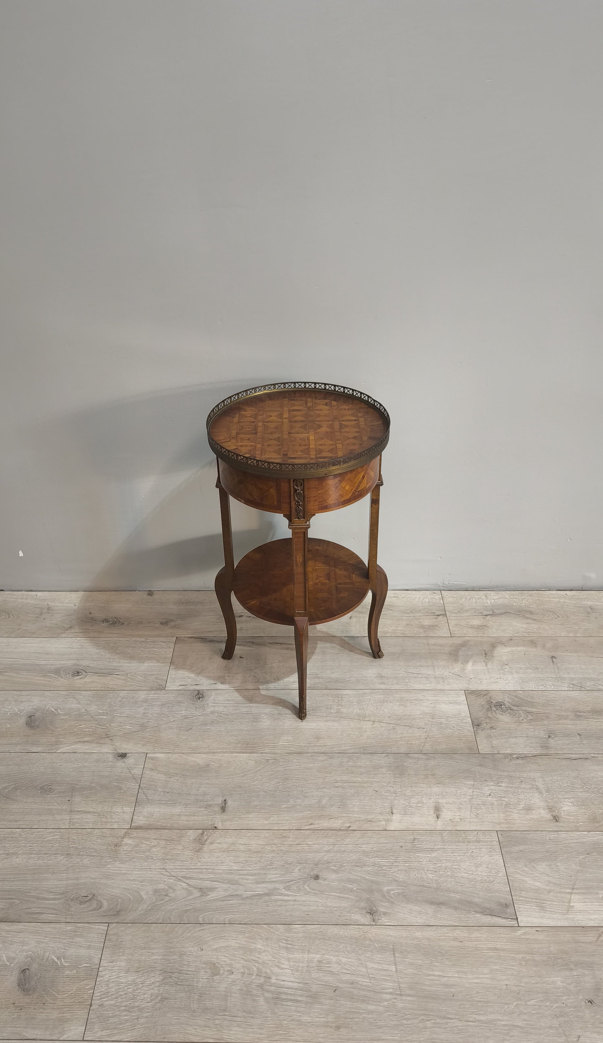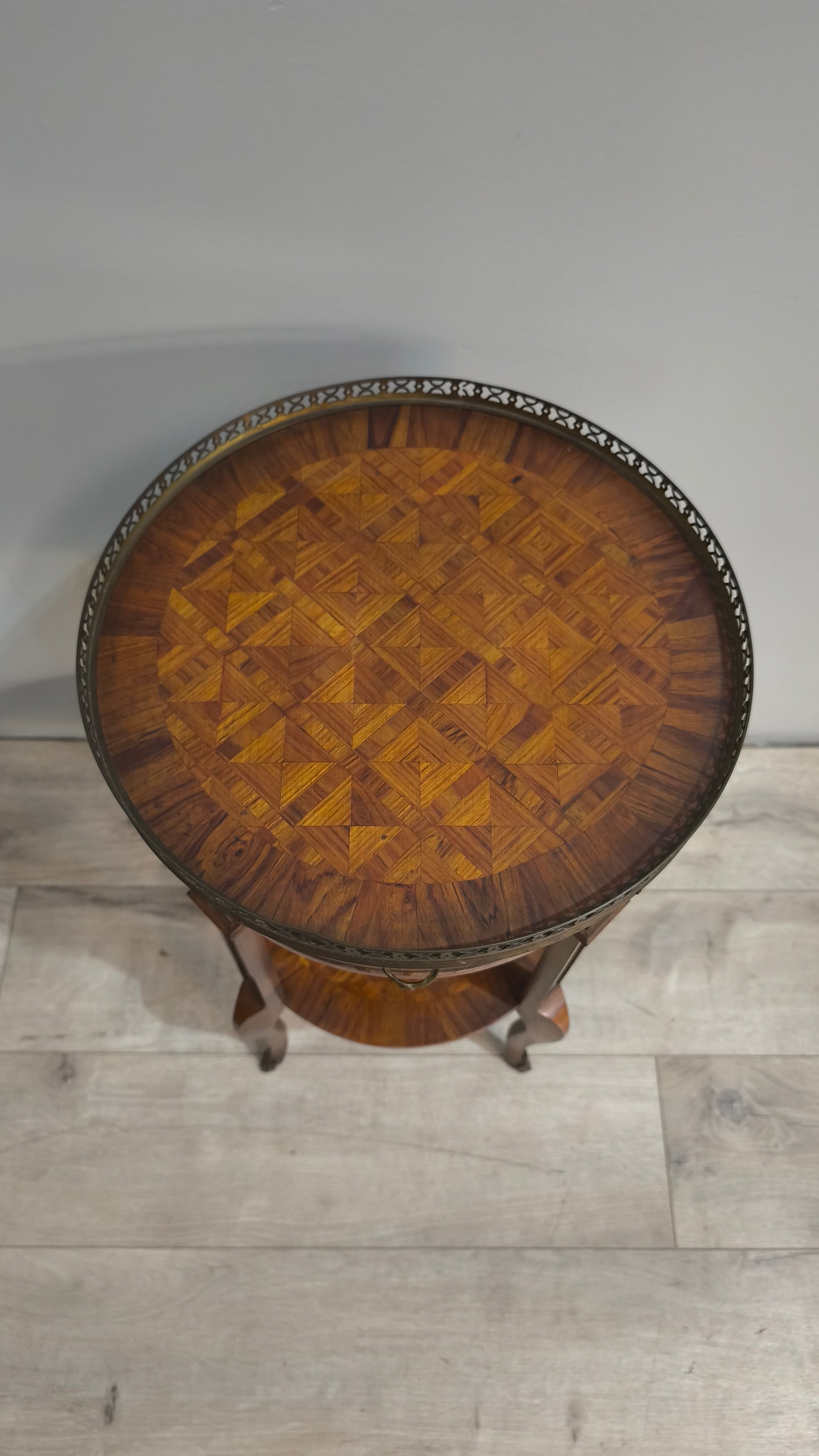 84222 Tavolino rotondo in legno intarsiato con doppio ripiano