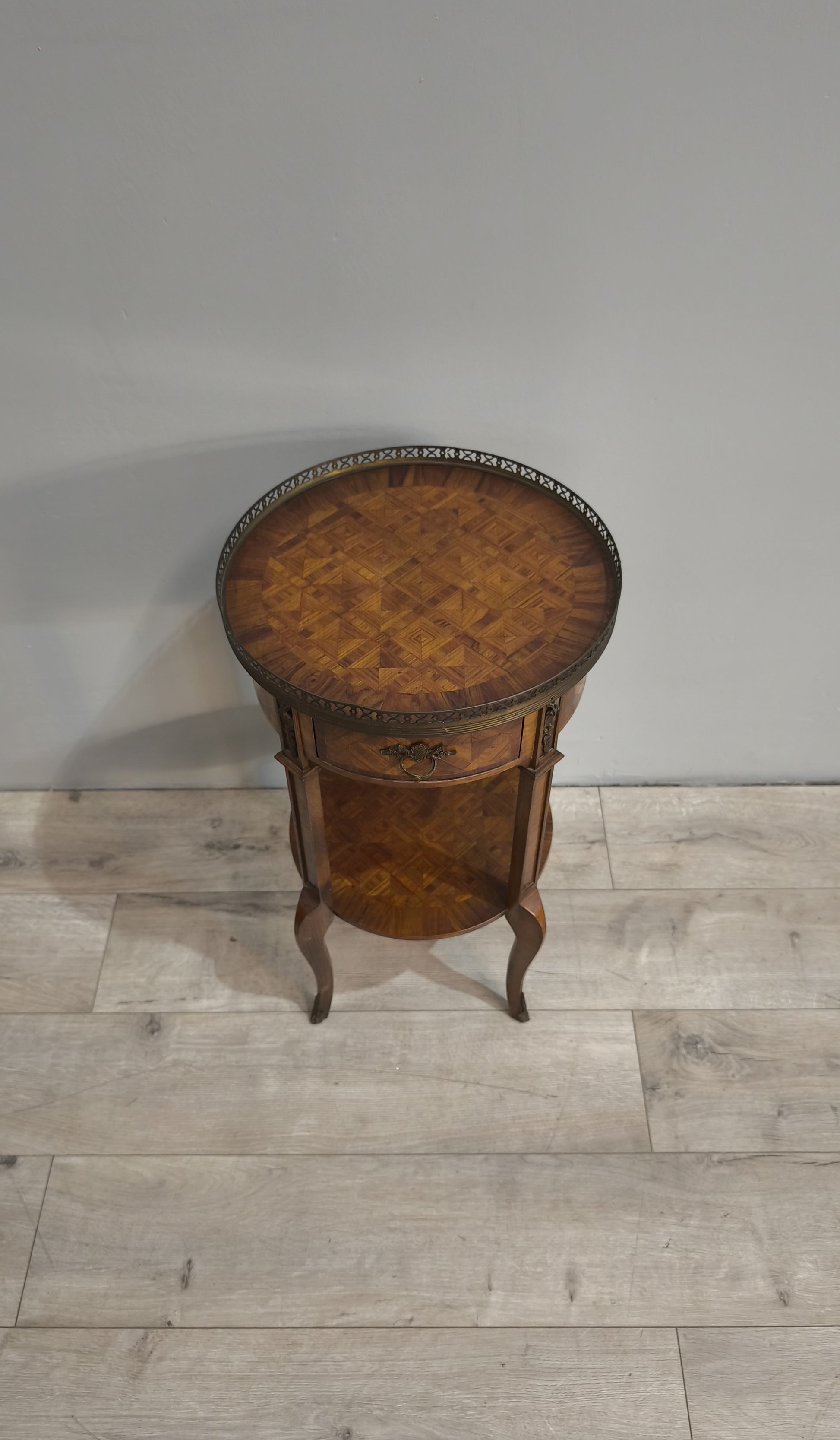 Tavolino rotondo in legno intarsiato con doppio ripiano