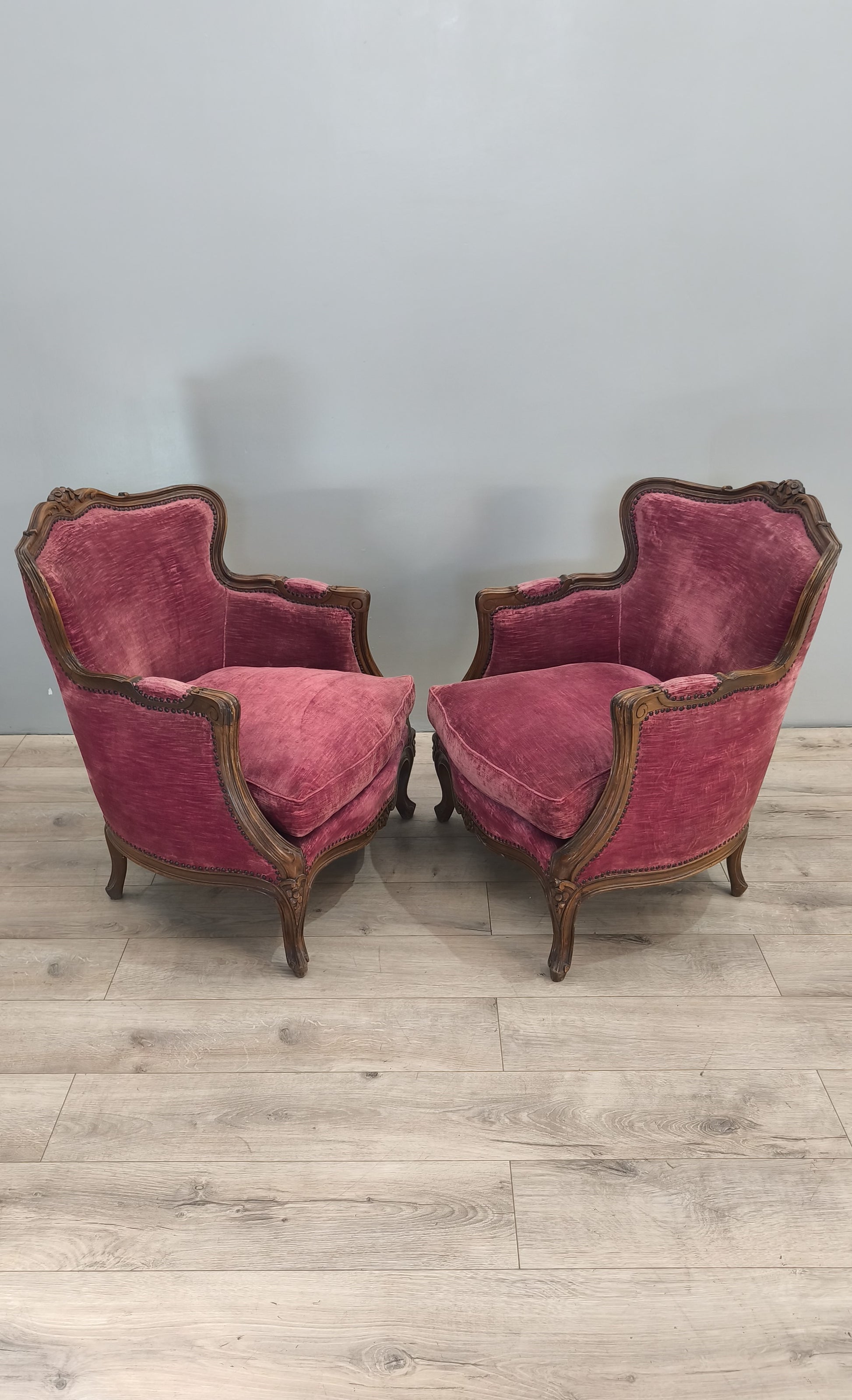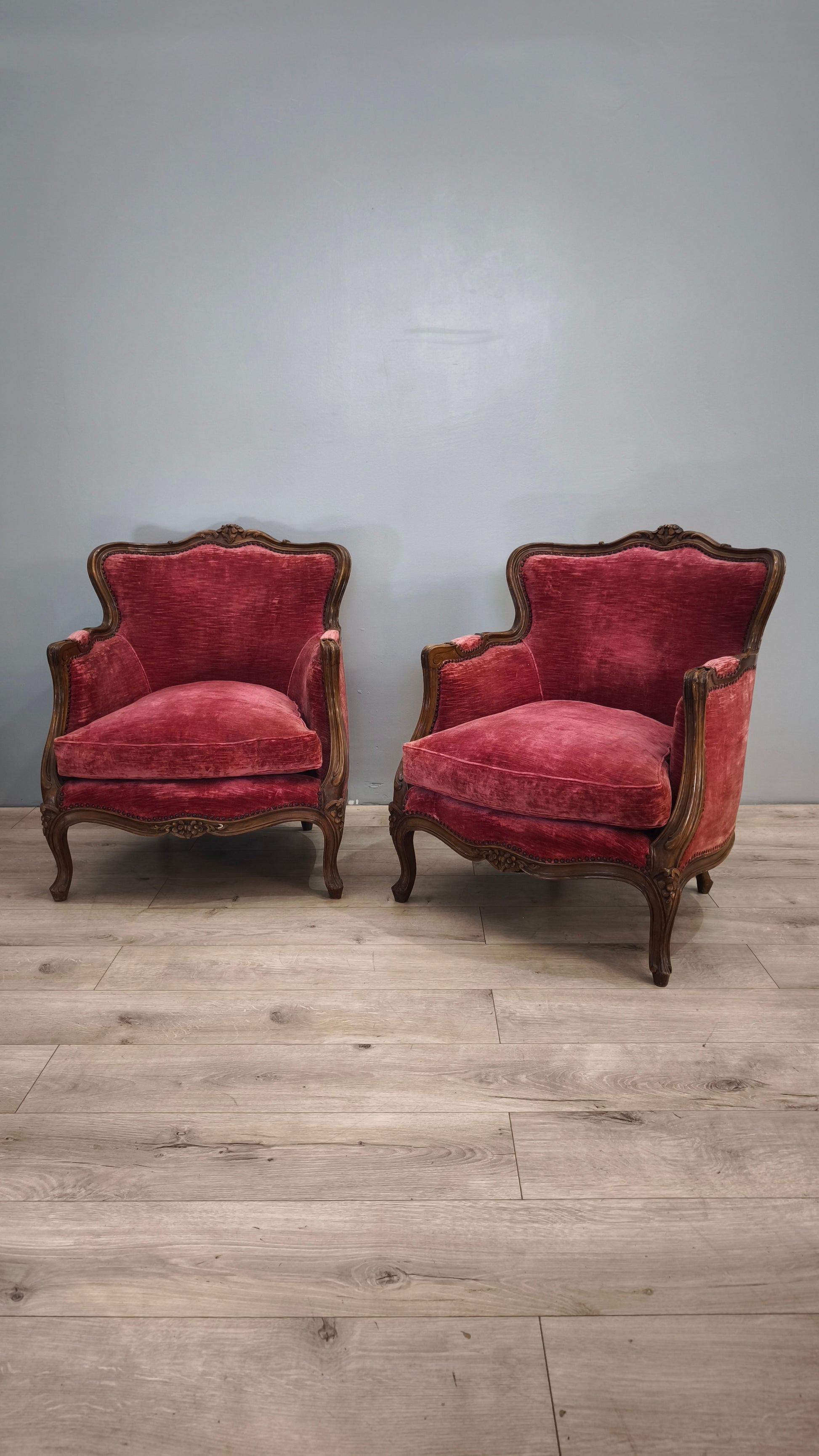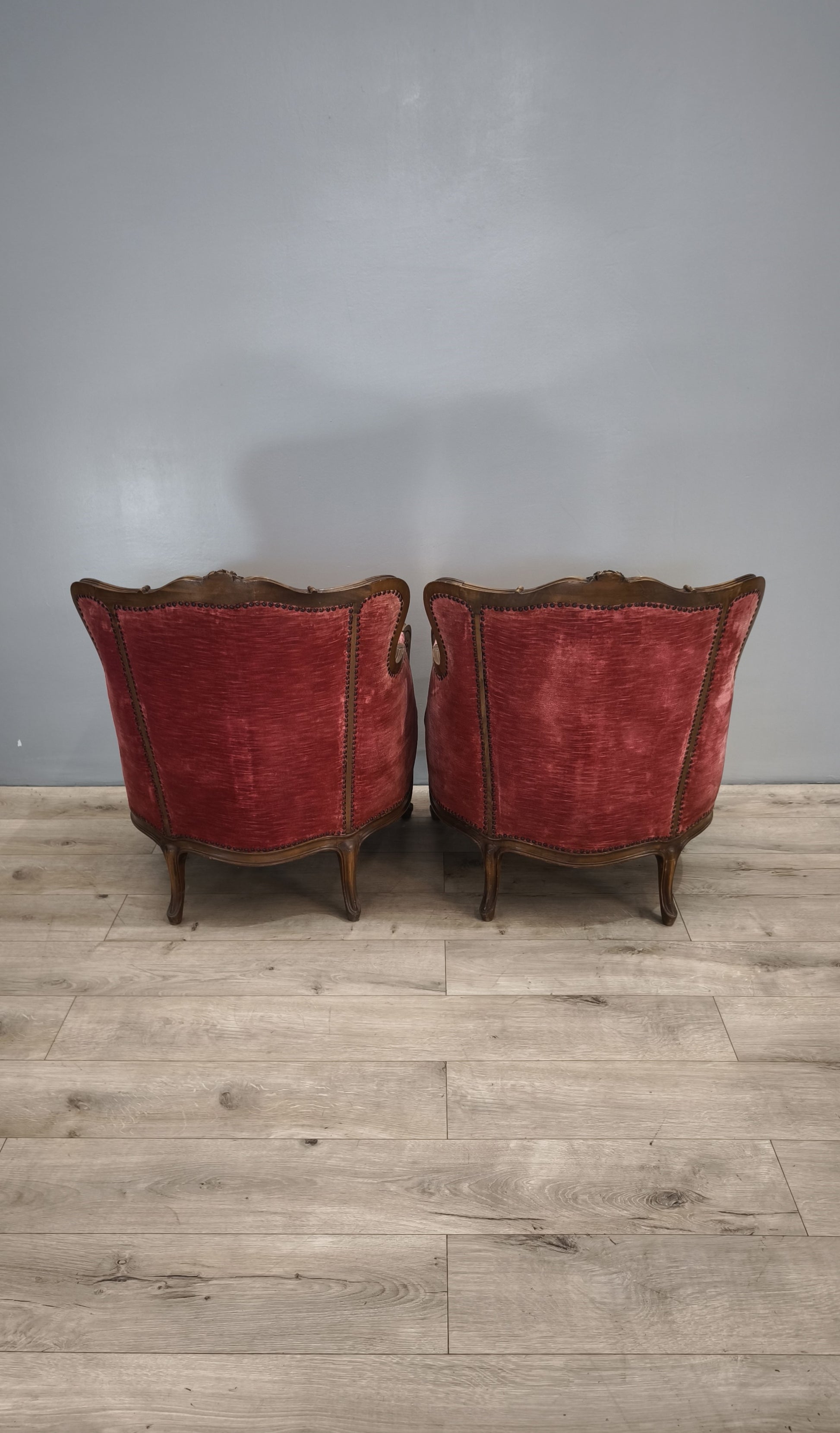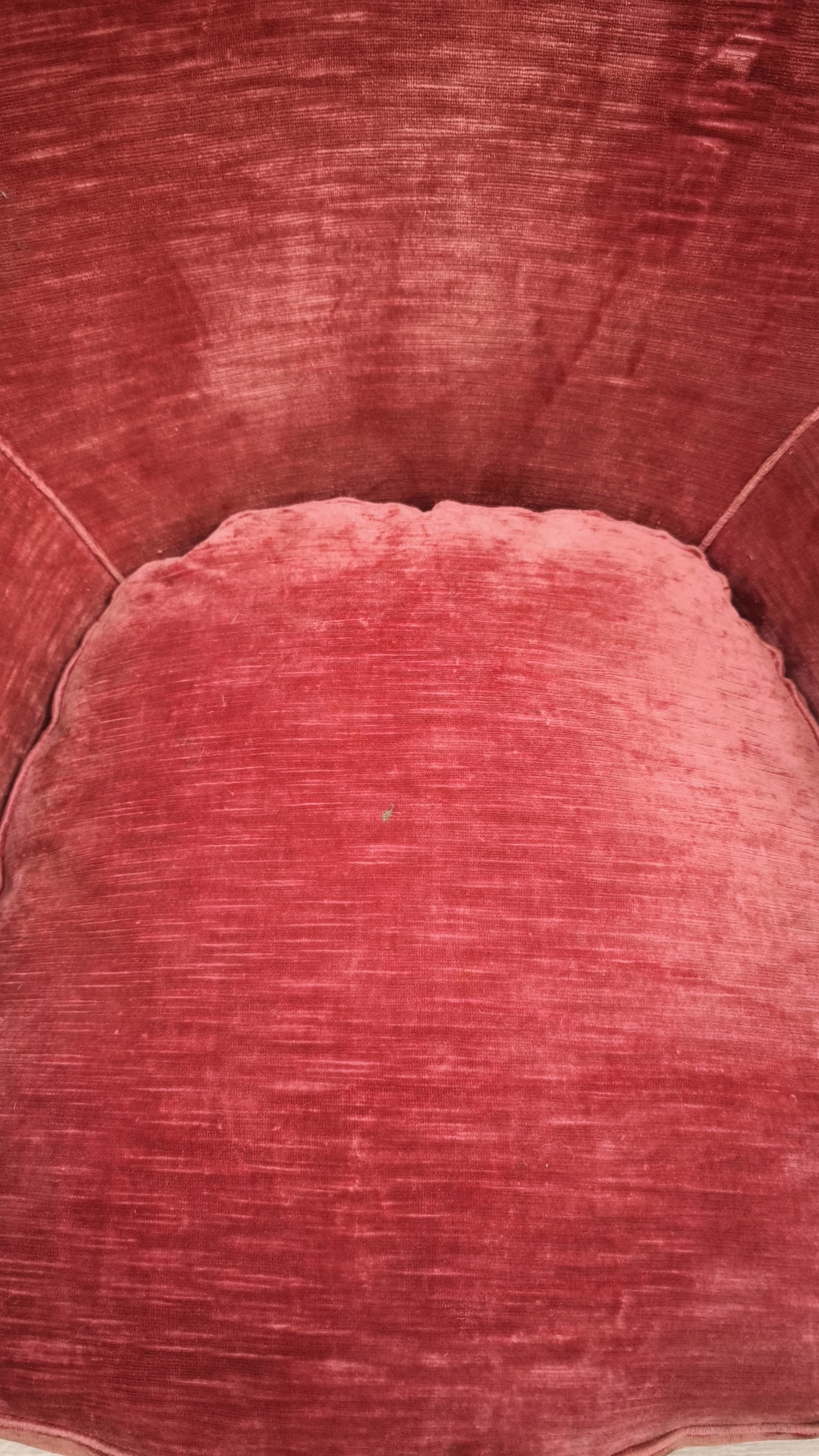 Coppia di poltroncine a pozzetto con struttura in legno, imbottite e rivestite in tessuto color ciliegia
