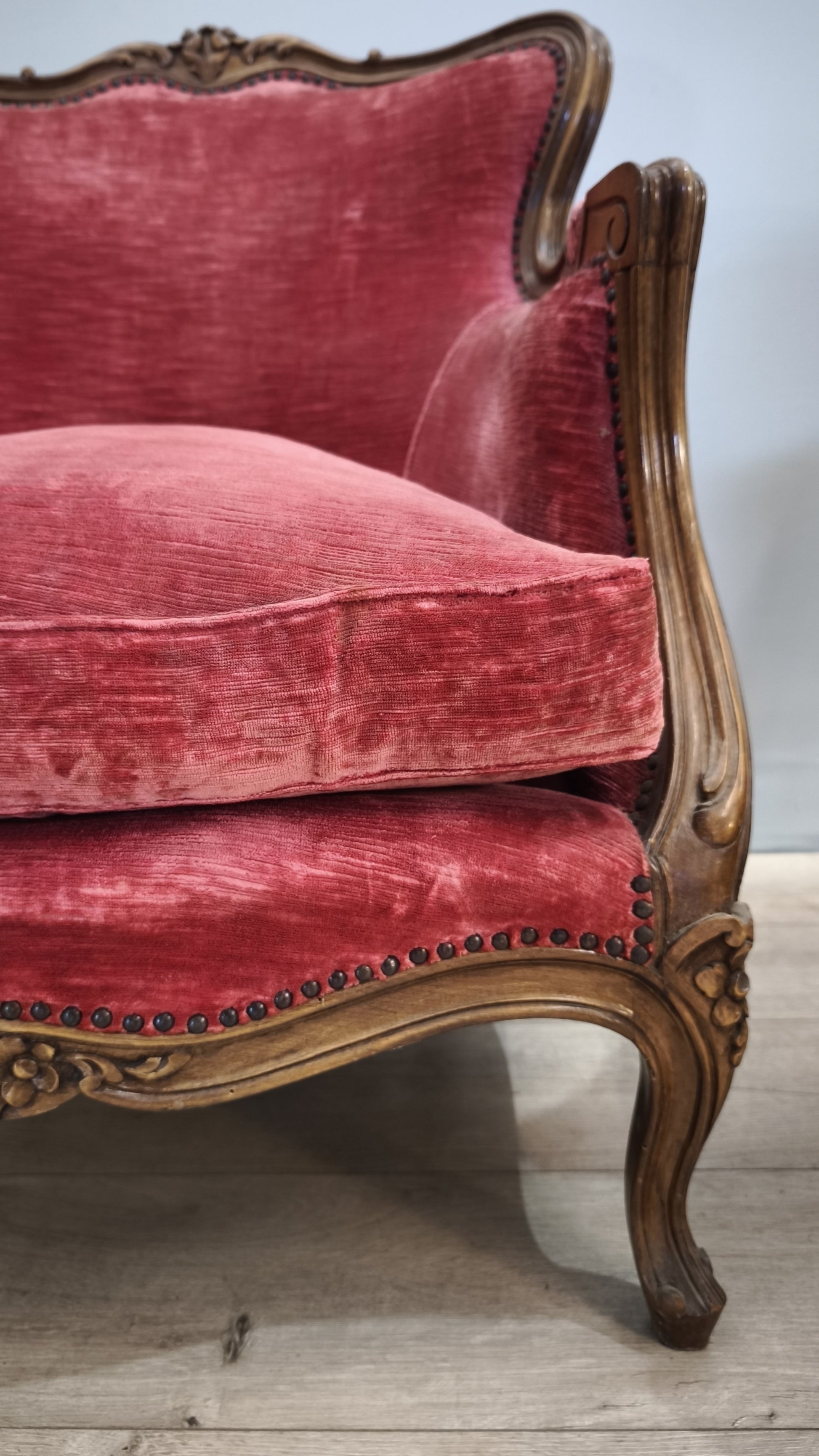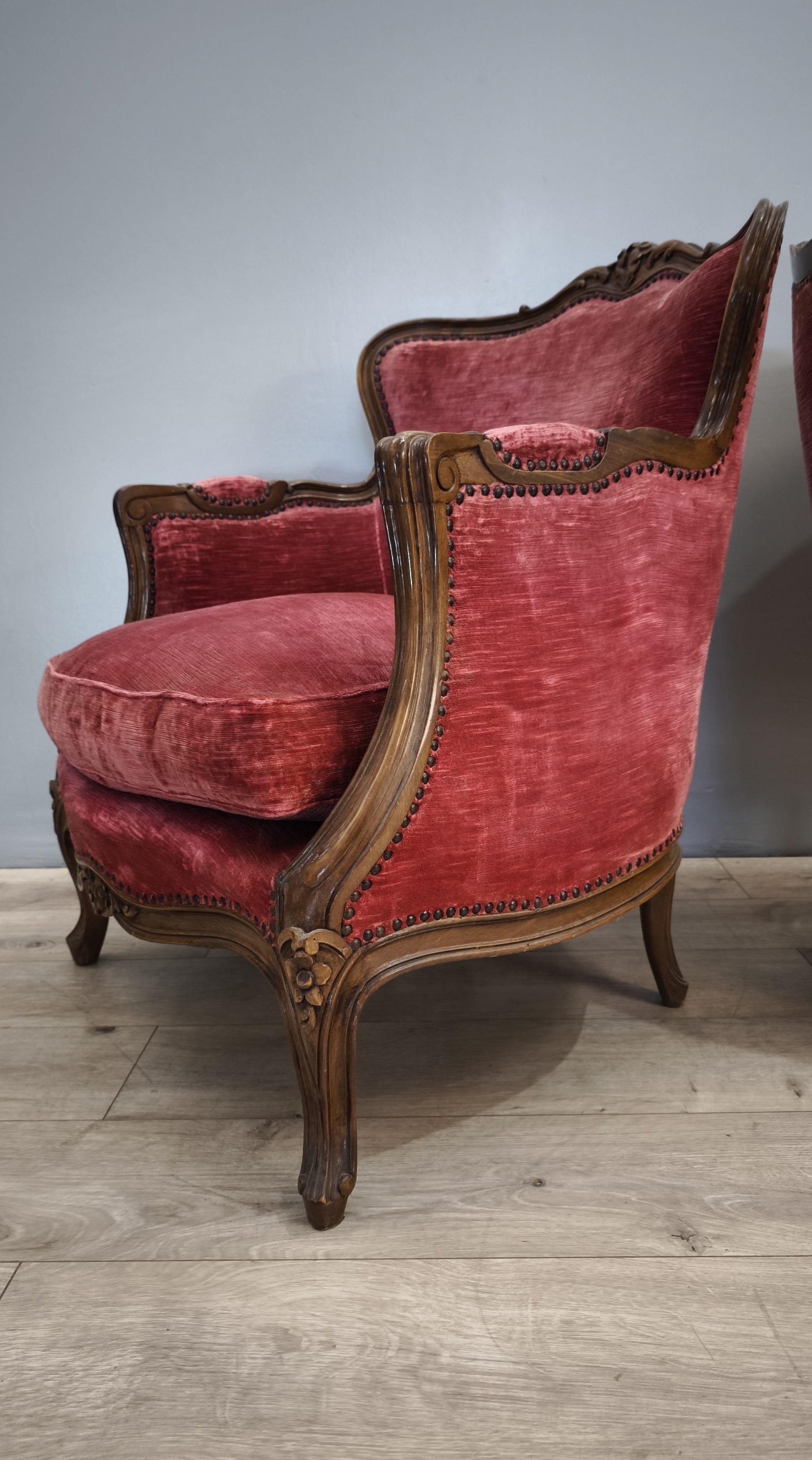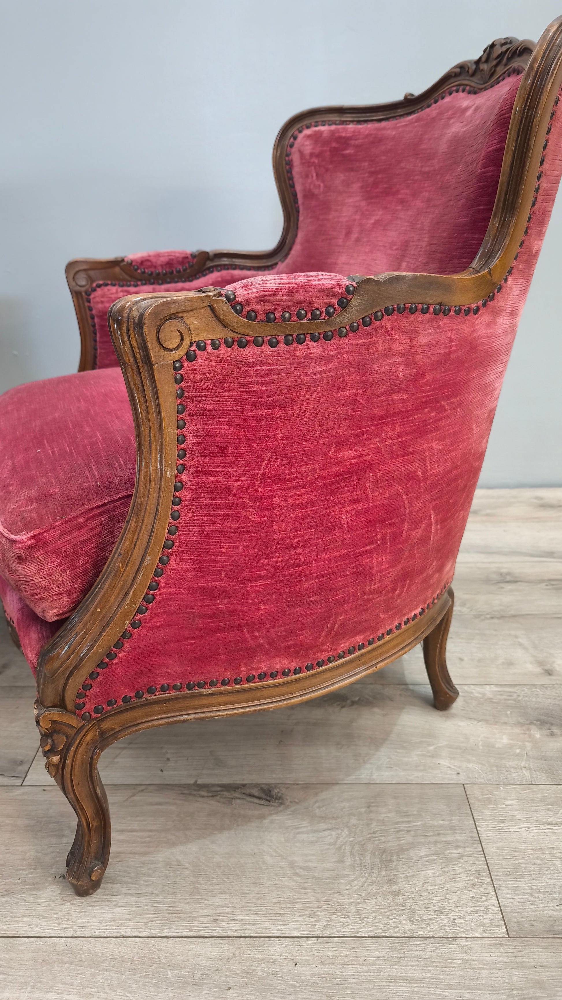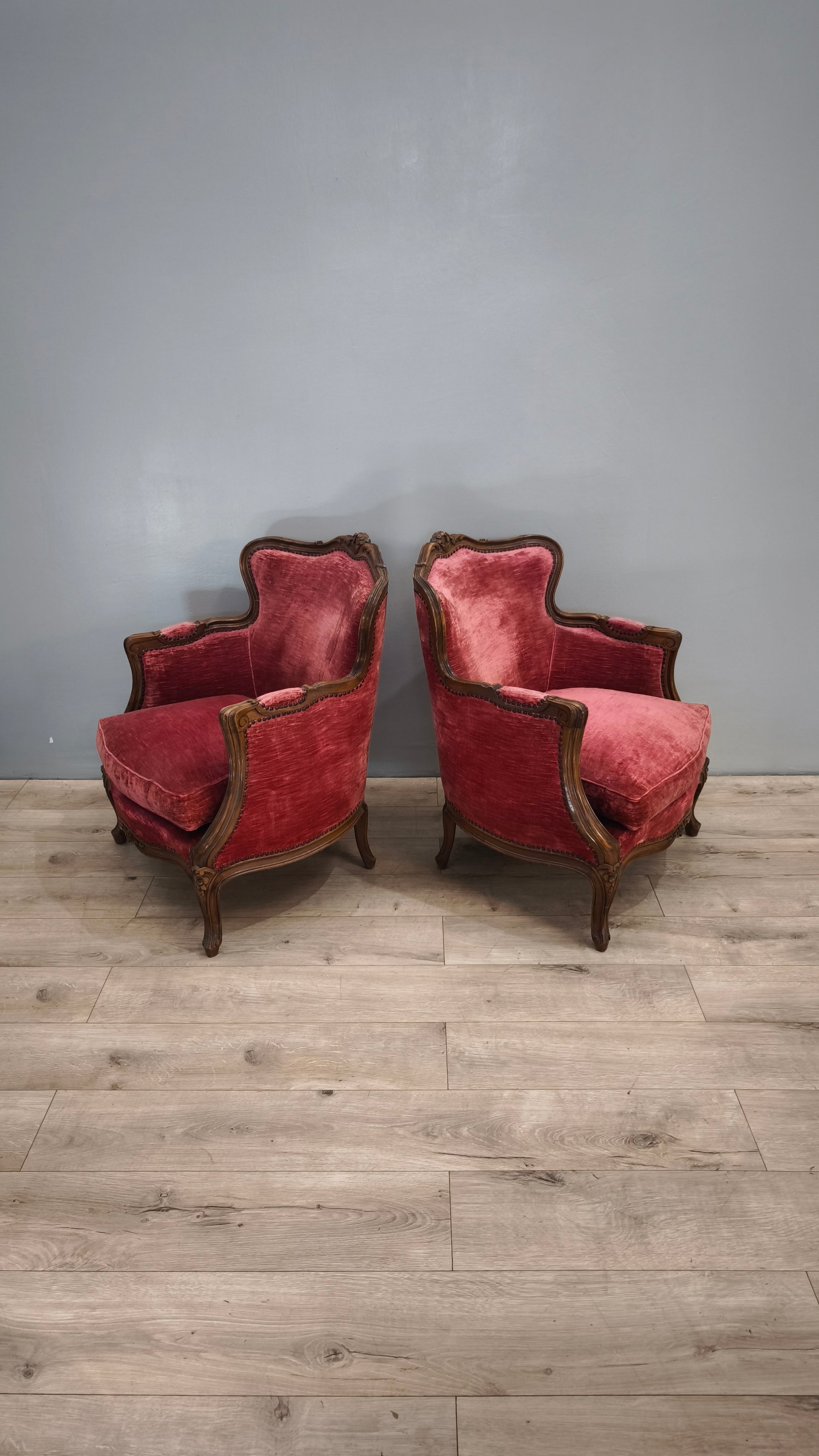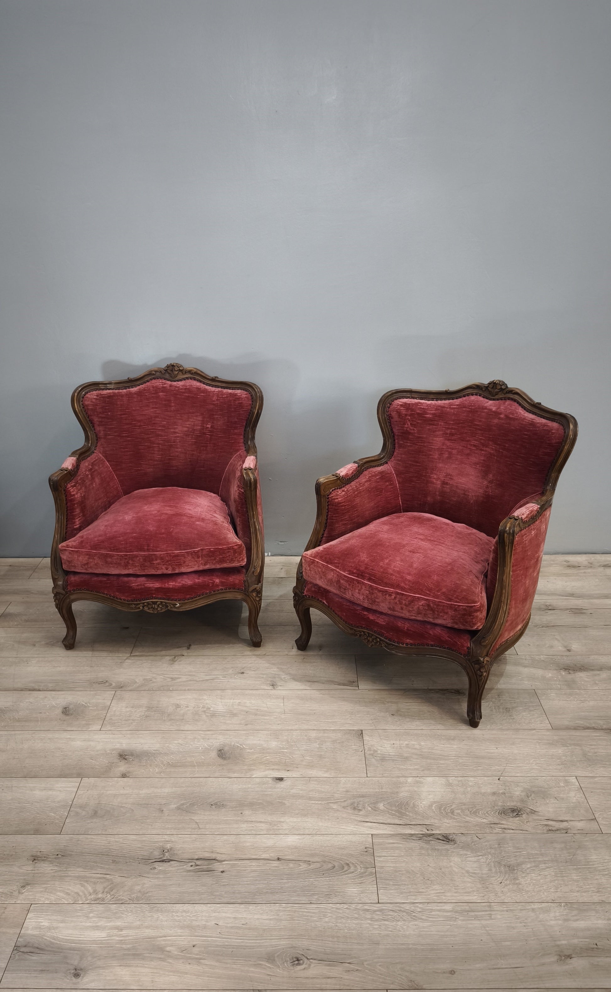 Coppia di poltroncine a pozzetto con struttura in legno, imbottite e rivestite in tessuto color ciliegia