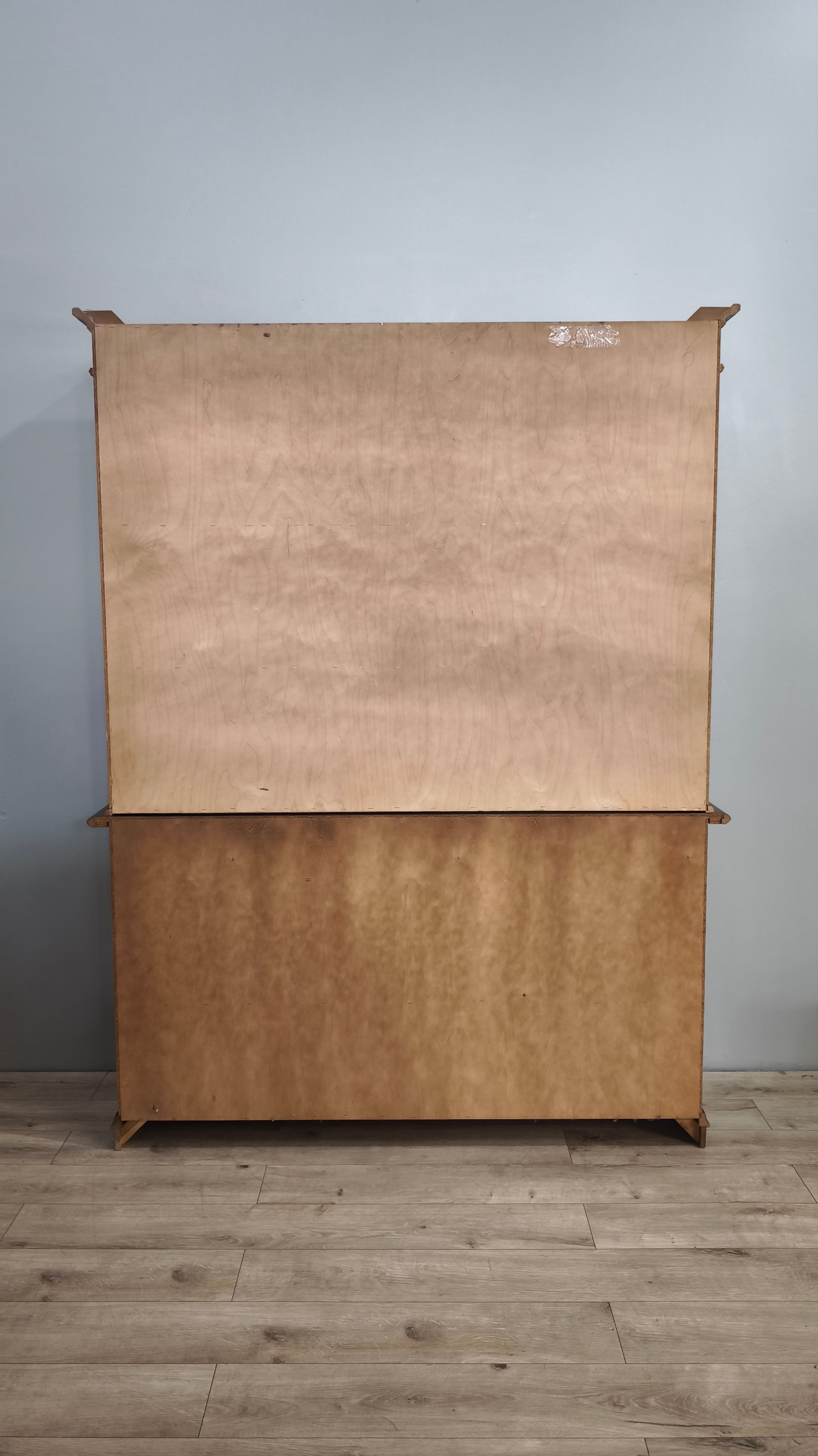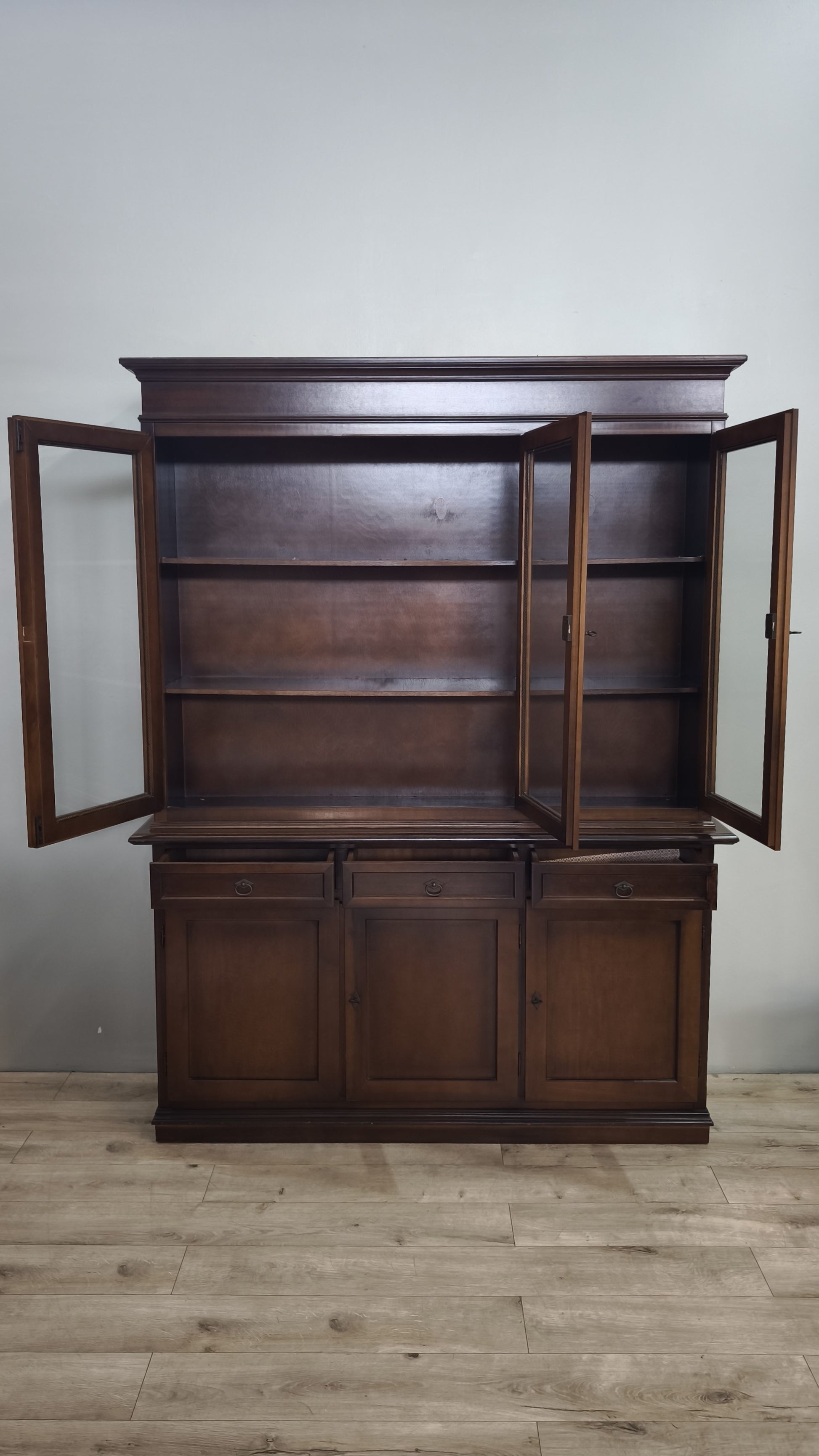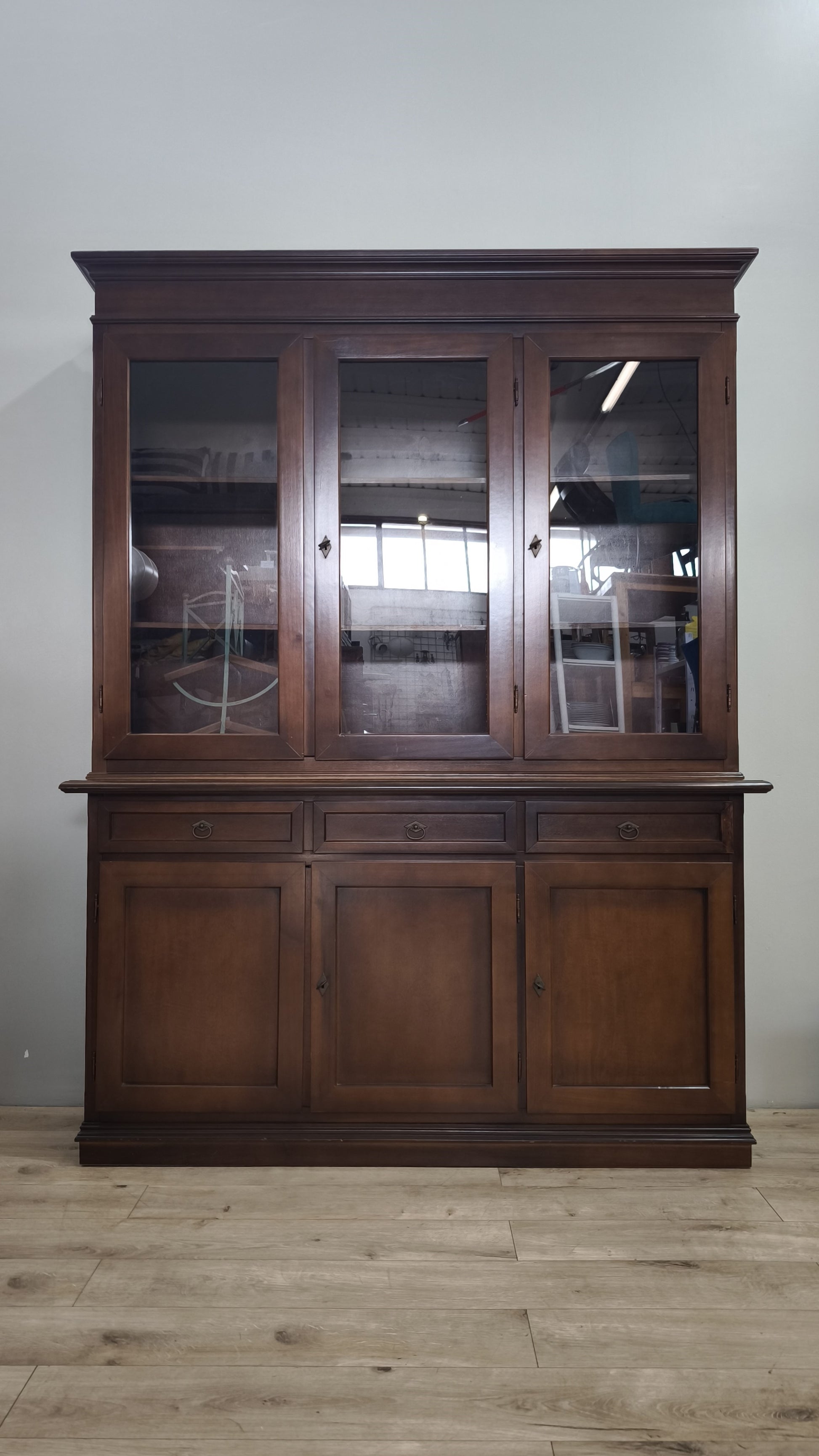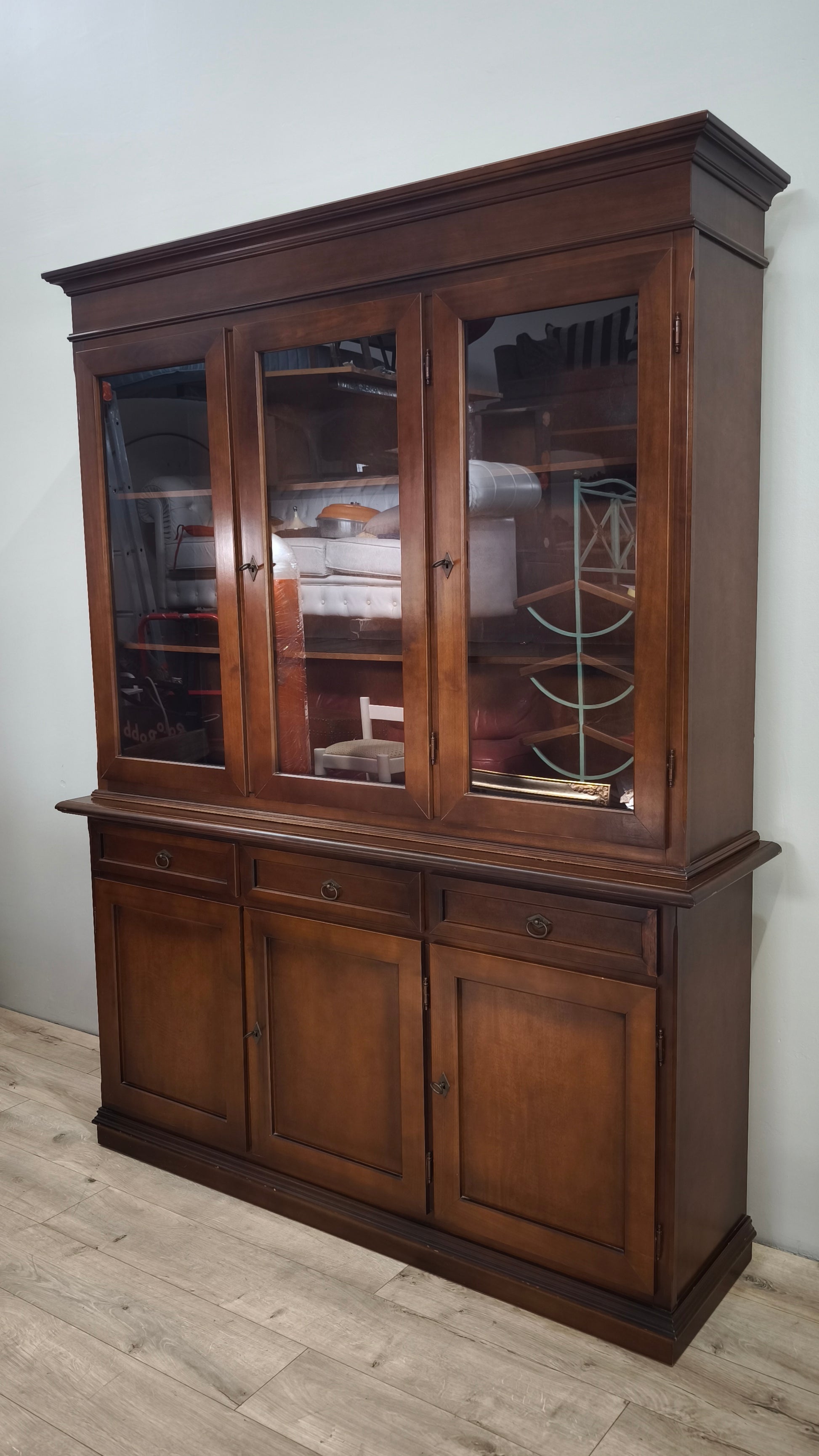 Vetrina in legno composta da tre cassetti e tre sportelli nella parte inferiore, tre sportelli in vetro nella parte superiore