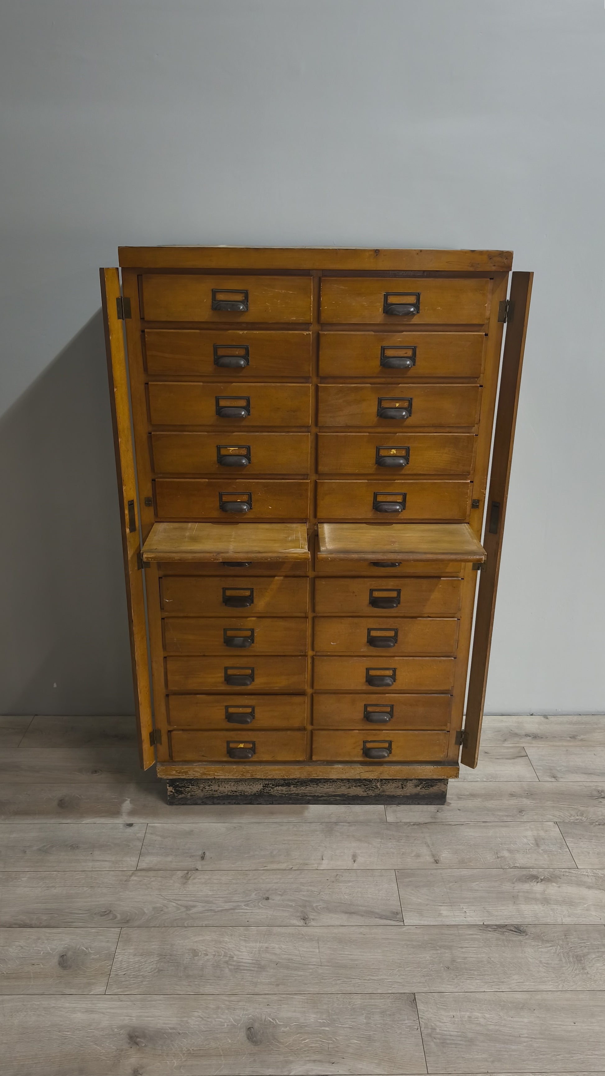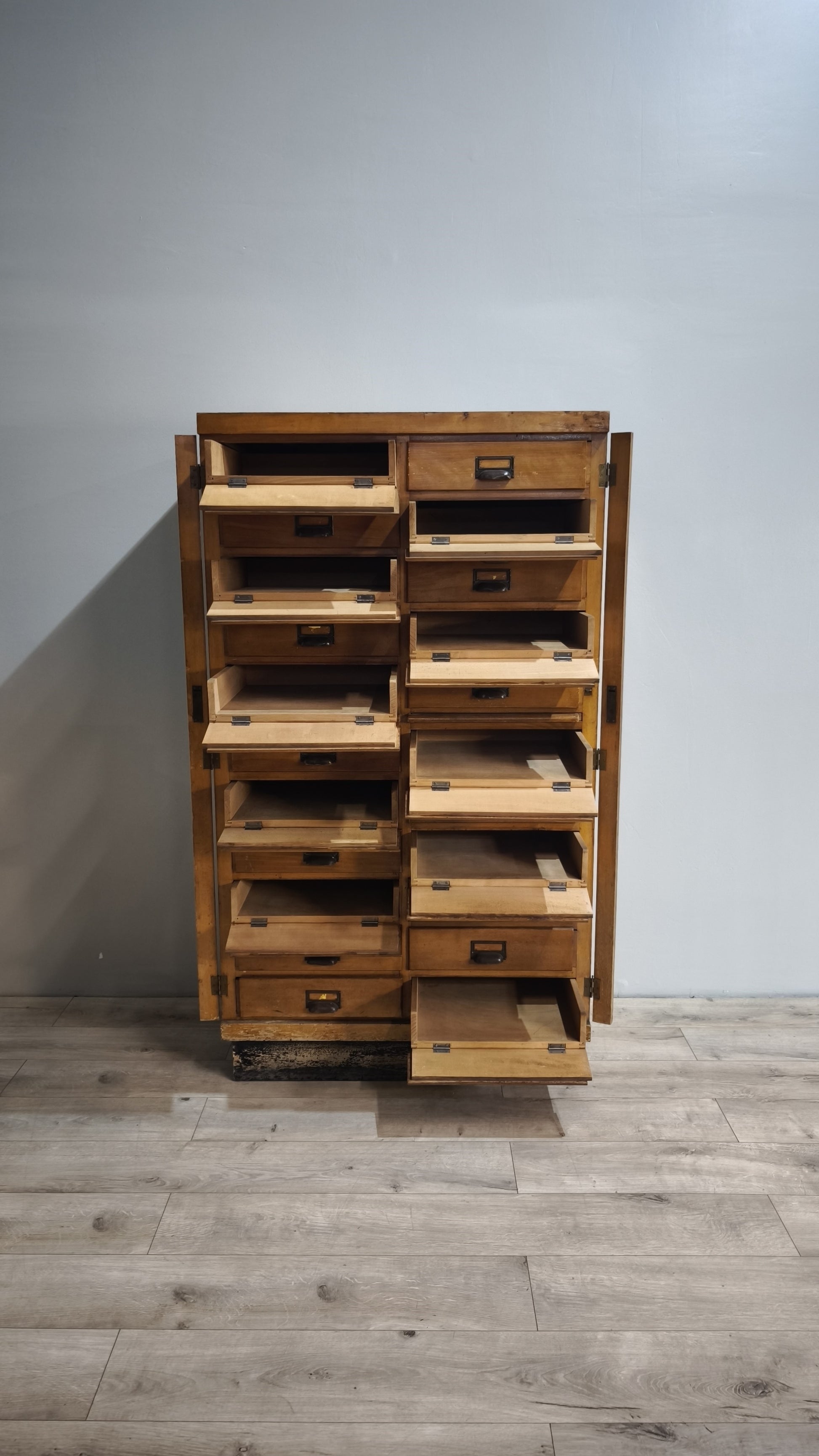Mobile archivio in legno massello composto da ventidue vani portadocumenti a ribalta e due tiretti centrali