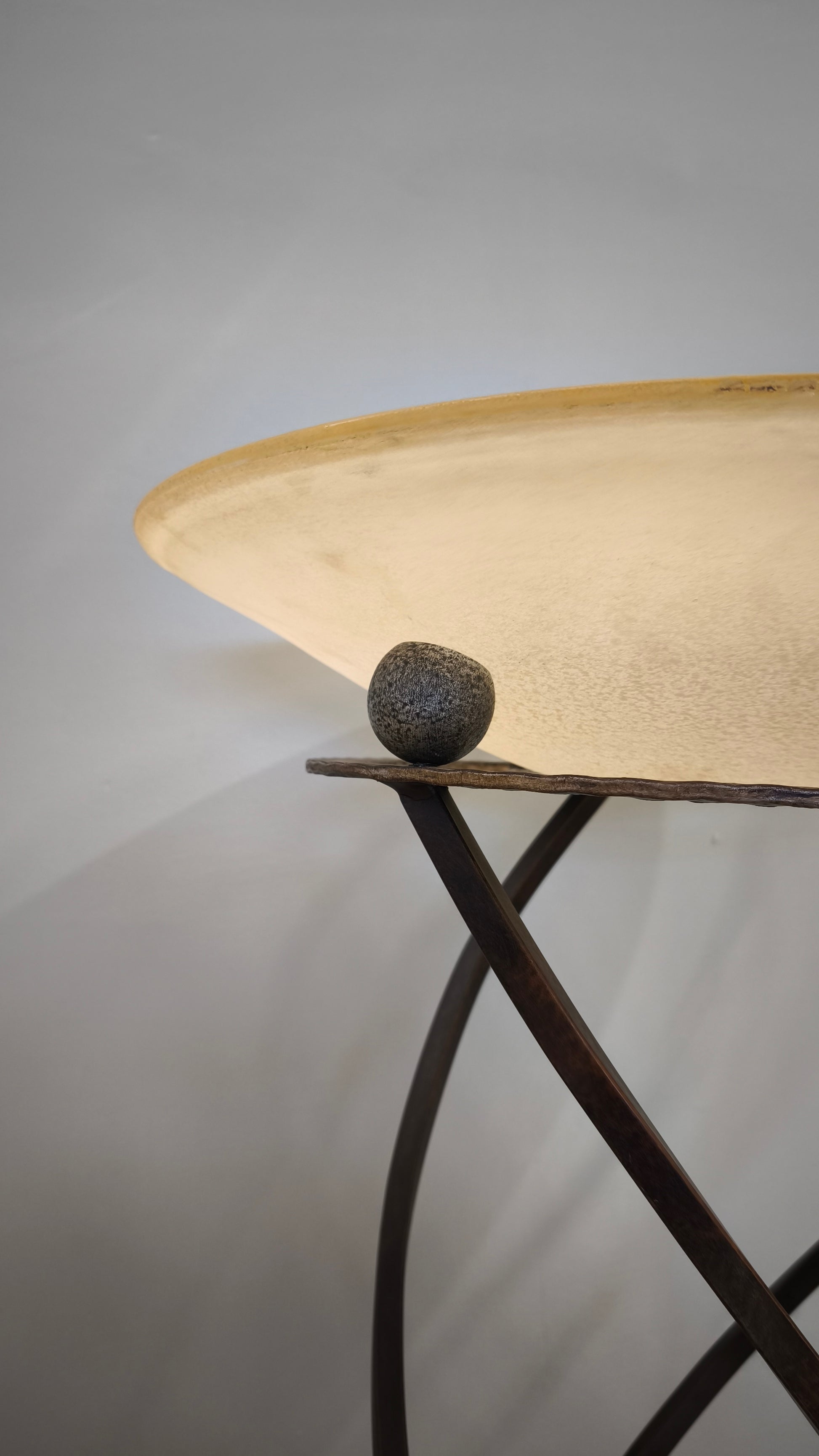 La struttura è composta da tre aste in ferro battuto intrecciate che si uniscono alla base, il cappello è in vetro