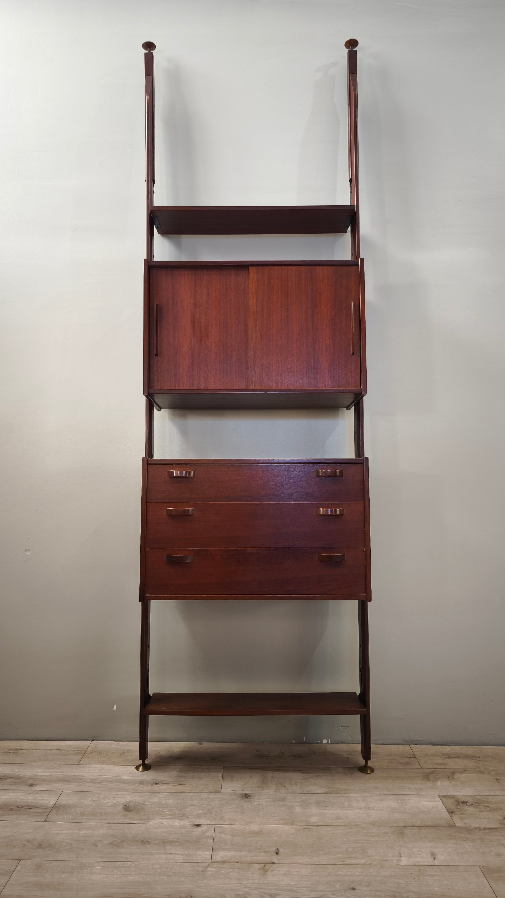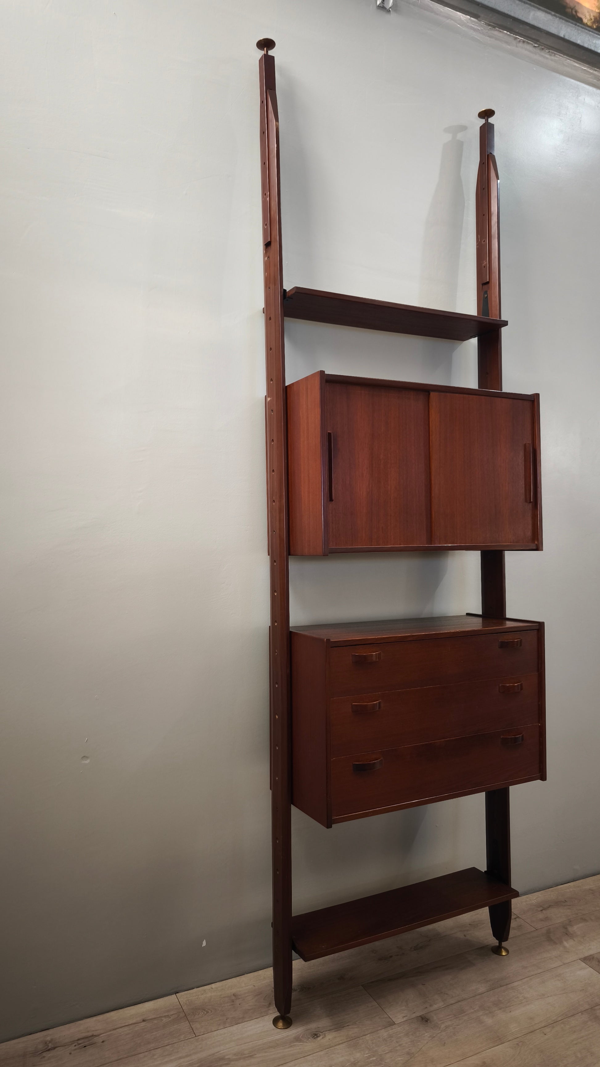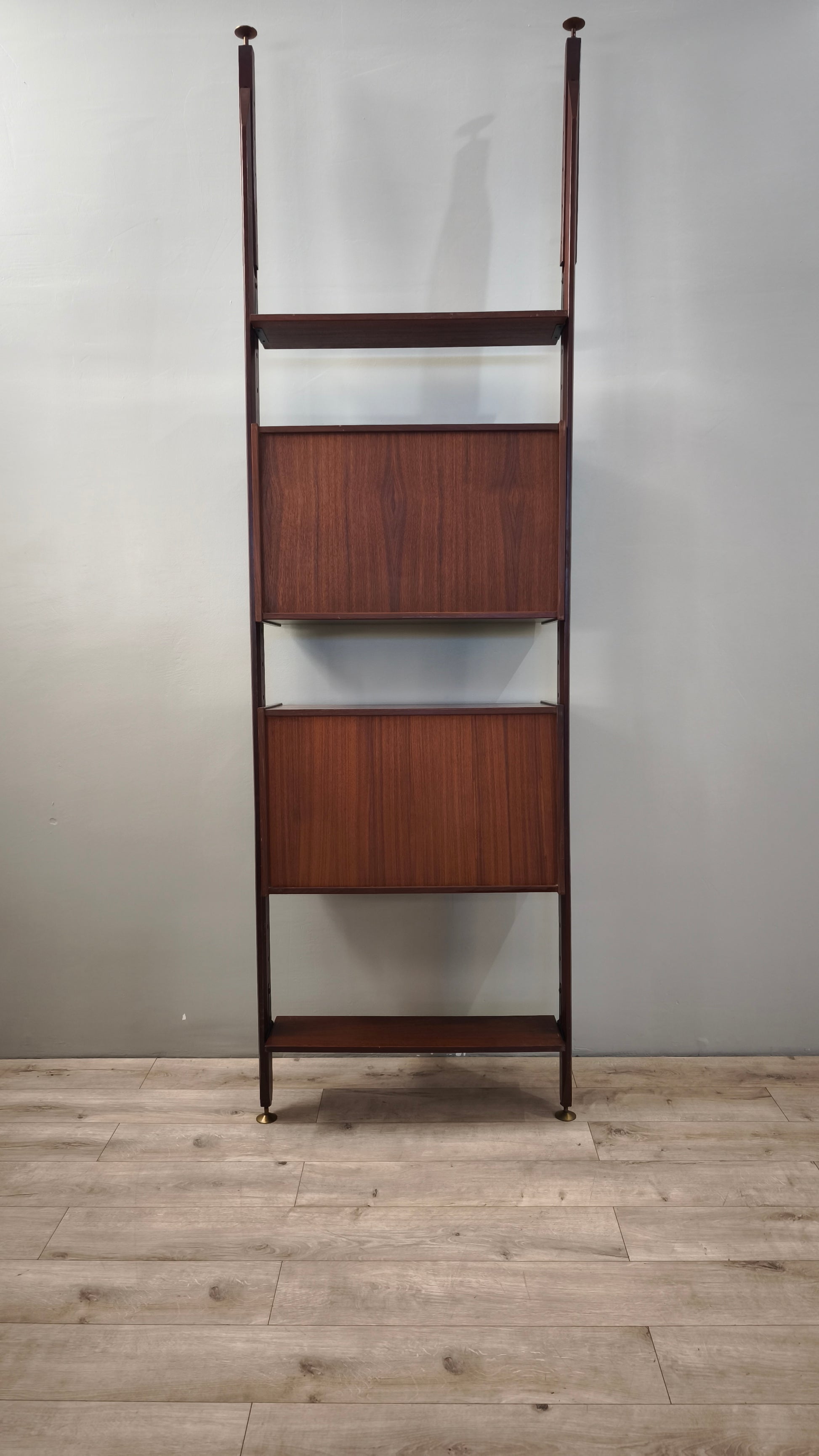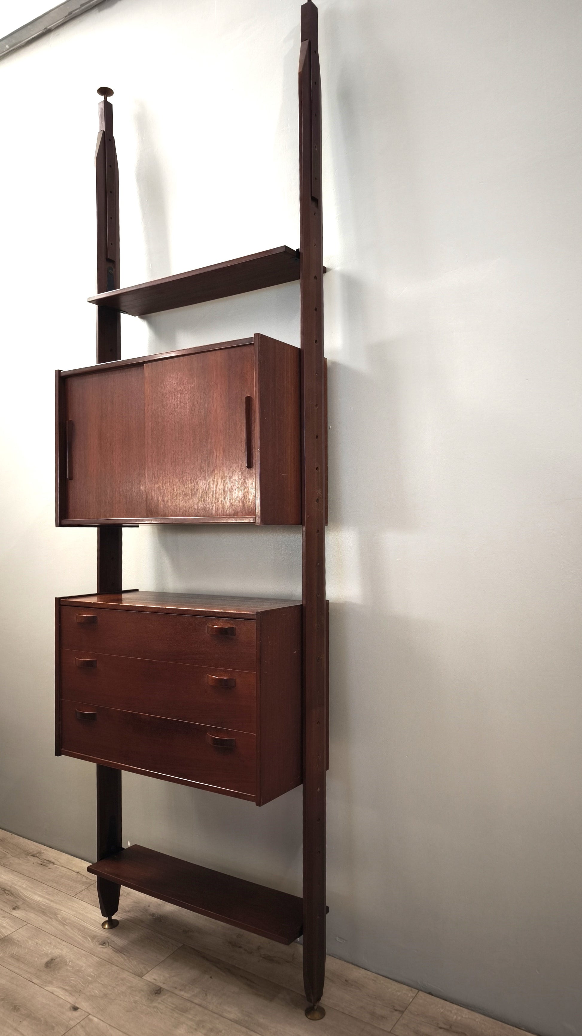 Libreria italo svedese dall'iconico design cielo terra composta da due moduli con sportelli scorrevoli e cassetti e tre ripiani a vista, l'altezza è regolabile