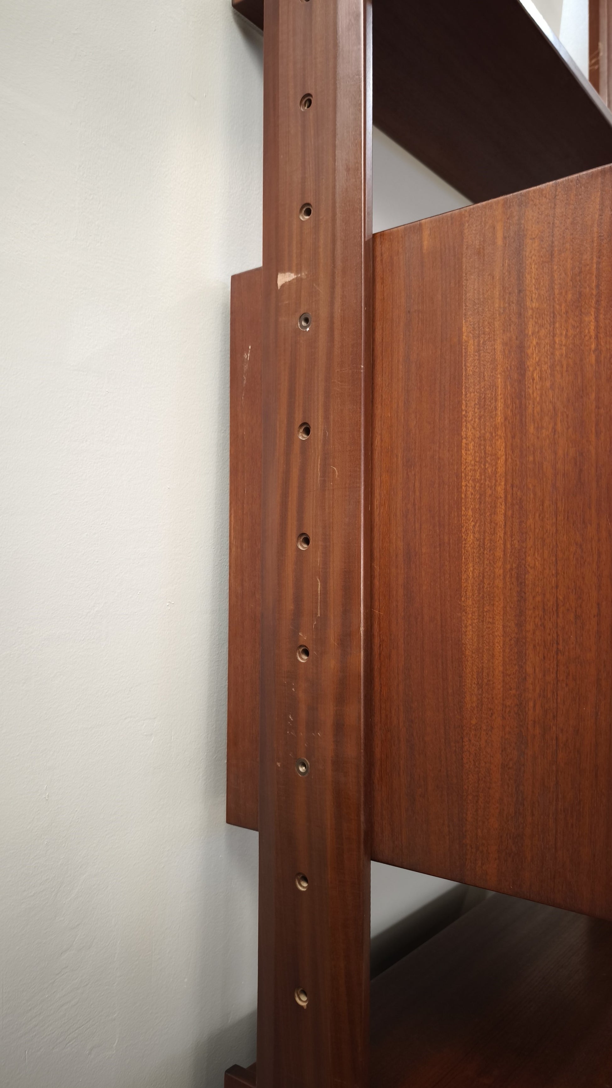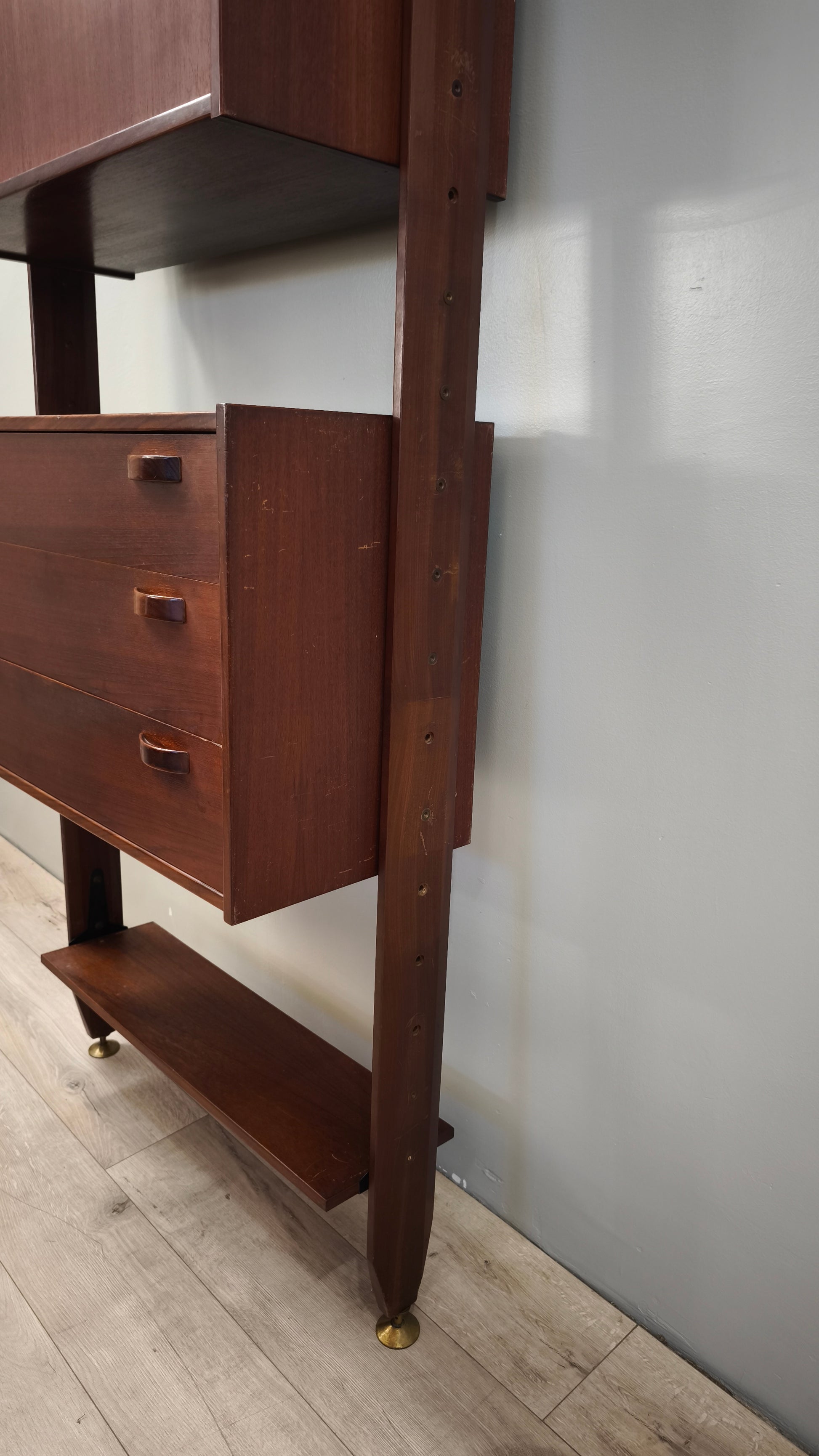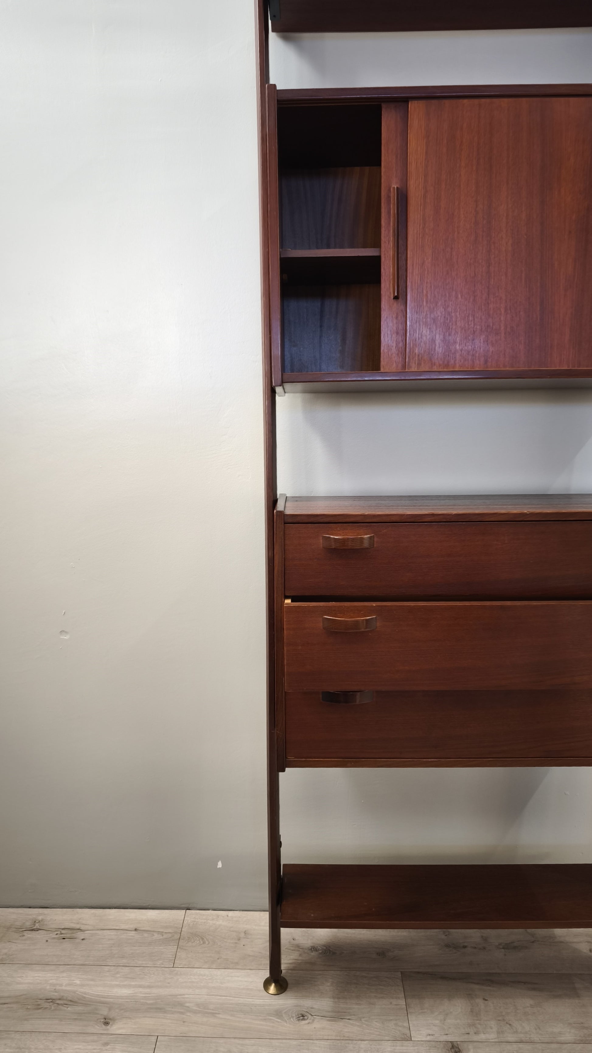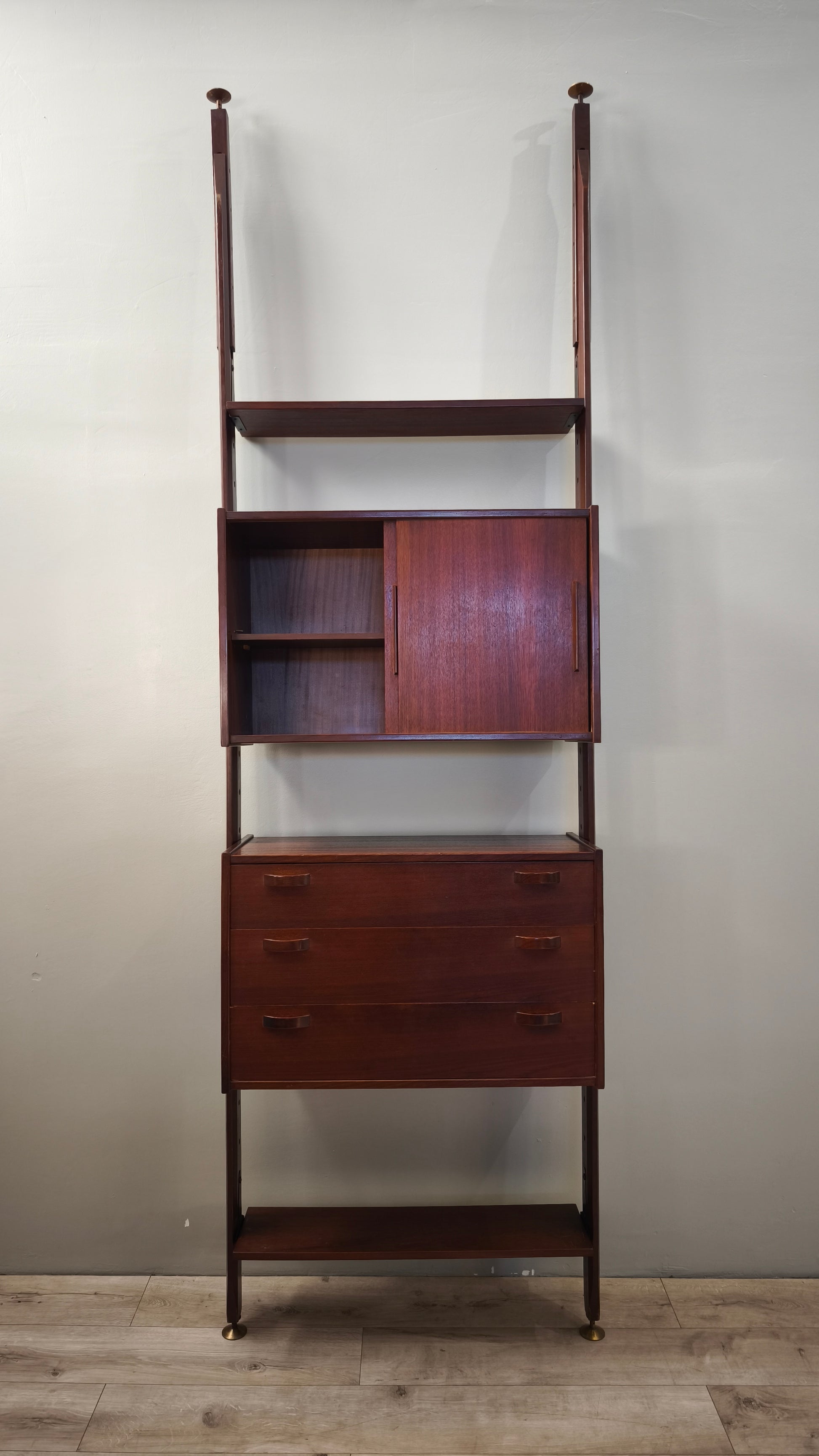 Libreria italo svedese dall'iconico design cielo terra composta da due moduli con sportelli scorrevoli e cassetti e tre ripiani a vista, l'altezza è regolabile