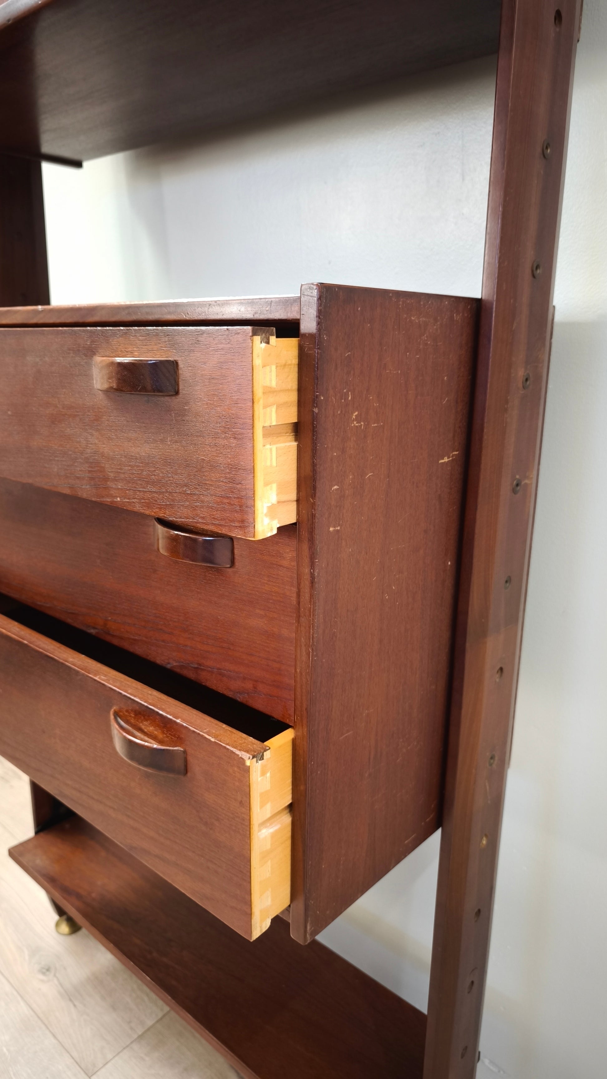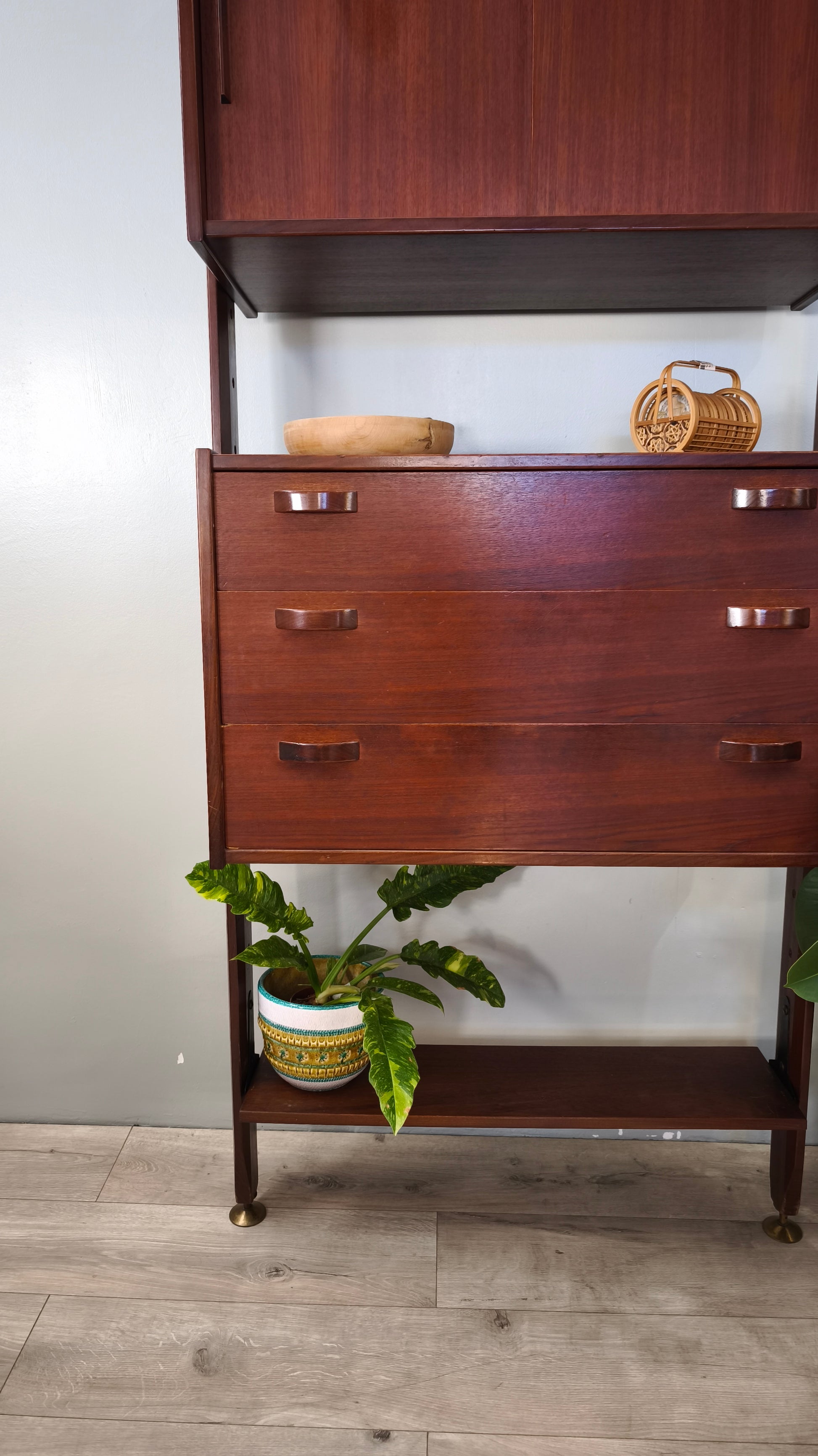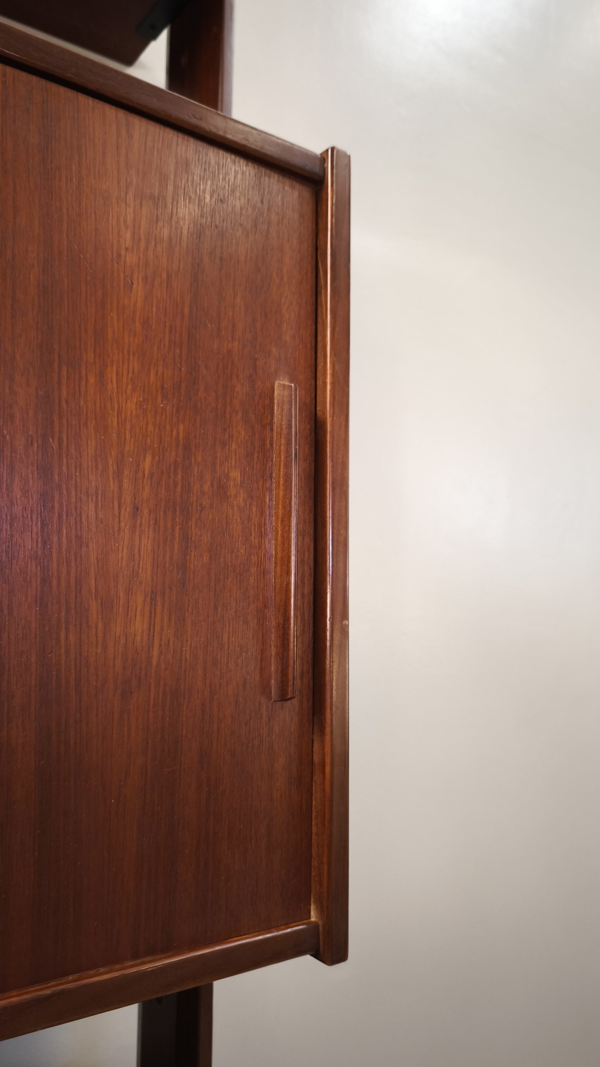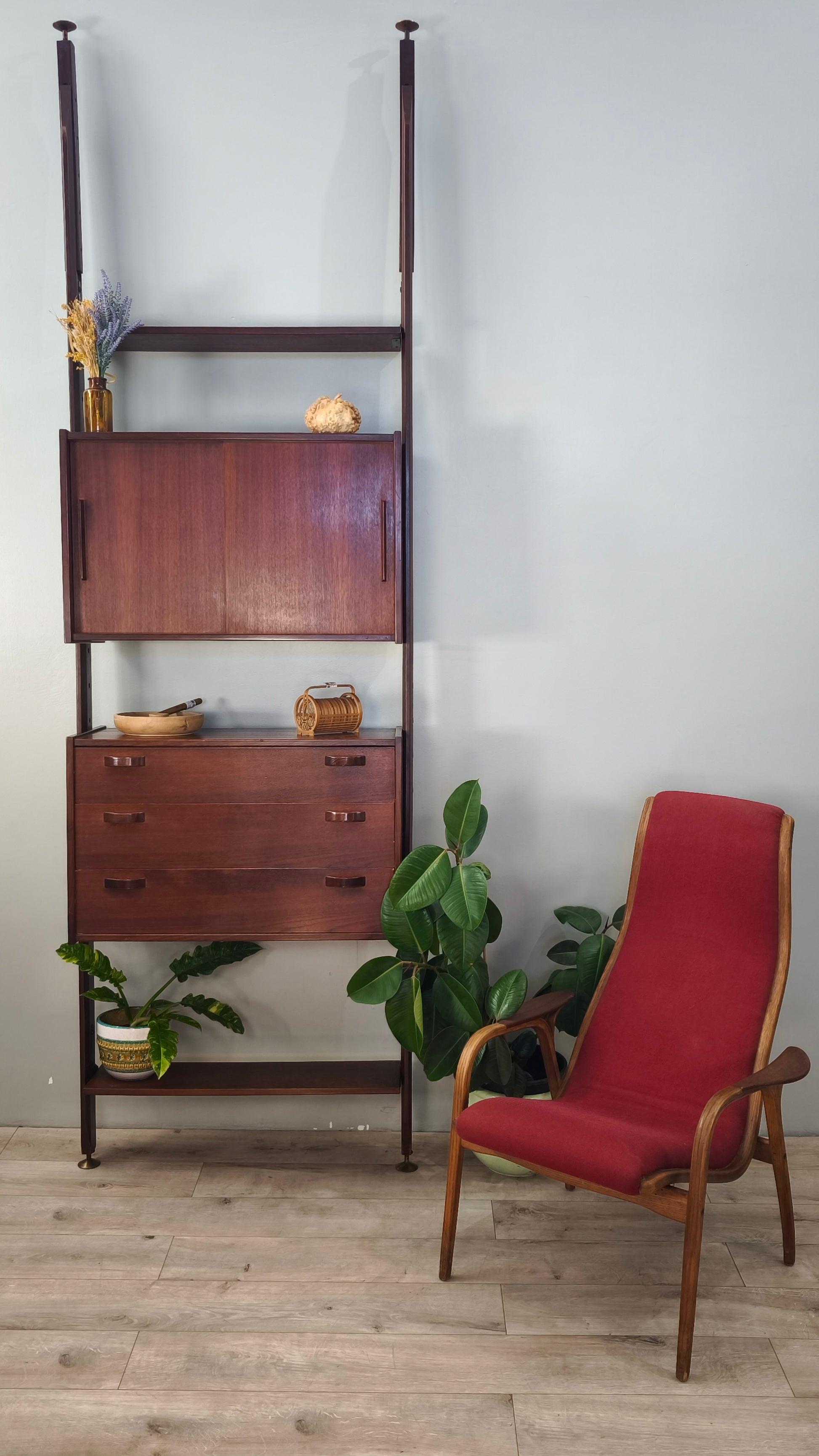 Libreria italo svedese dall'iconico design cielo terra composta da due moduli con sportelli scorrevoli e cassetti e tre ripiani a vista, l'altezza è regolabile