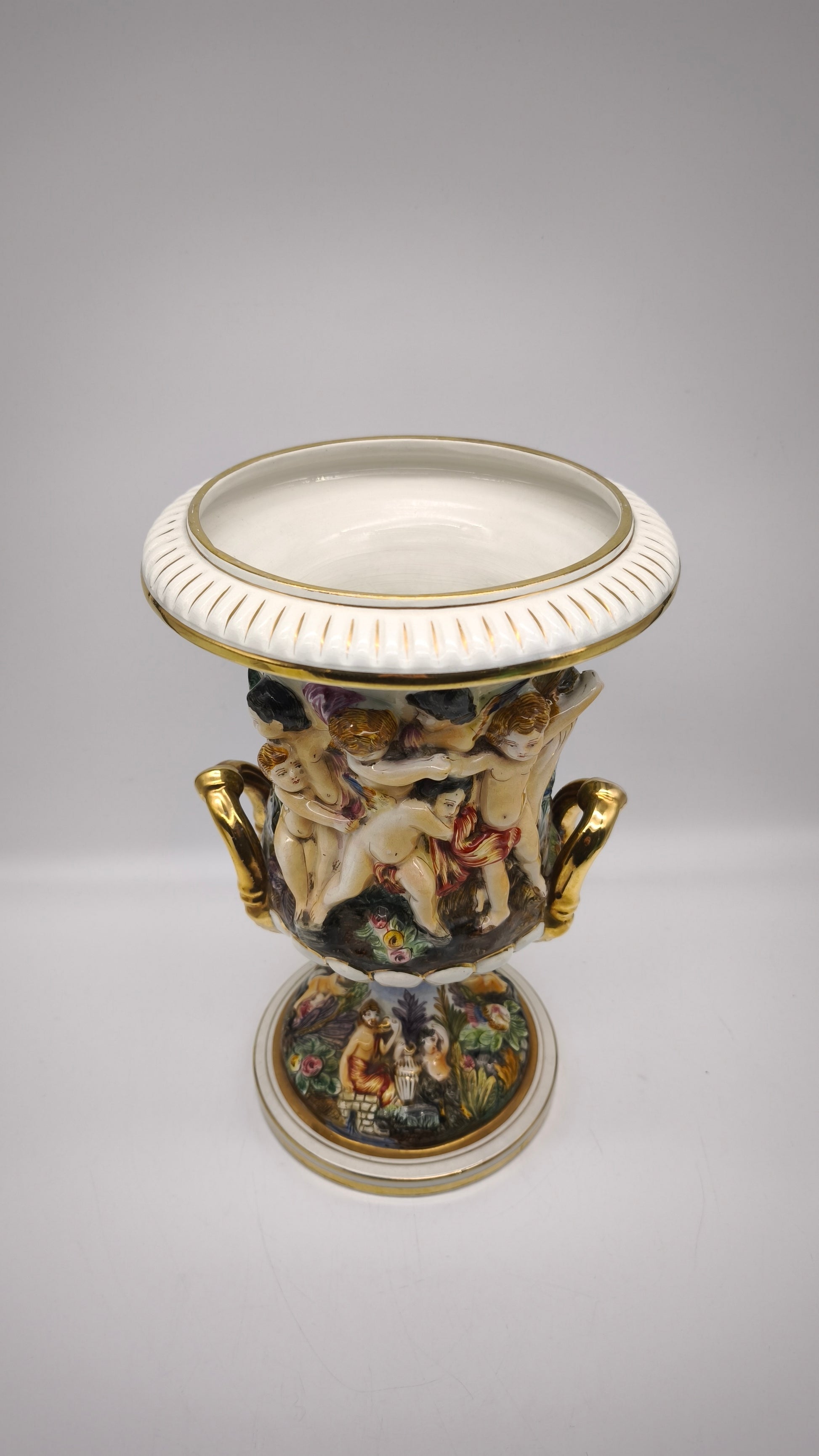 Vaso in ceramica di Capodimonte con decorazioni in rilievo, sono presenti due manici dorati