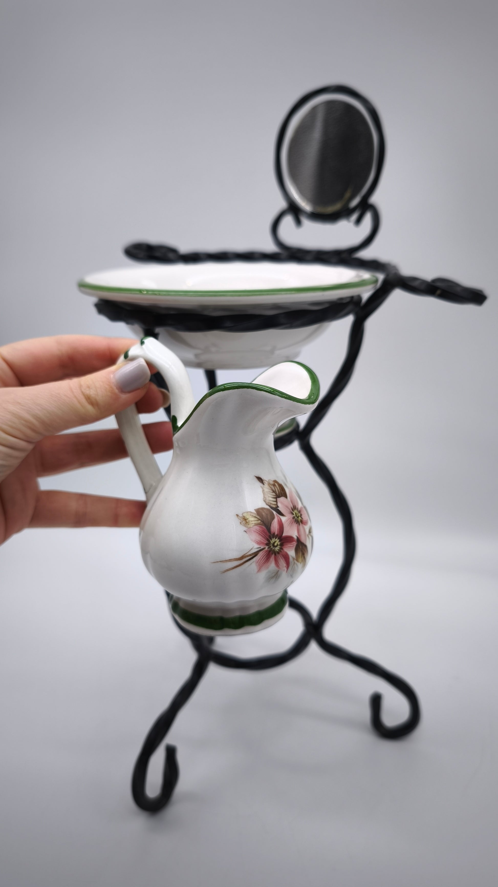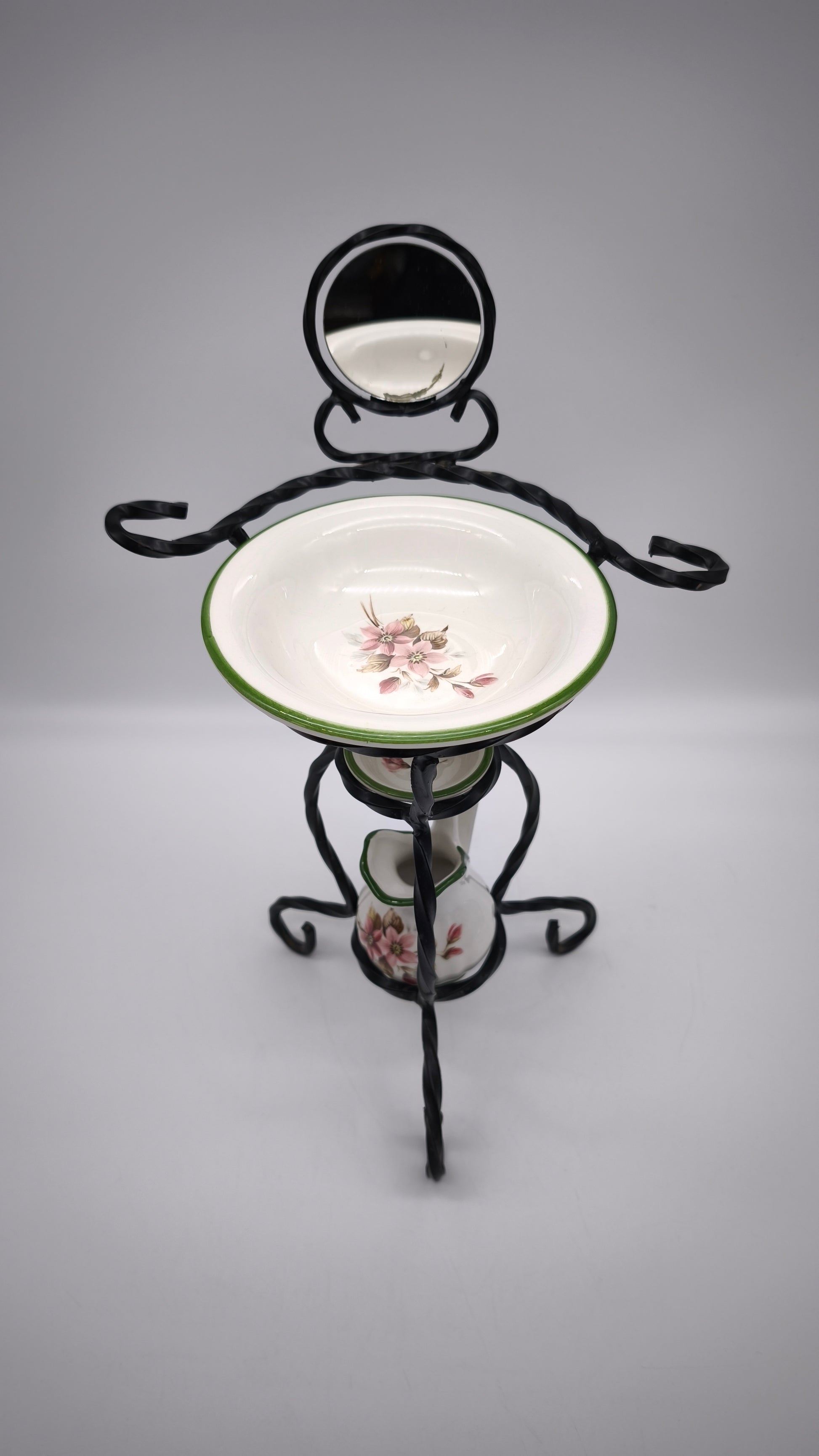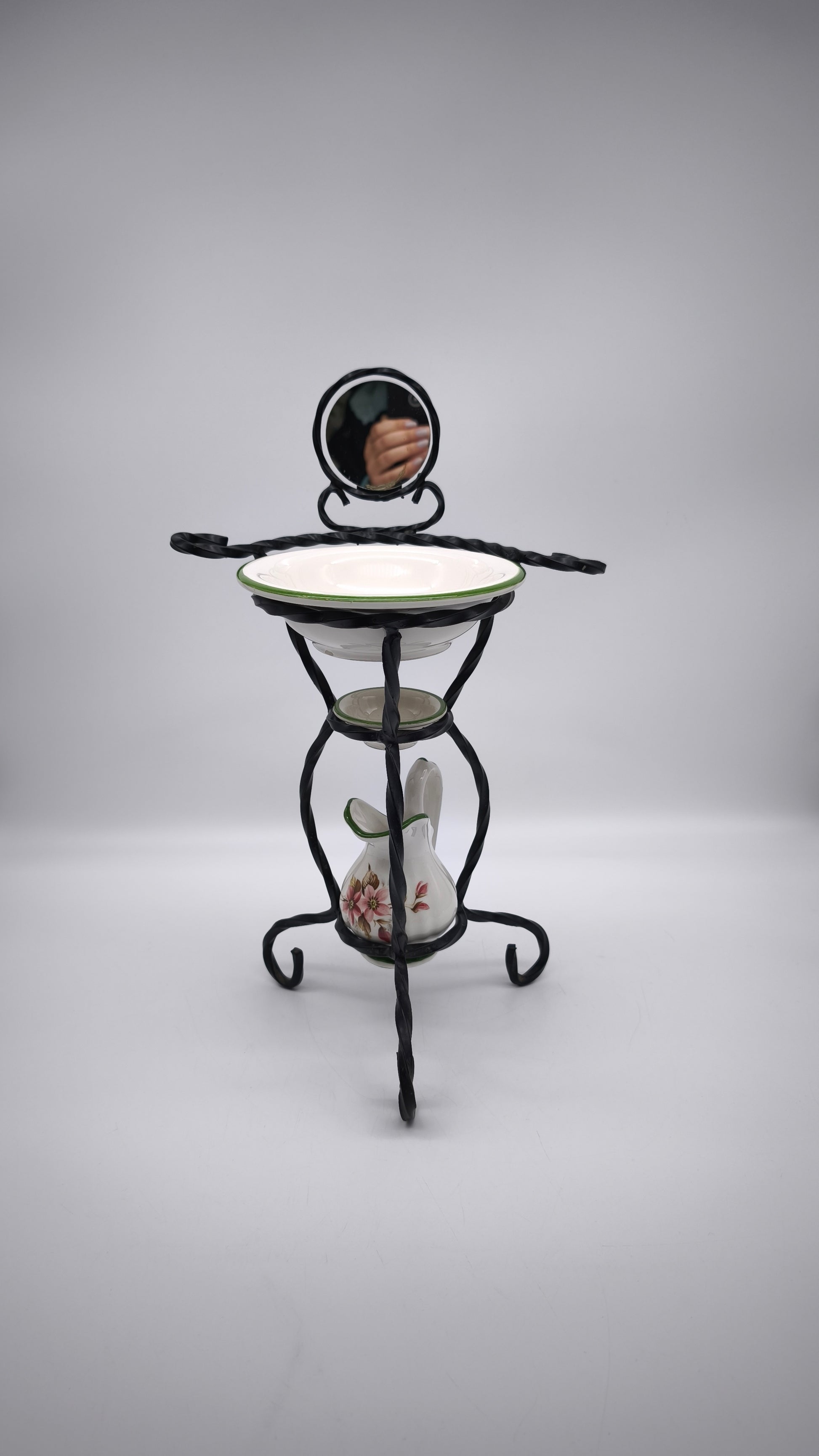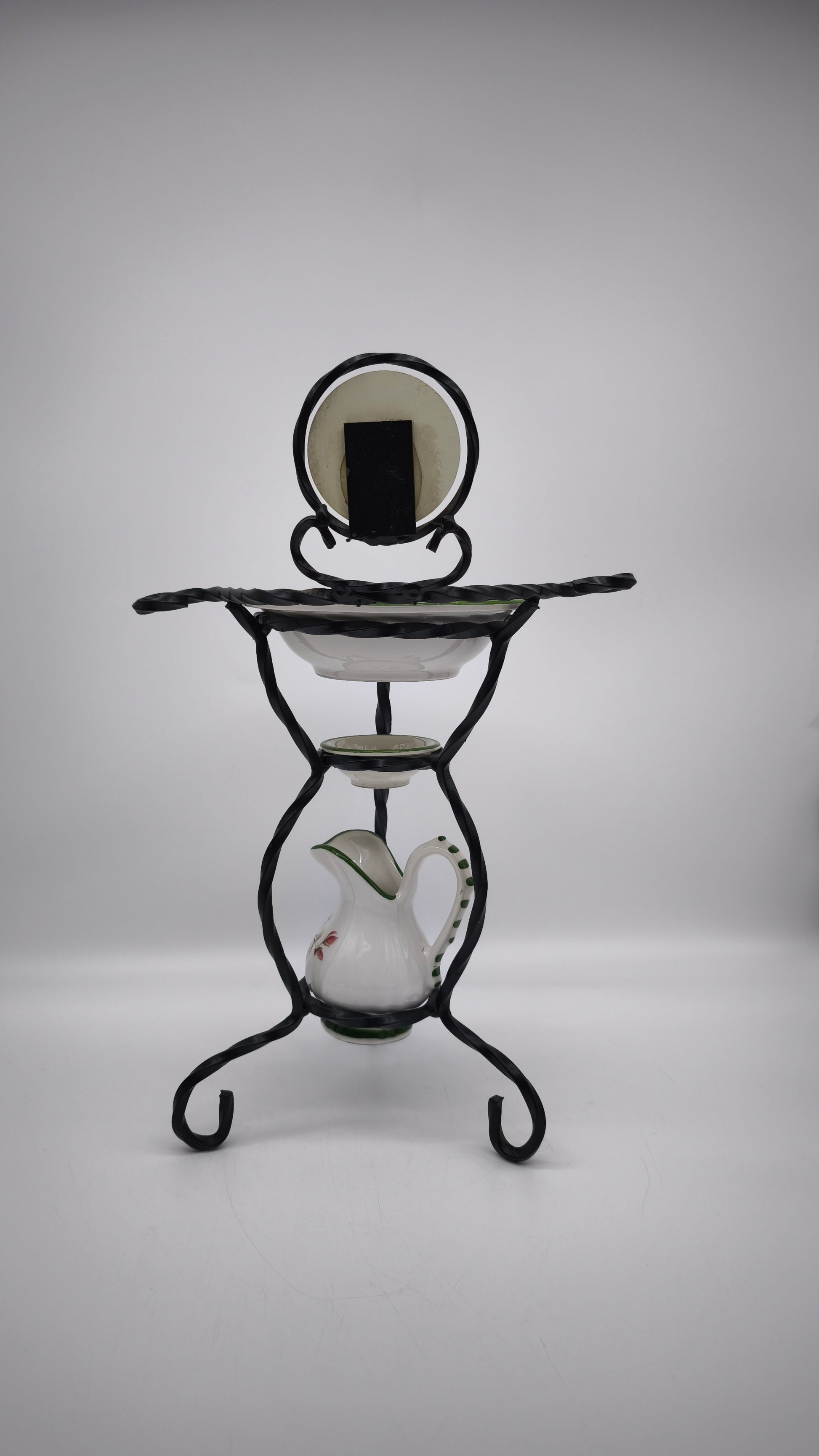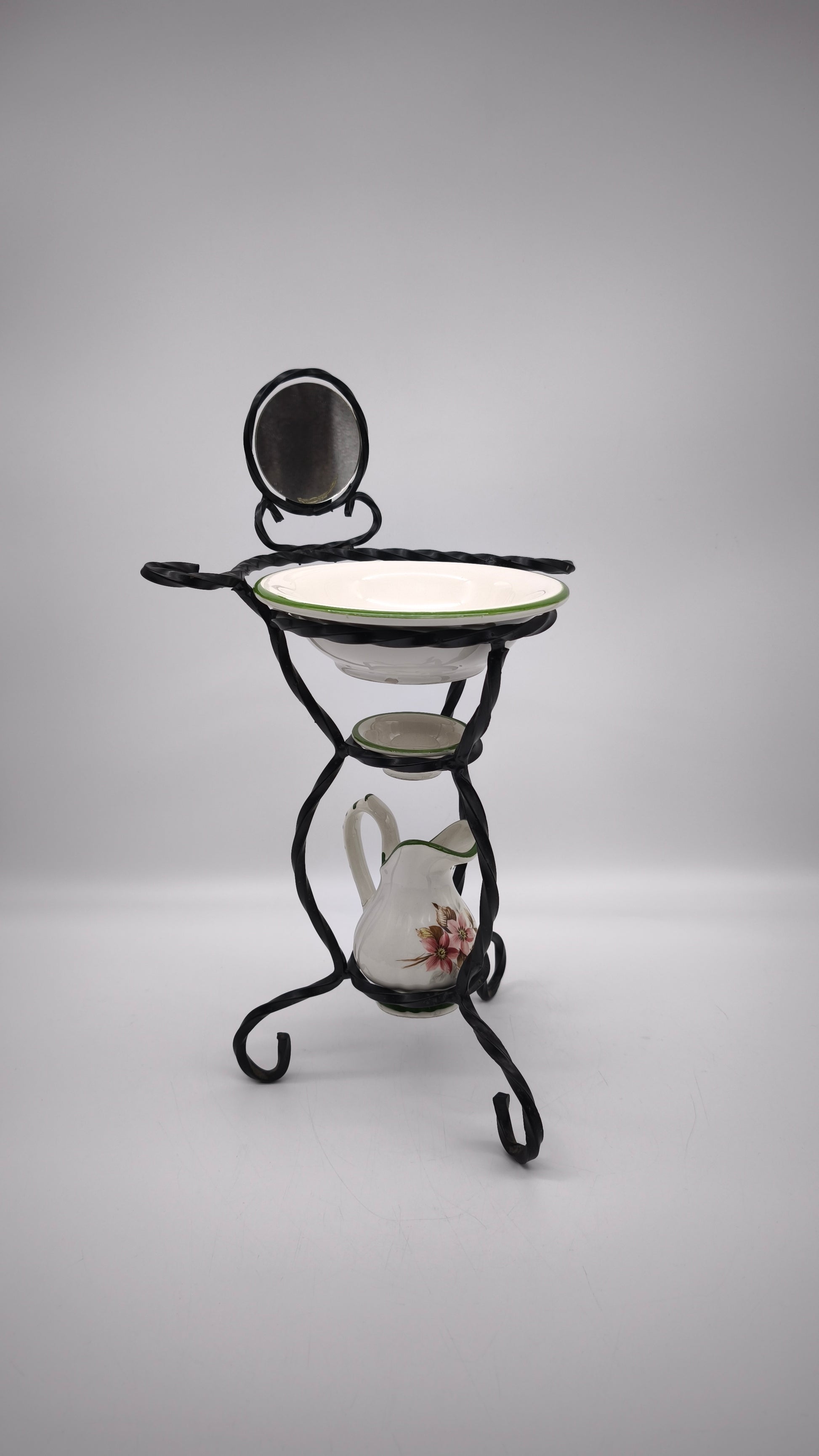 Piccolo porta catino in ferro con brocca, due ciotoline e specchietto nella parte superiore
