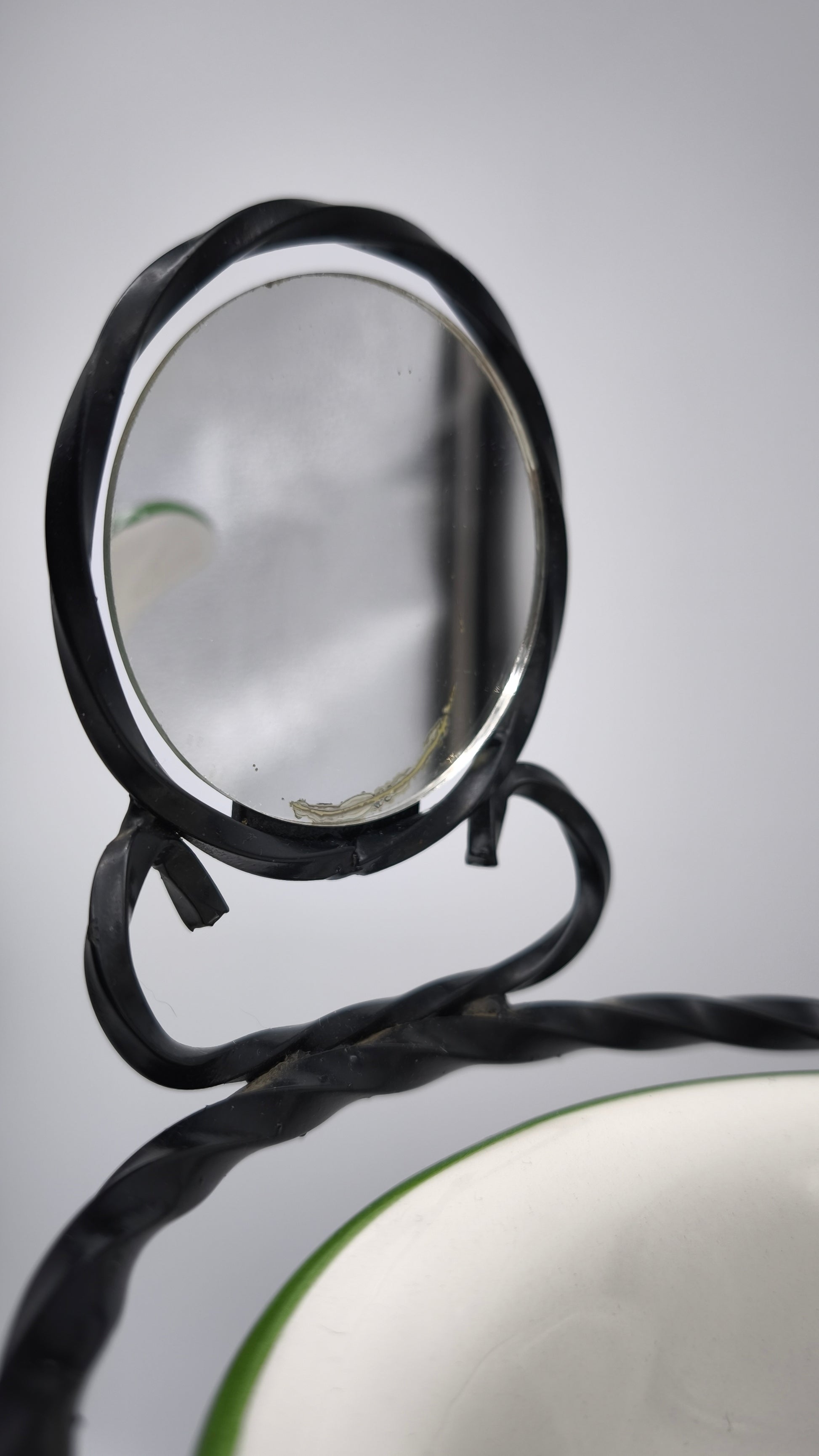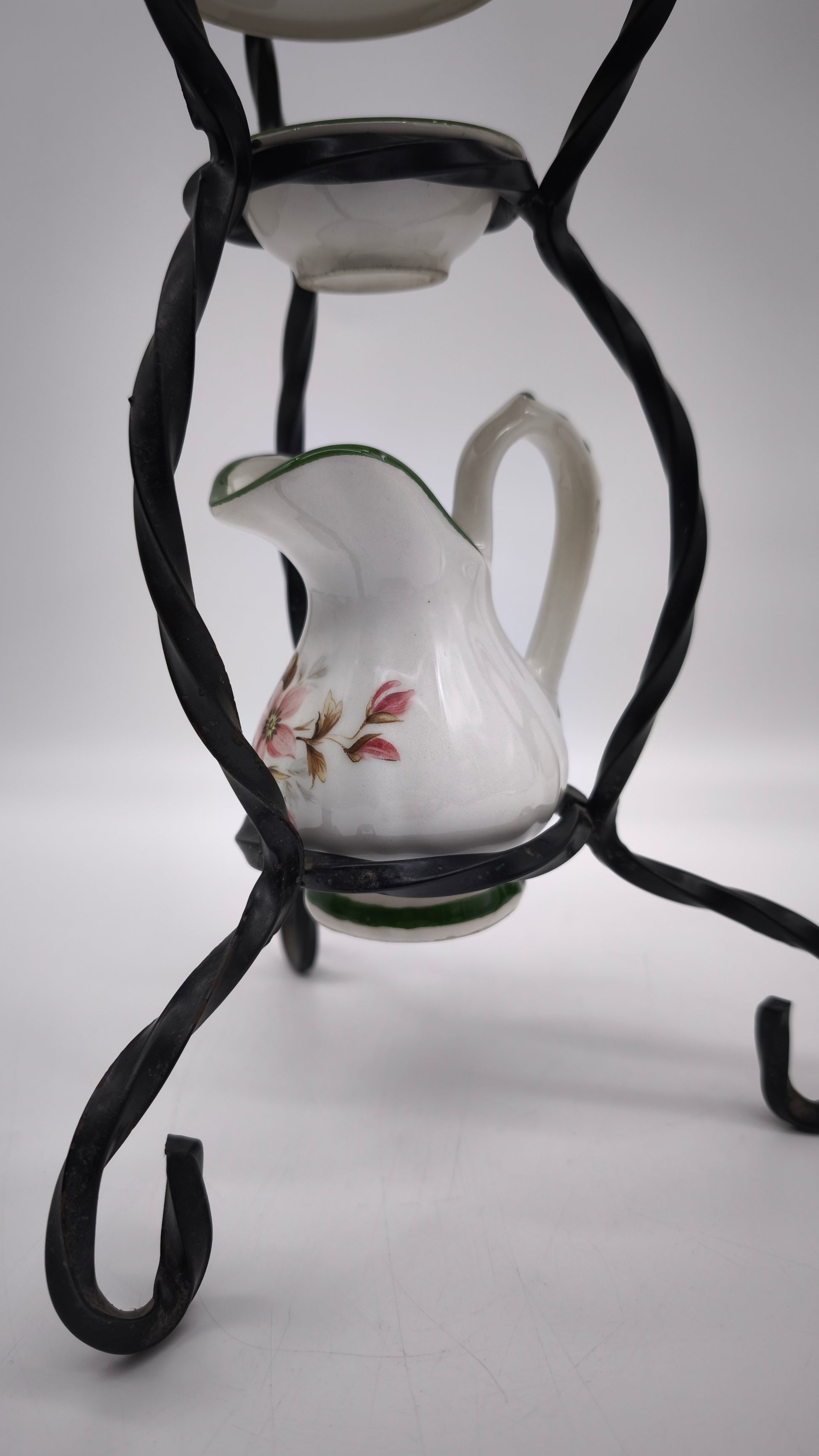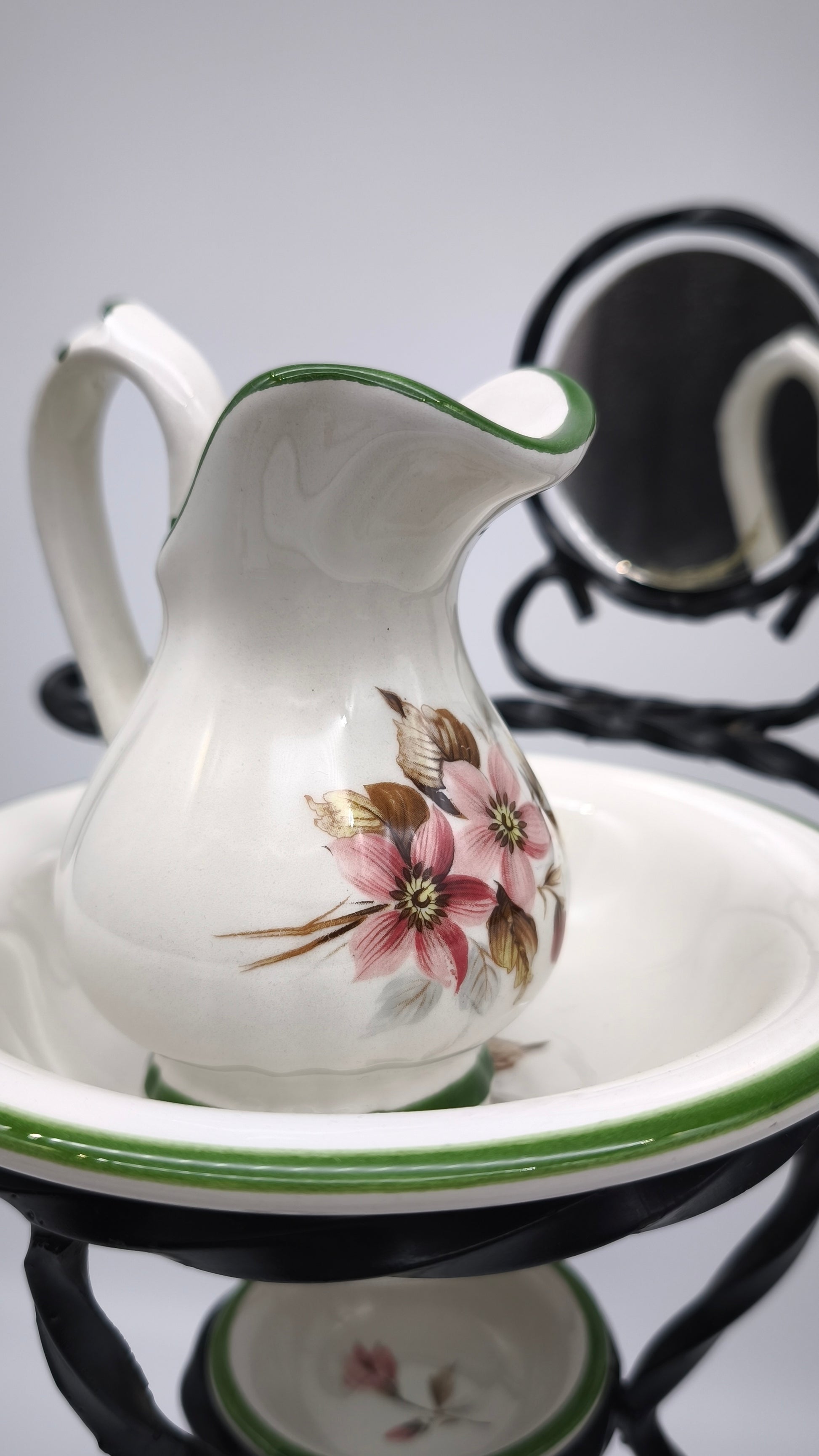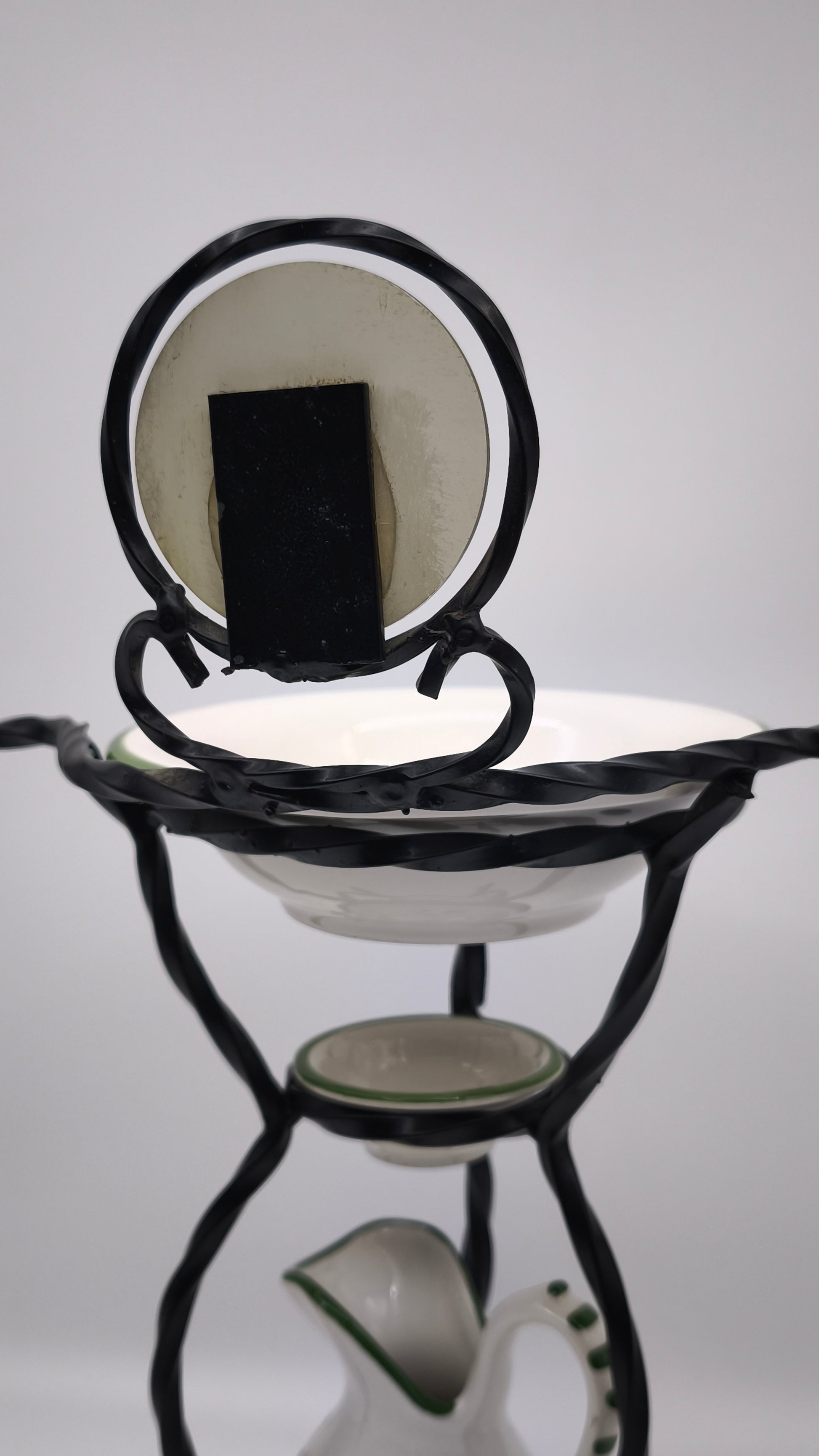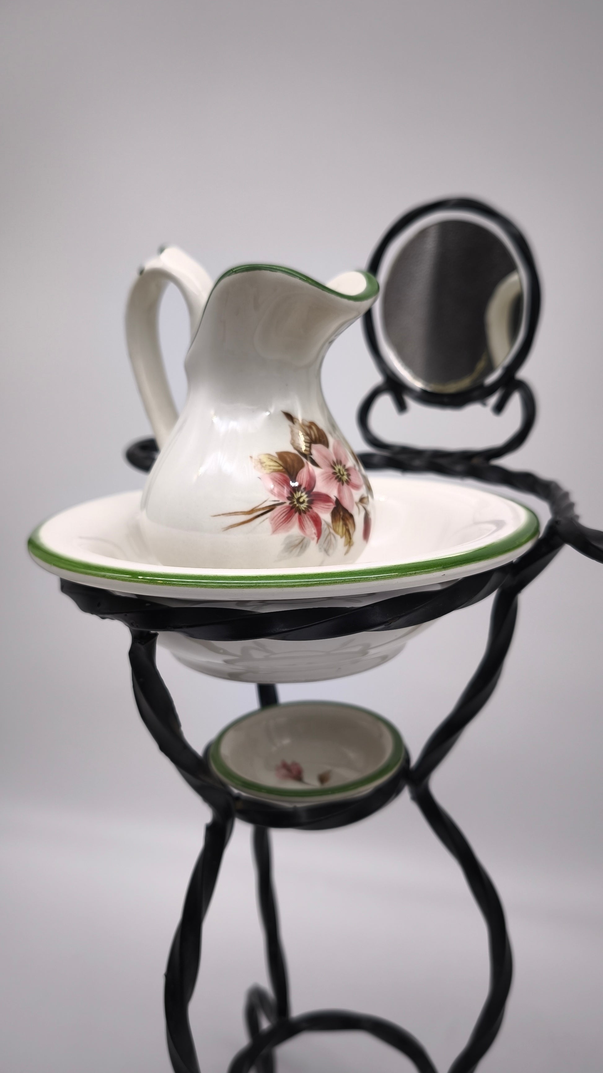 Piccolo porta catino in ferro con brocca, due ciotoline e specchietto nella parte superiore